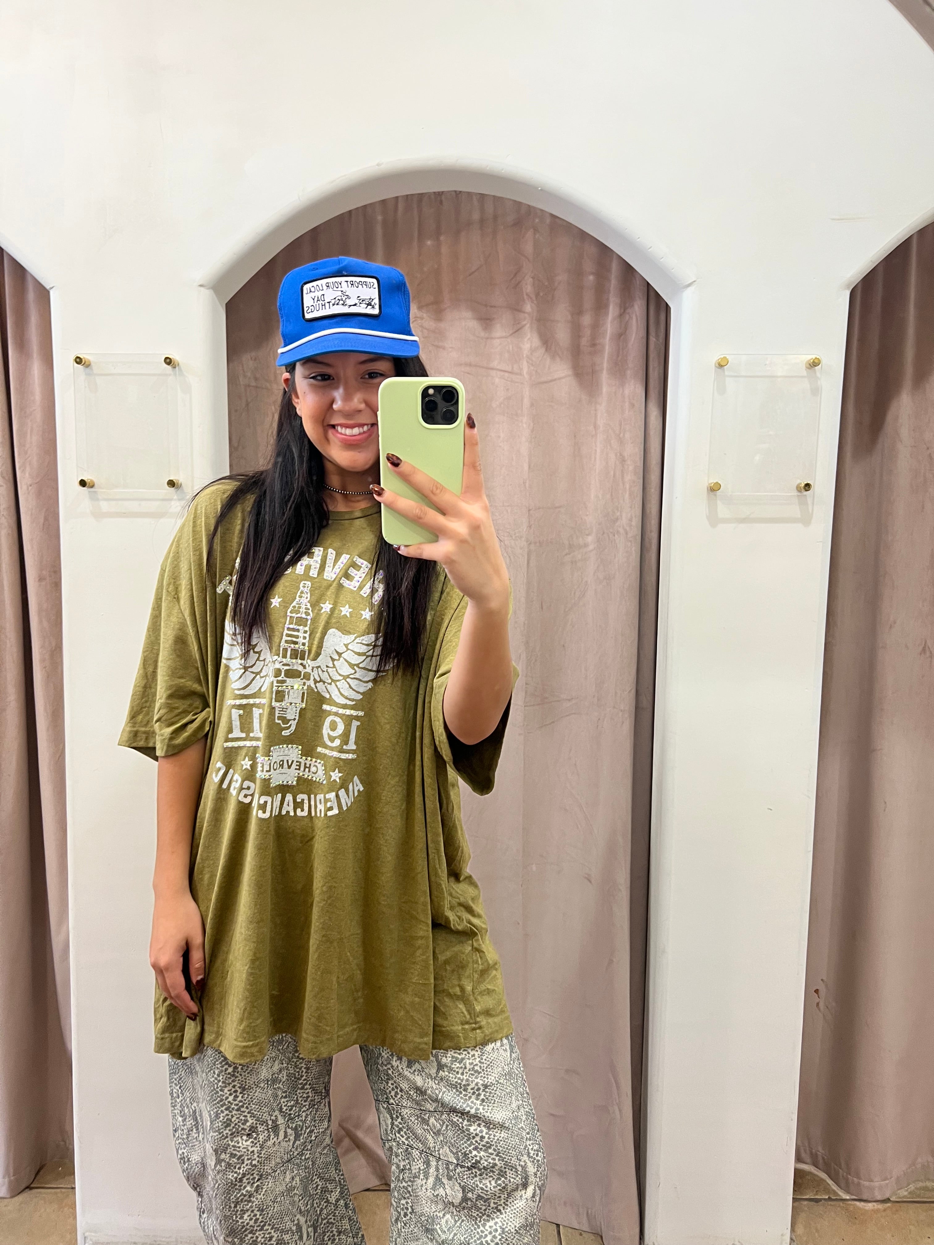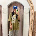 She’s a little country, a little rock n’ roll, and a whole lotta cool. This mossy green rhinestone tee is giving vintage Americana in the best way—with bold winged spark plugs, a worn-in wash, and a silhouette that’s made for lounging or living loud.