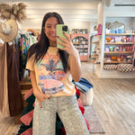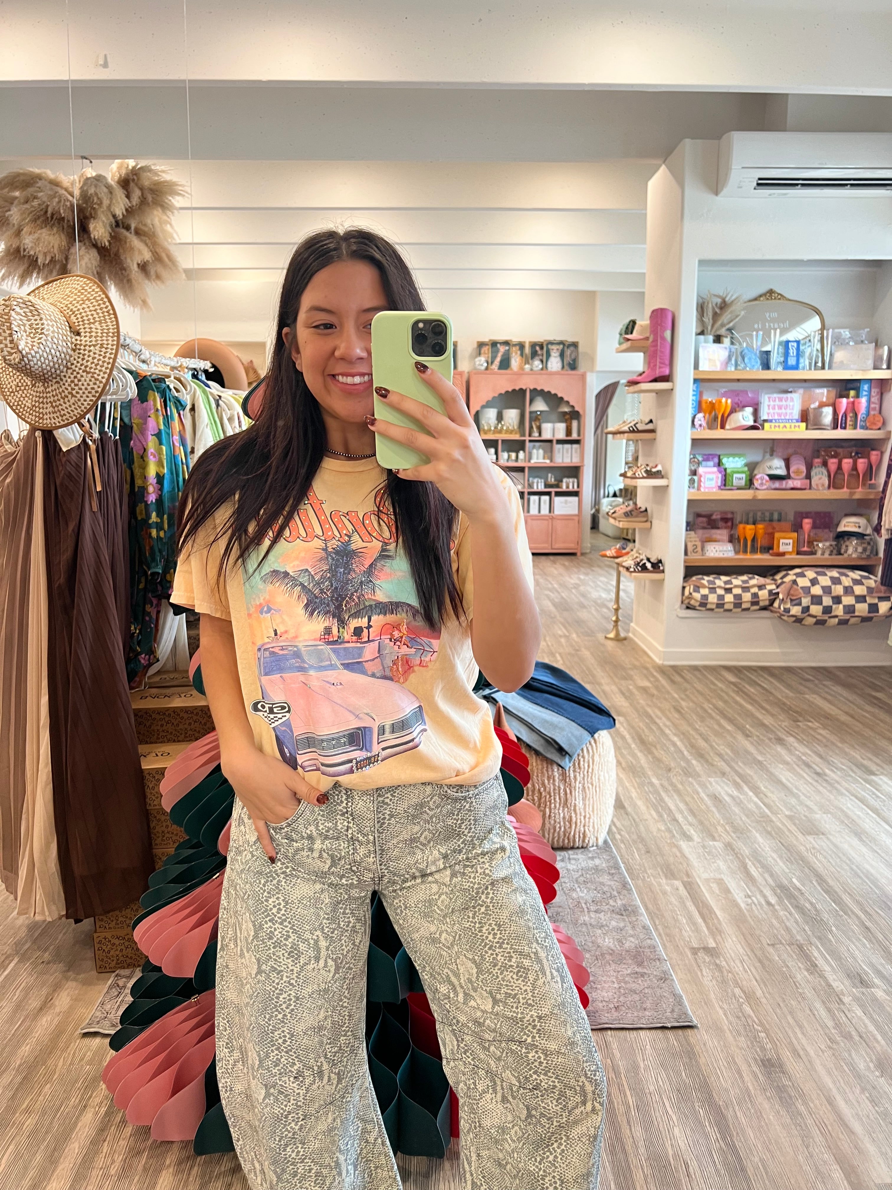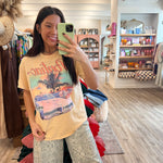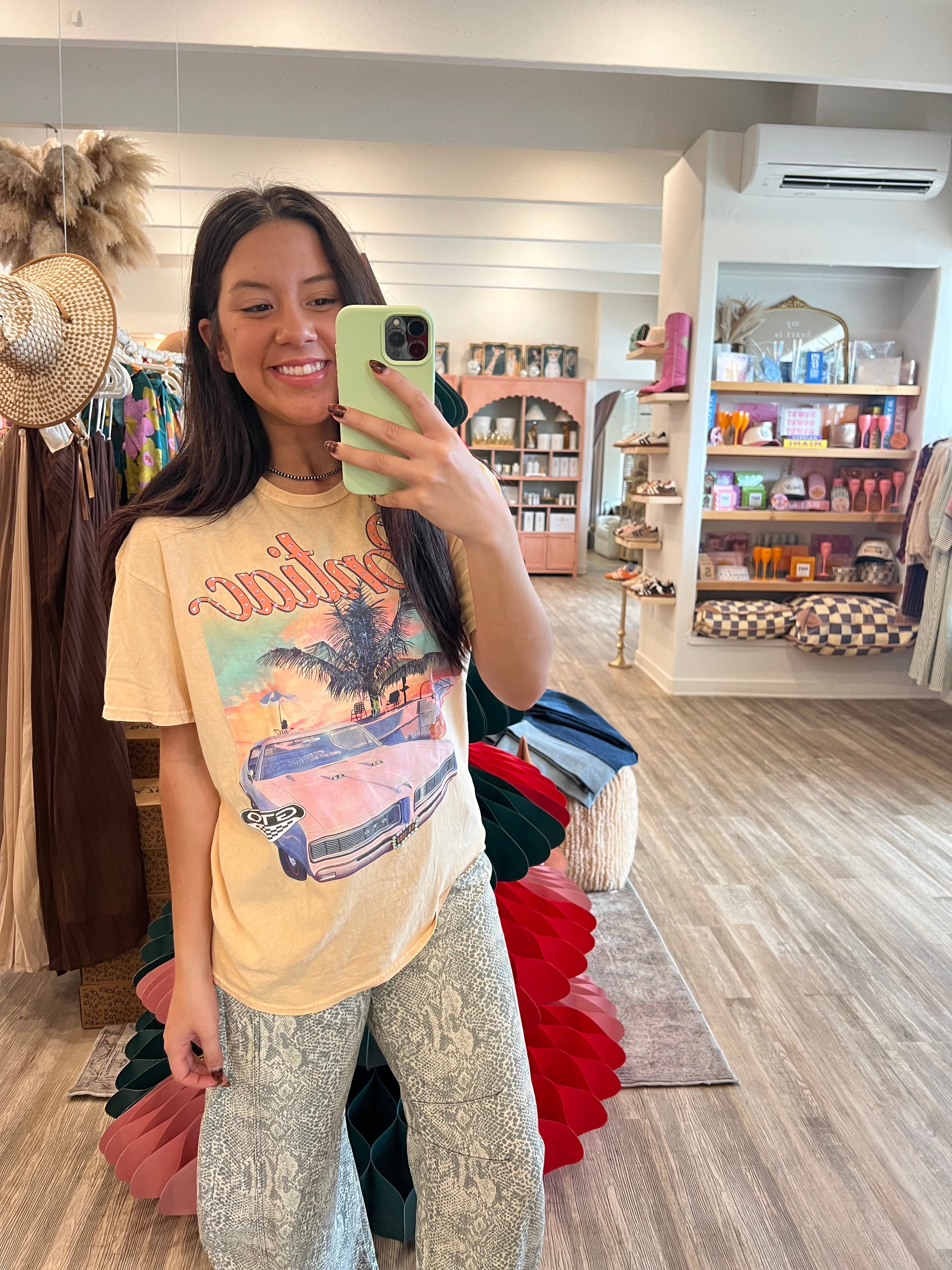 Cue the sunshine, crank the tunes, and let this tee do the talking. With dreamy pastel tones and a cruising pink Pontiac, this oversized rhinestone graphic takes you straight to a beachside boardwalk—no map required.