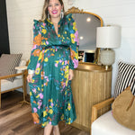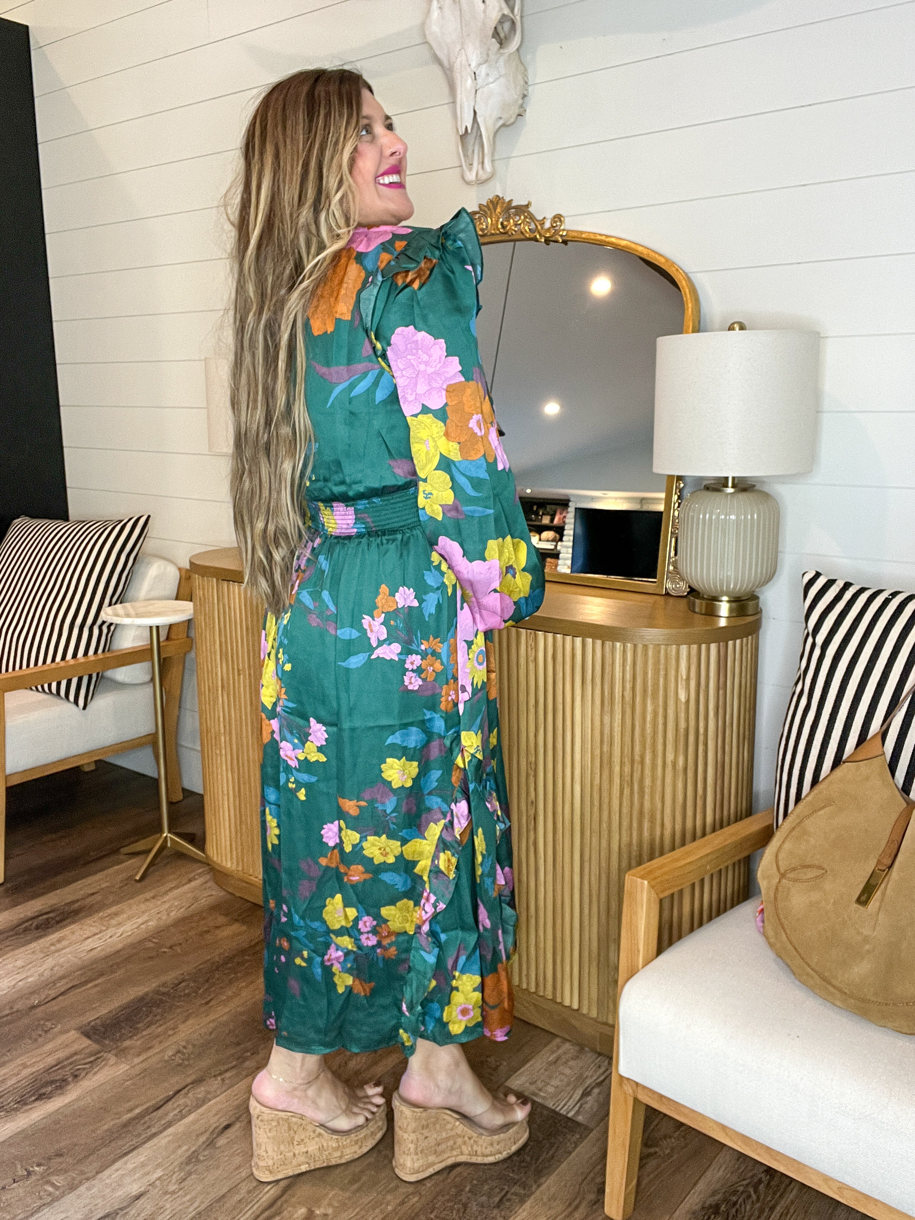 Painted Petals Floral Smocked Midi Dress - Emerald