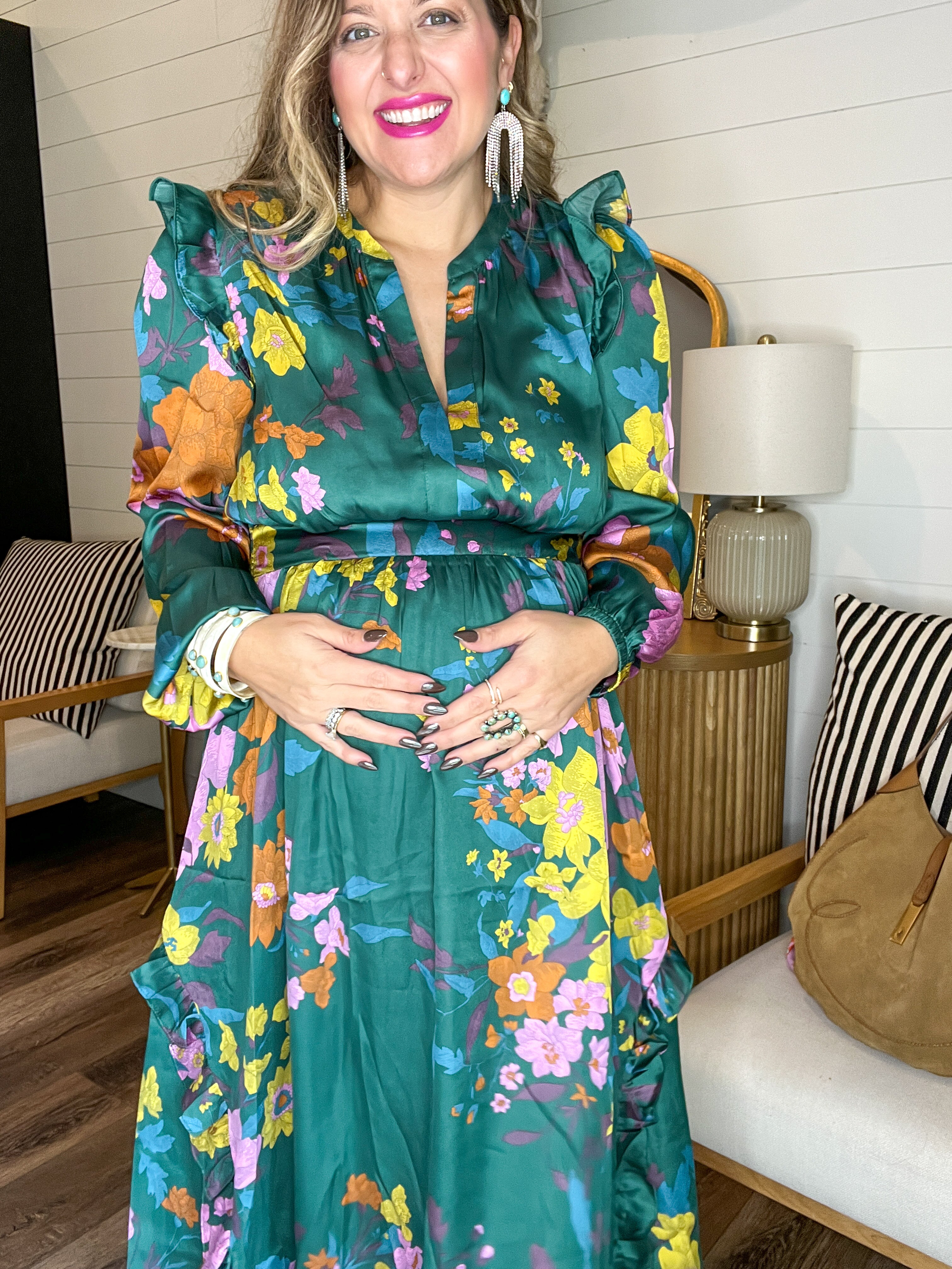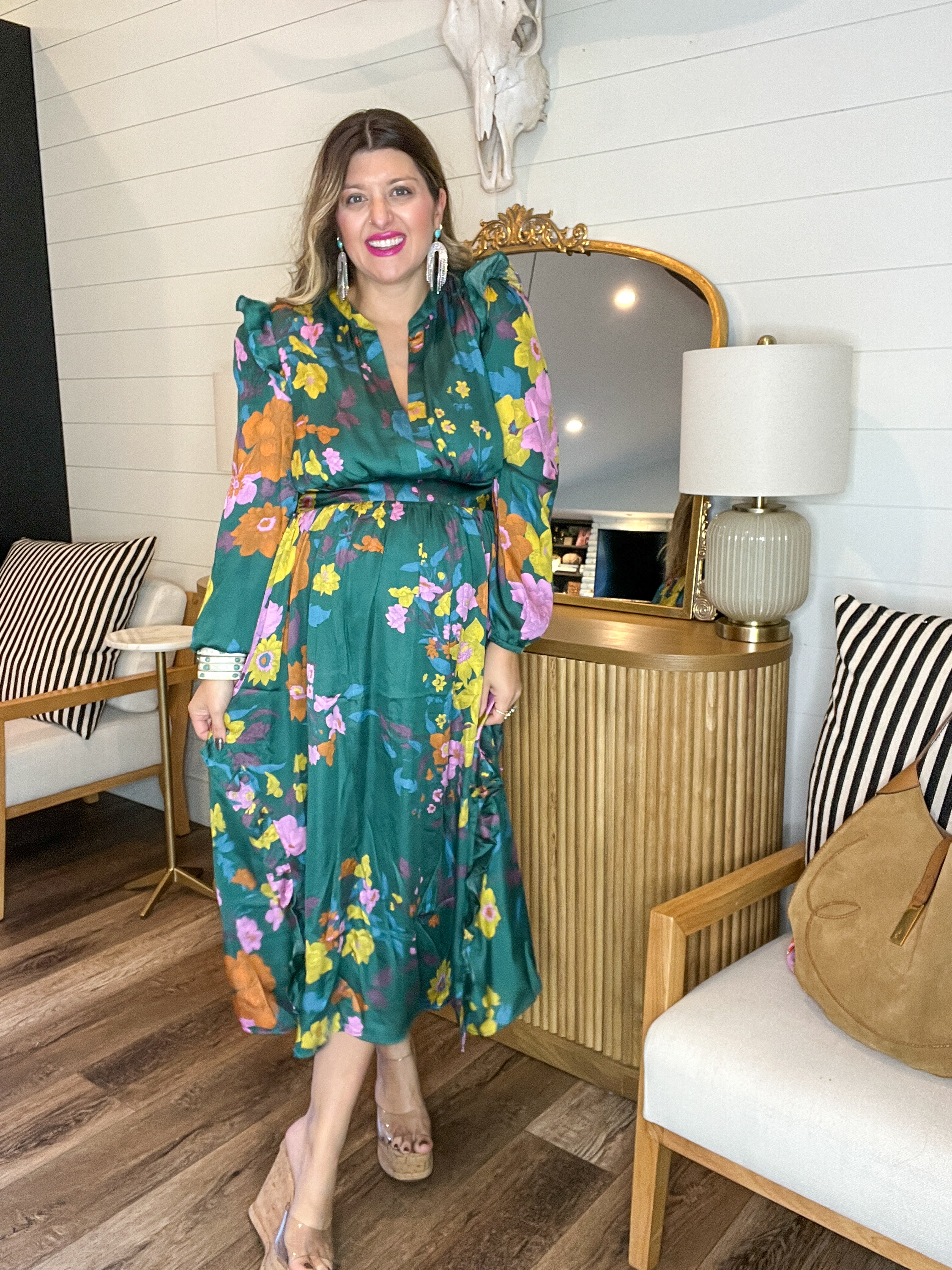 Brushstrokes in bloom. This jewel-toned floral dress feels like a wearable painting-romantic, saturated, + totally swoon-worthy. With puffed sleeves, a flattering split neckline, smocked back, + soft ruffle hem, it's made for moments where you want to look effortless + unforgettable.