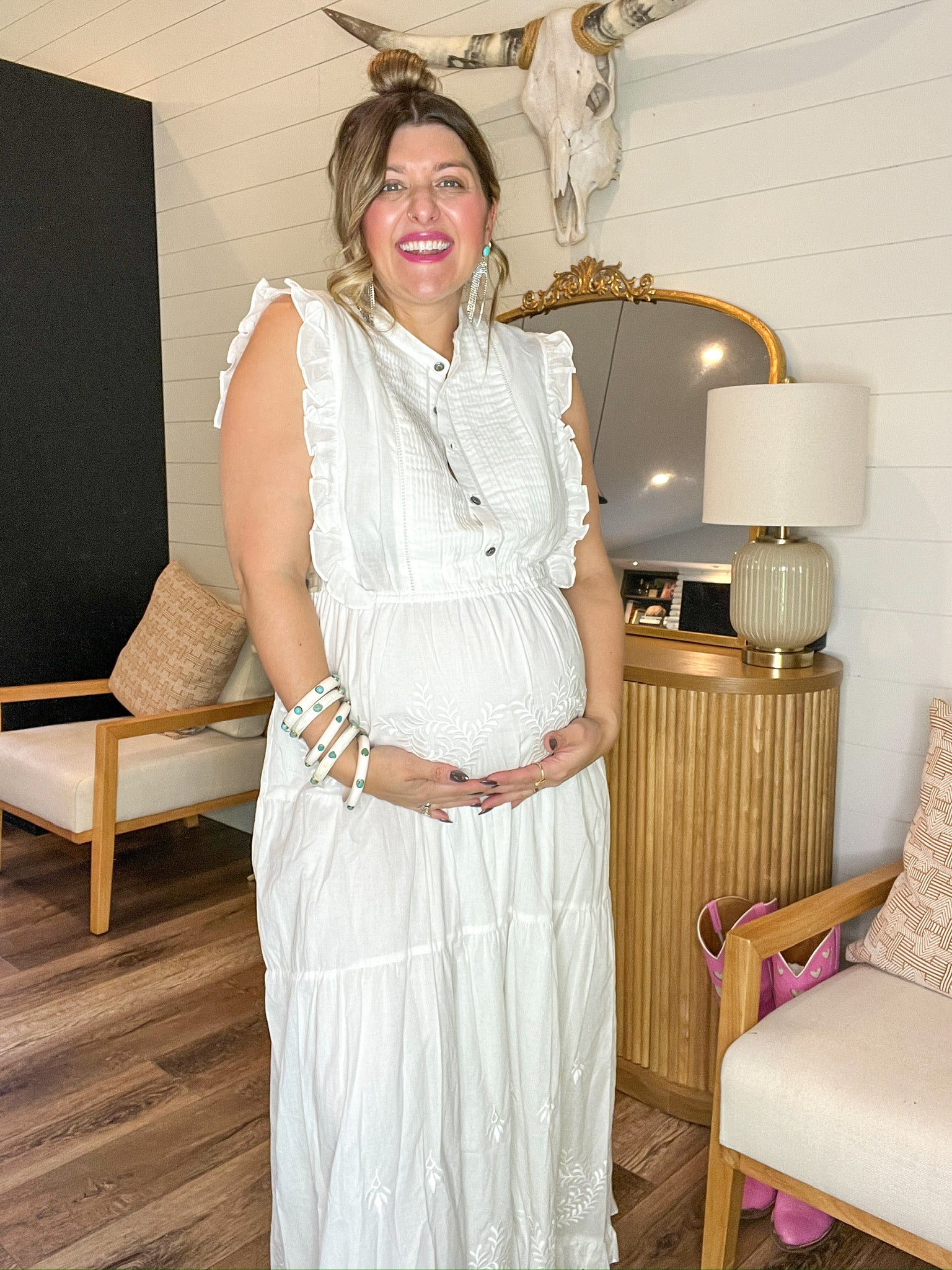 A little prairie, a little Parisian, and all heart. The Paris Dress is giving “Thanksgiving at the homestead with heirloom china and fresh cornbread in the oven.” This dreamy white maxi features delicate pintuck pleating, fluttery ruffle sleeves, and tonal embroidery that trails down every tier. It’s fully lined and finished with ornate buttons that feel straight out of an antique market in the South of France. Bonus? Every purchase comes with a free Tasha Polizzi scarf—because one statement piece just isn’t enough.