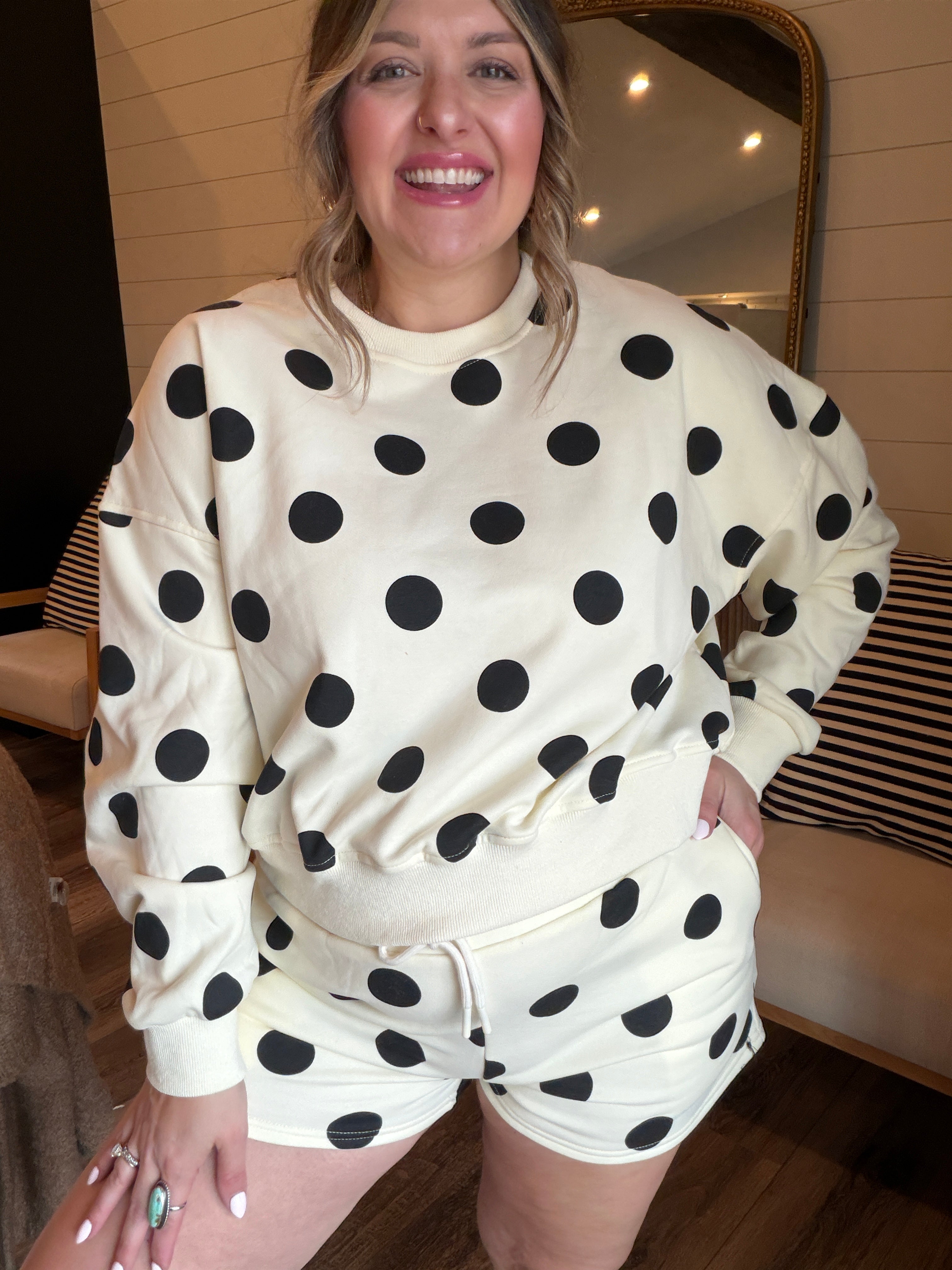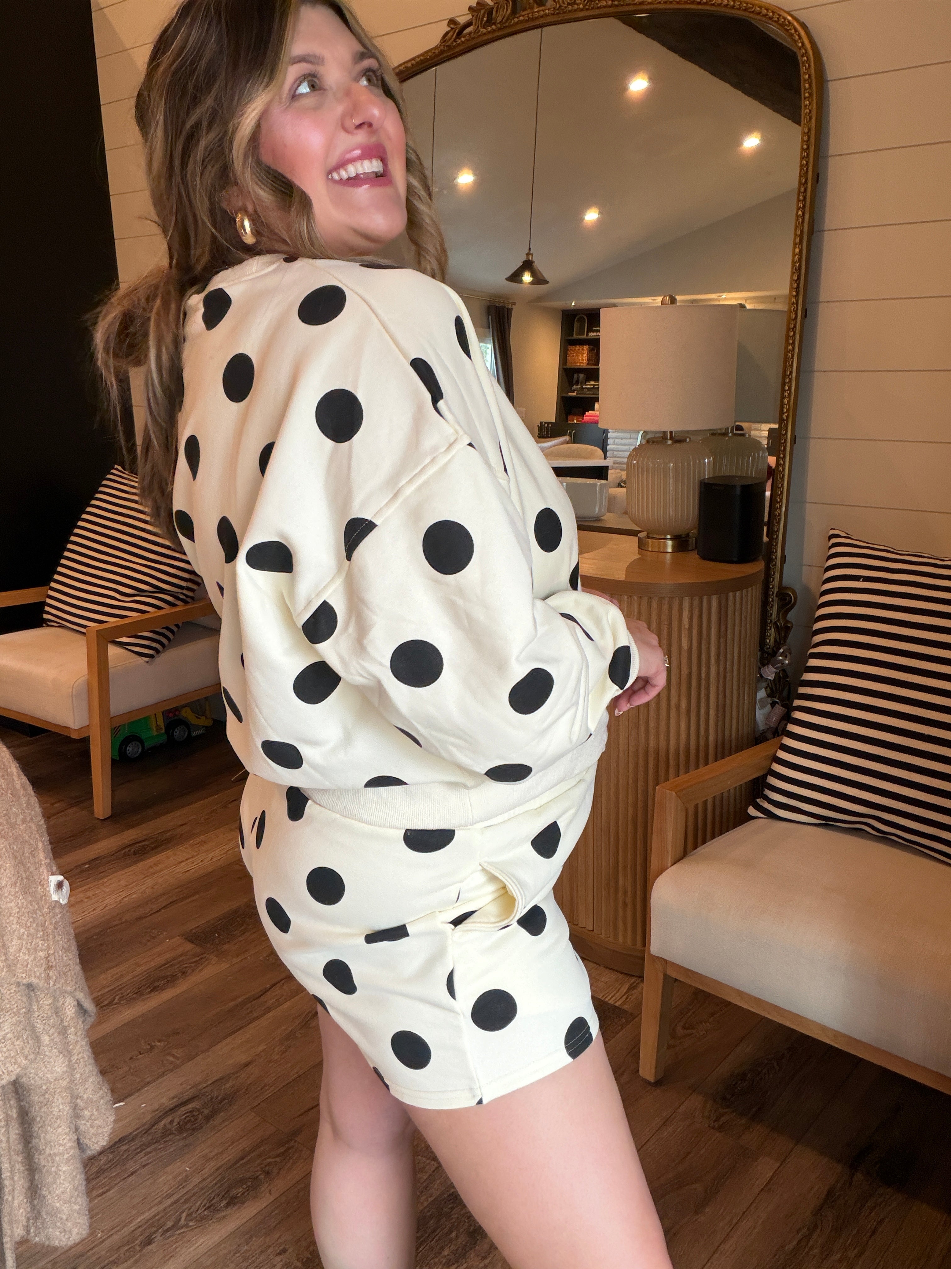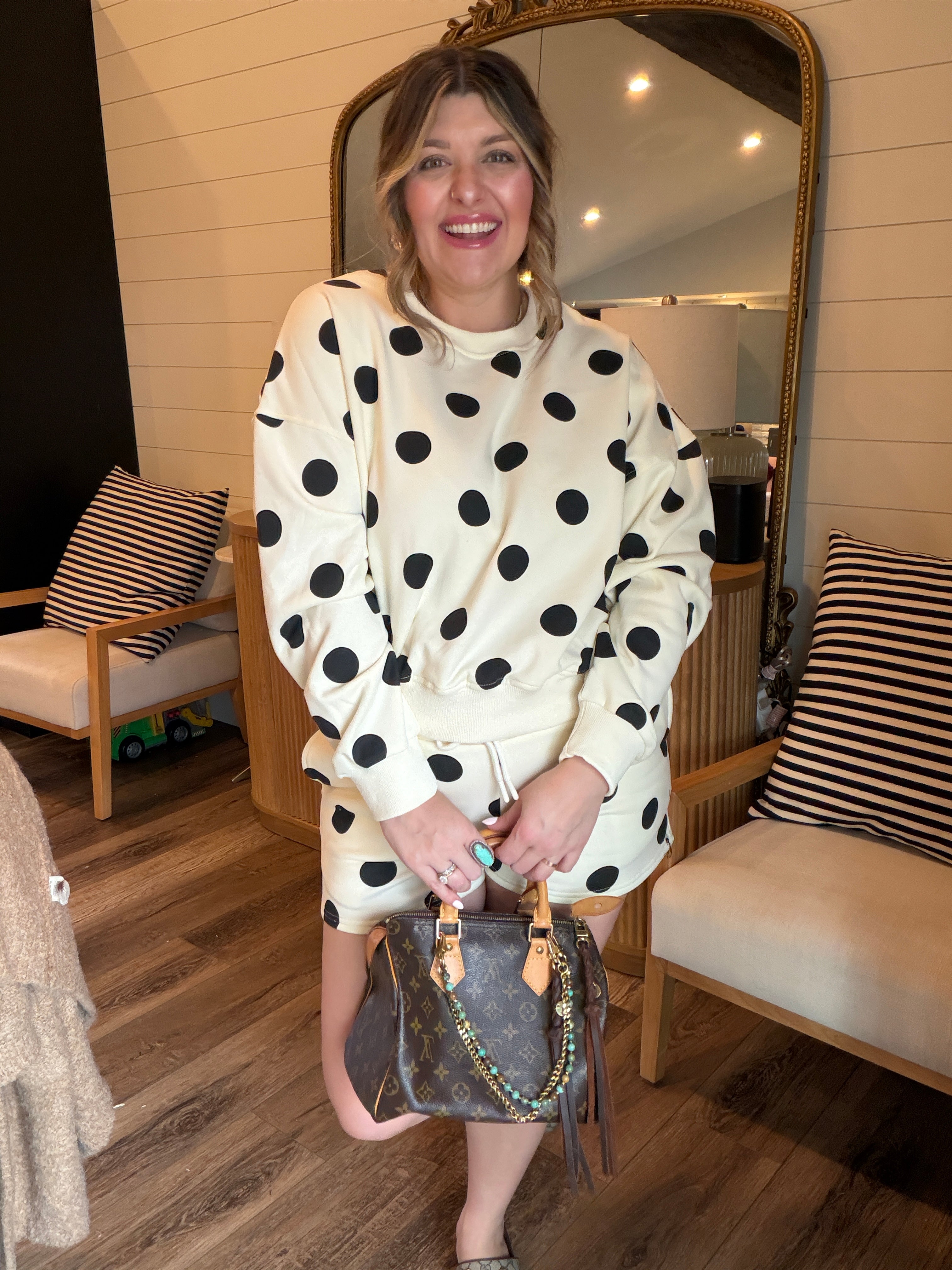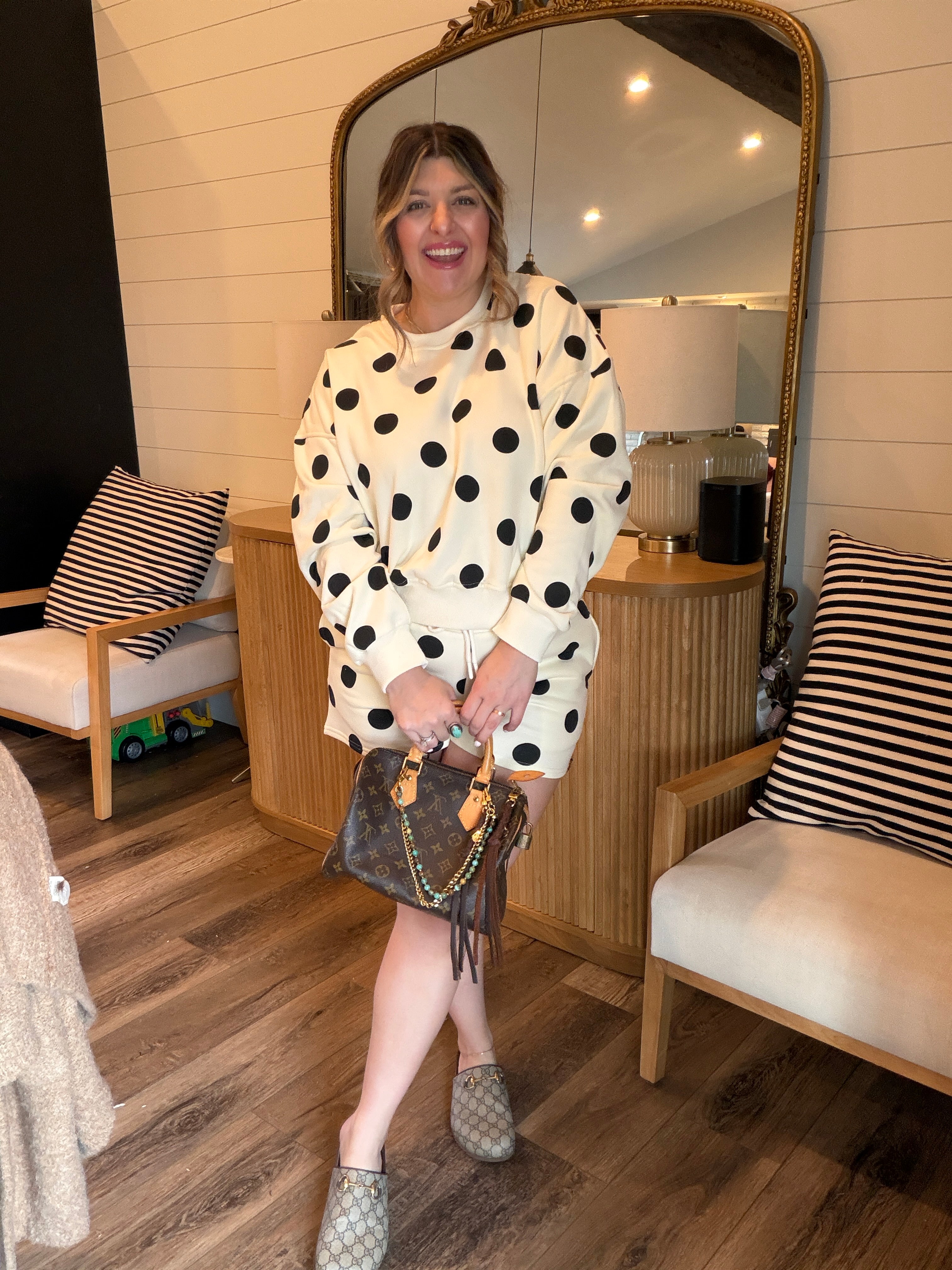 This white and black polka dot sweat set is the perfect blend of comfort and playful style. Featuring a classic crew neck top and matching sweat shorts with a stretchy elastic waistband, this set is made for lounging, errands, and everything in between. Soft, cozy, and effortlessly cute — it’s a must-have for everyday wear.