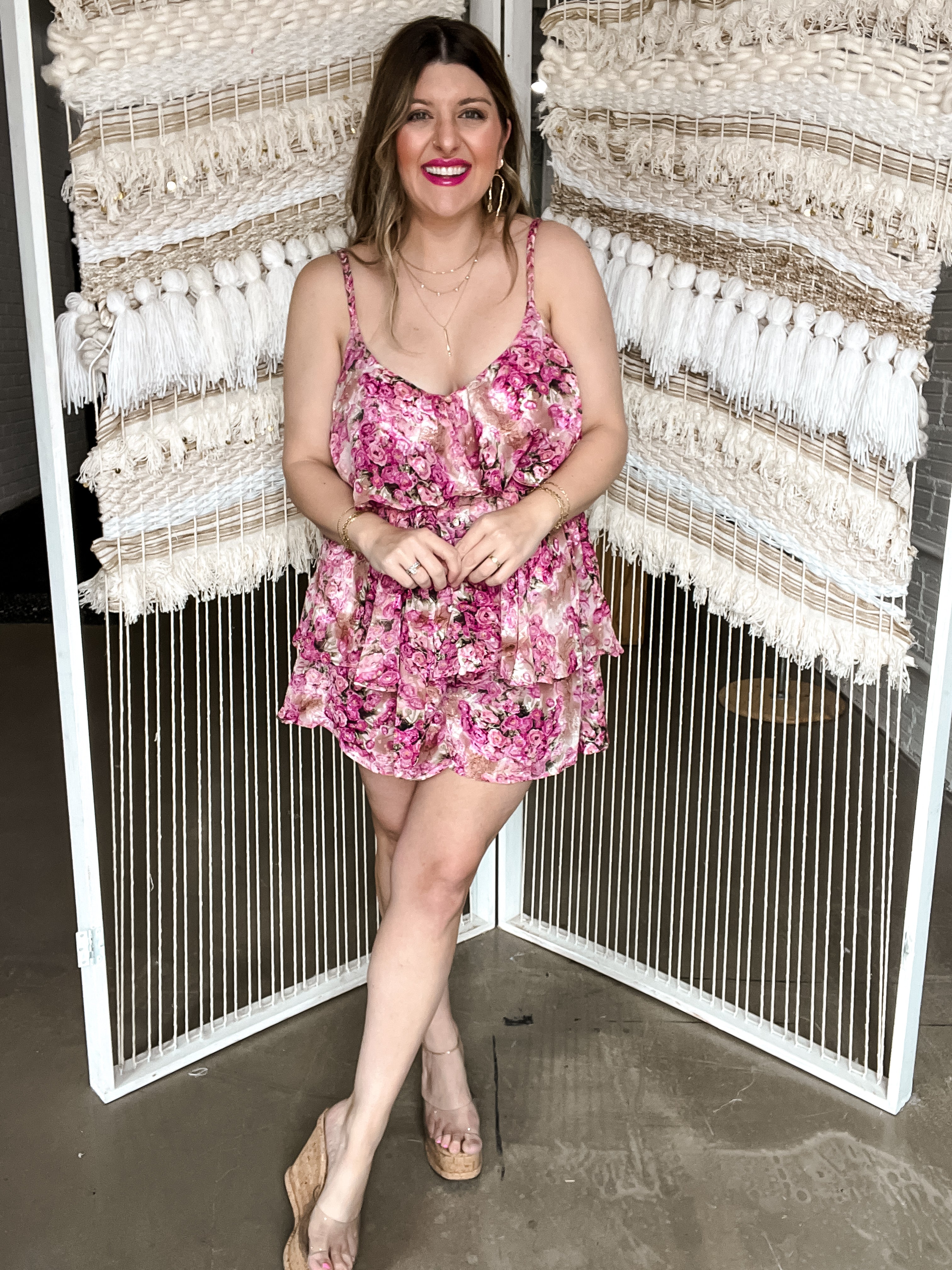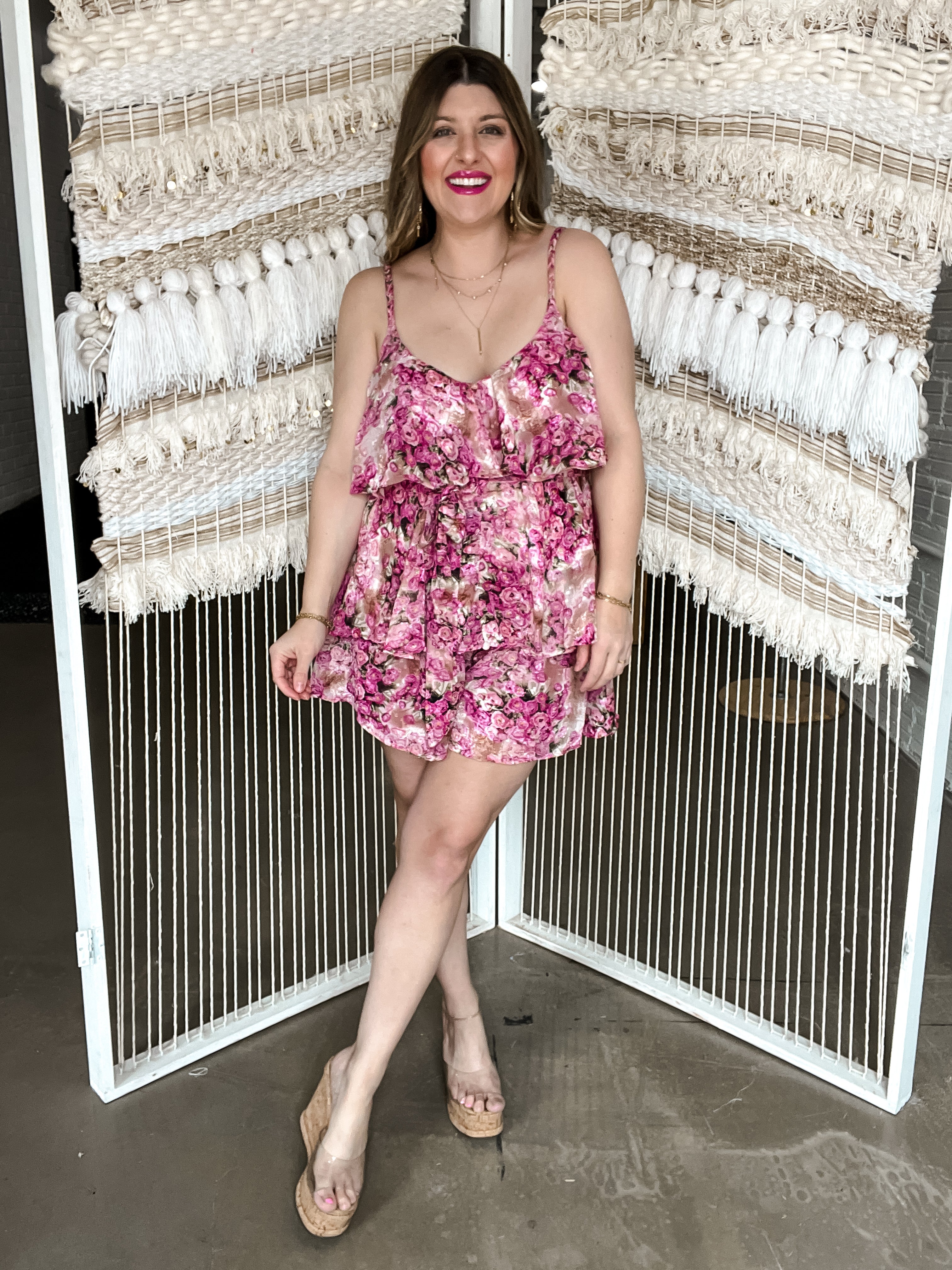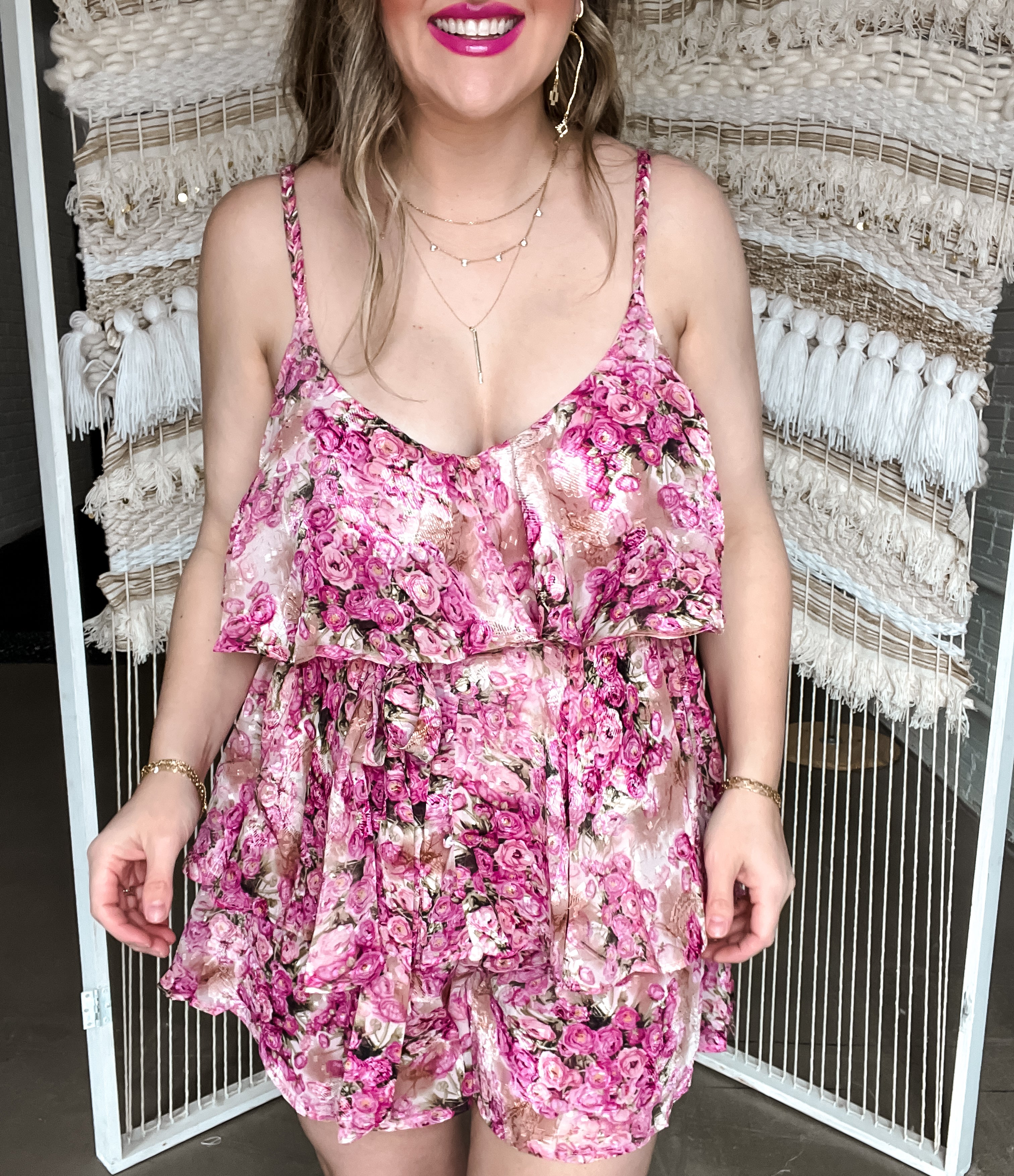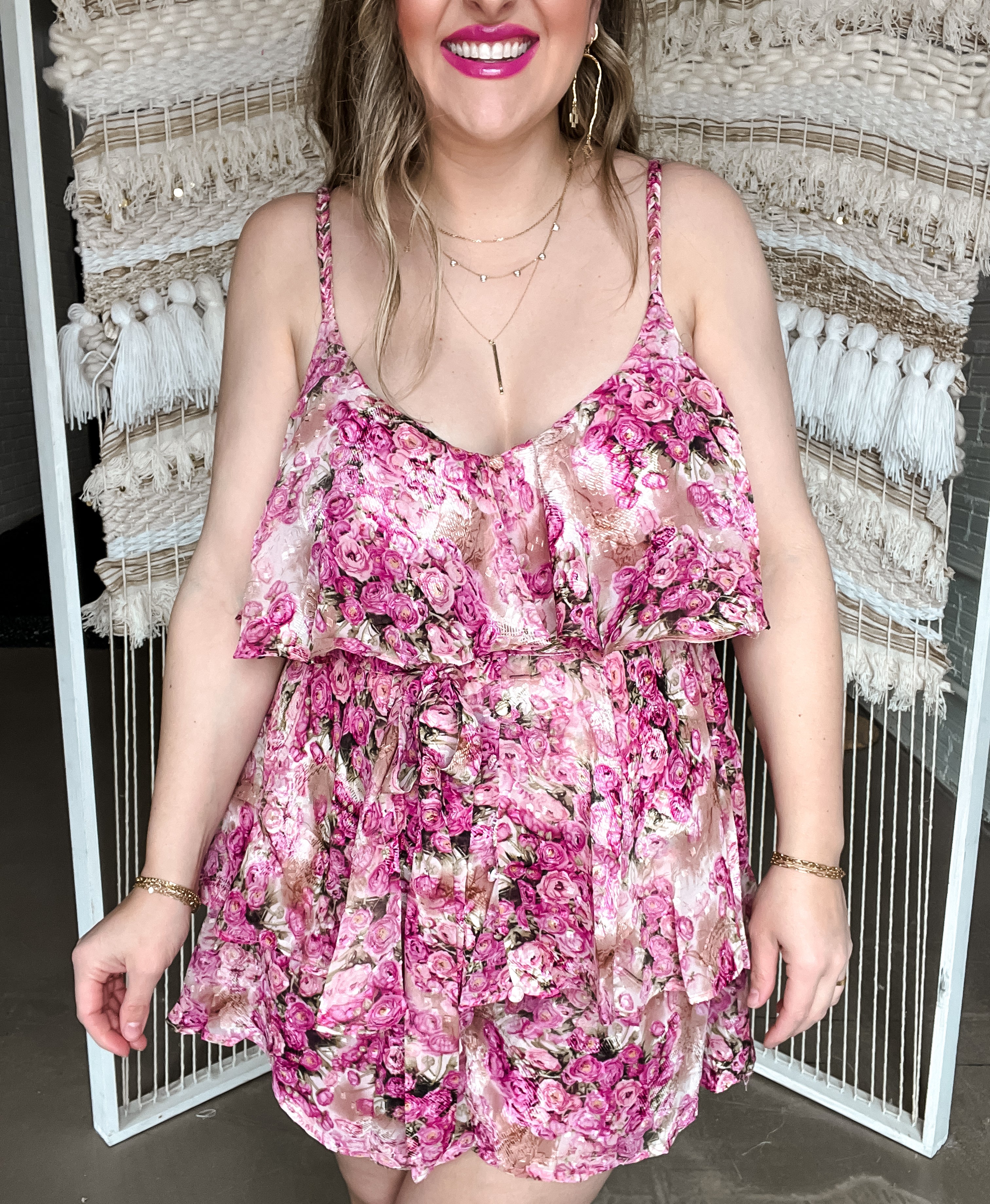 Get ready to romp around in the Pink Frills Floral Romper! This playful and girly romper features a fun pink floral print and flirty ruffle detailing. The hidden back zipper closure and adjustable straps make for a comfortable and customizable fit, while the waist tie adds a touch of whimsy. Perfect for a day out with the girls or a fun summer date! I personally rocked the large and the skort of this made it so comfortable to wear! With adjustable straps I felt so cute and comfy!