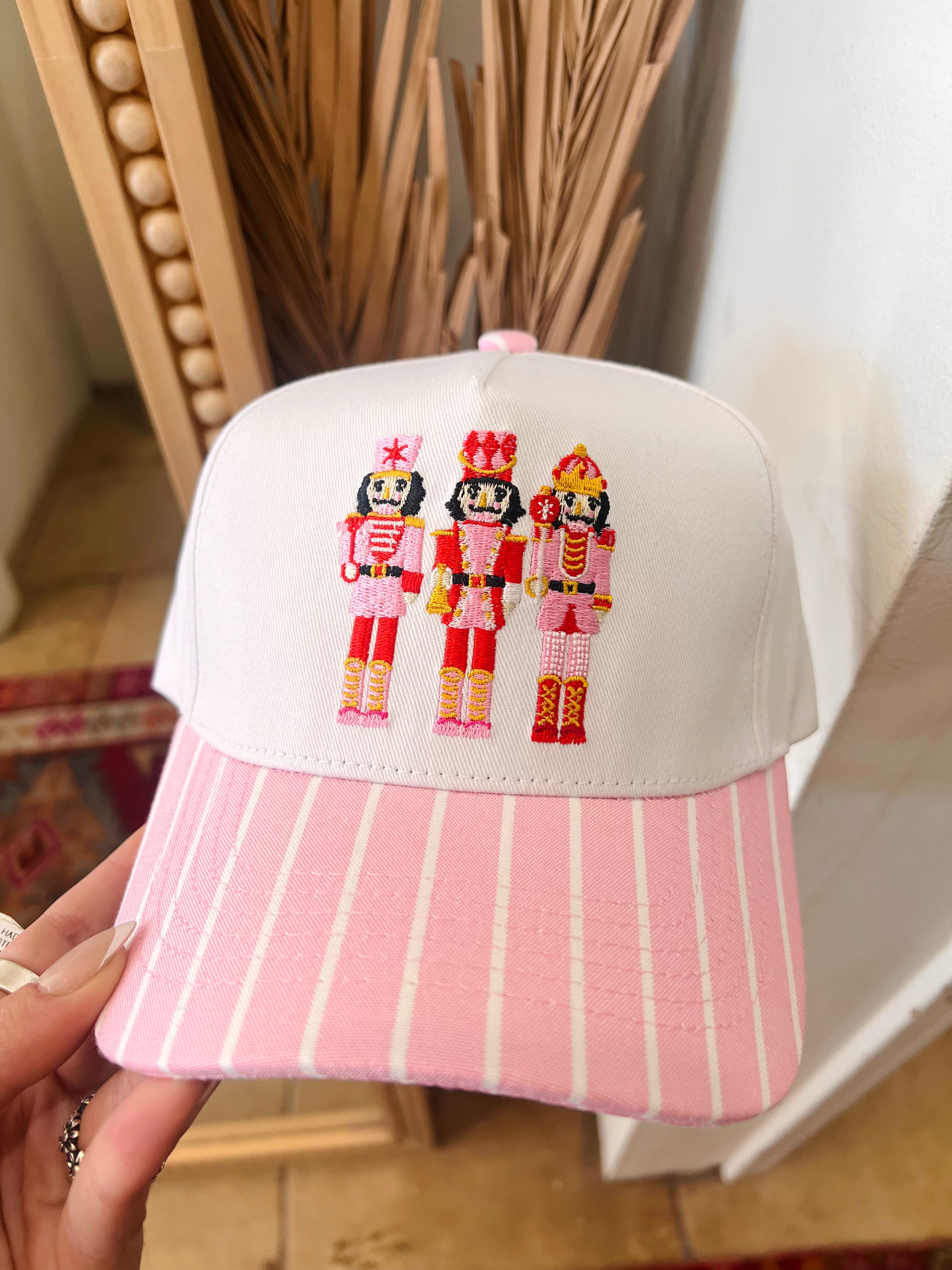 Marching straight into your heart—and your holiday wardrobe. This candy-striped cap is serving sugar plum cuteness with a side of Christmas nostalgia. Featuring the cutest trio of embroidered nutcrackers on a soft pink + white backdrop, she’s made for ballet babes and festive girlies alike.
