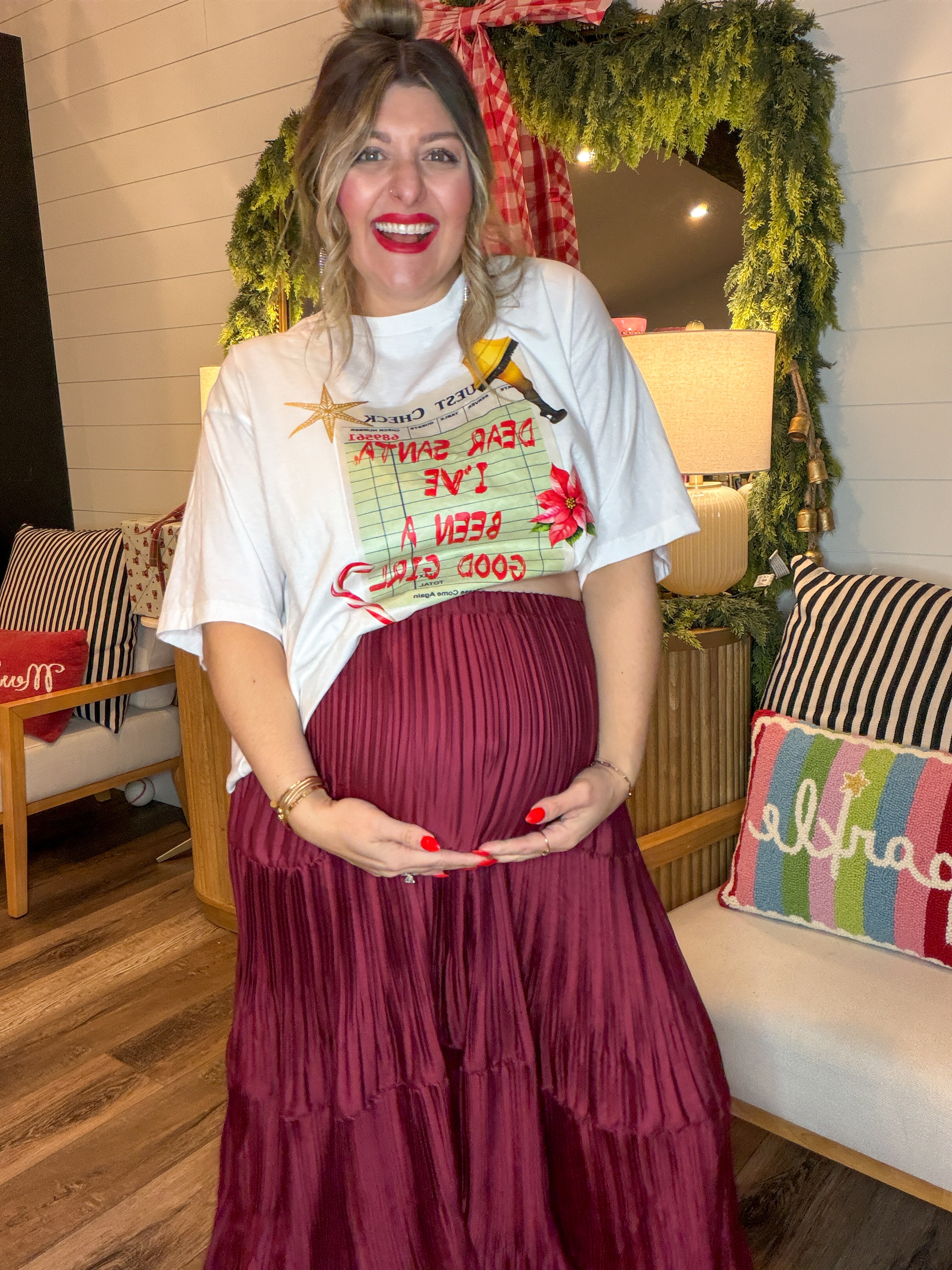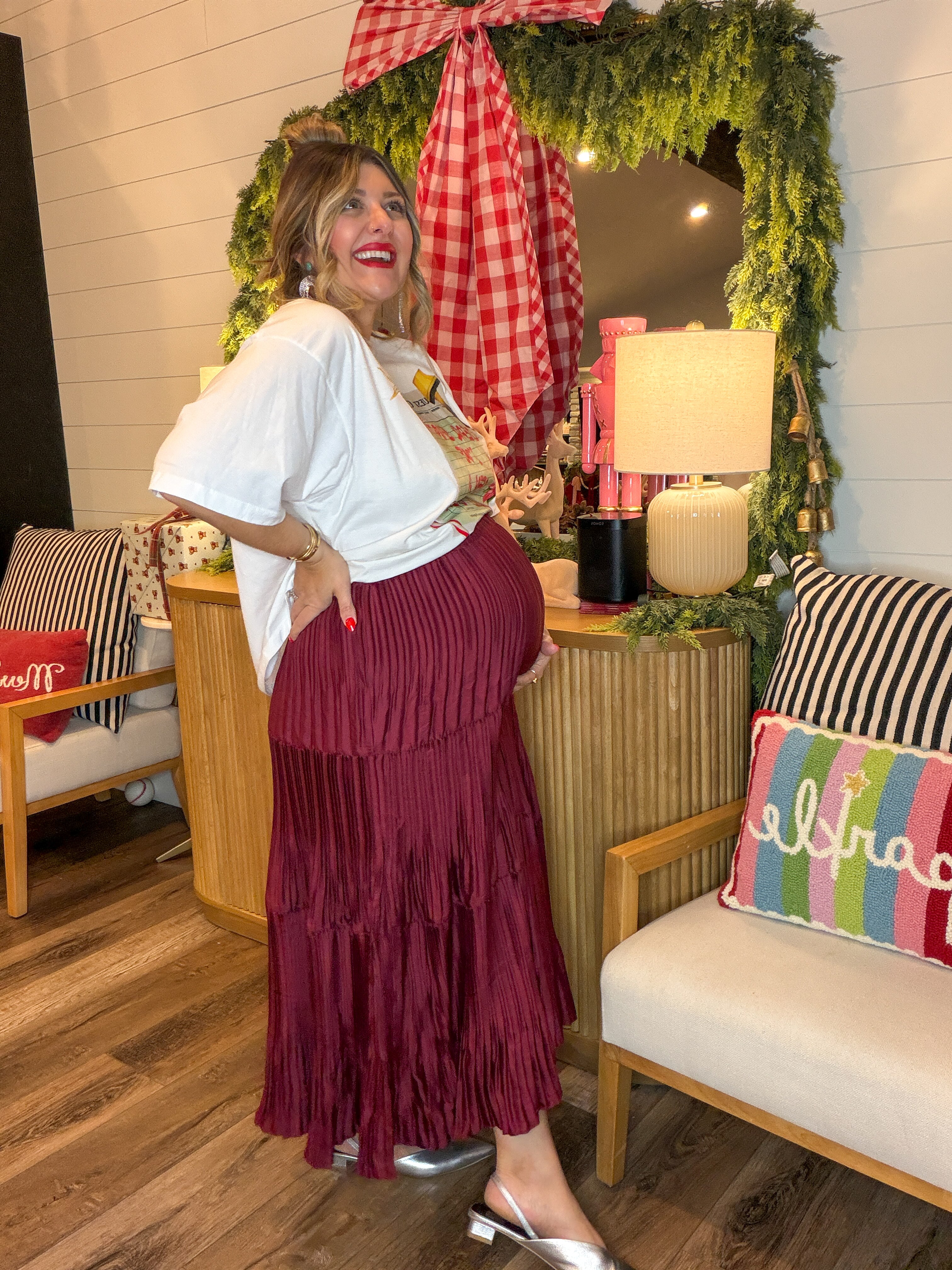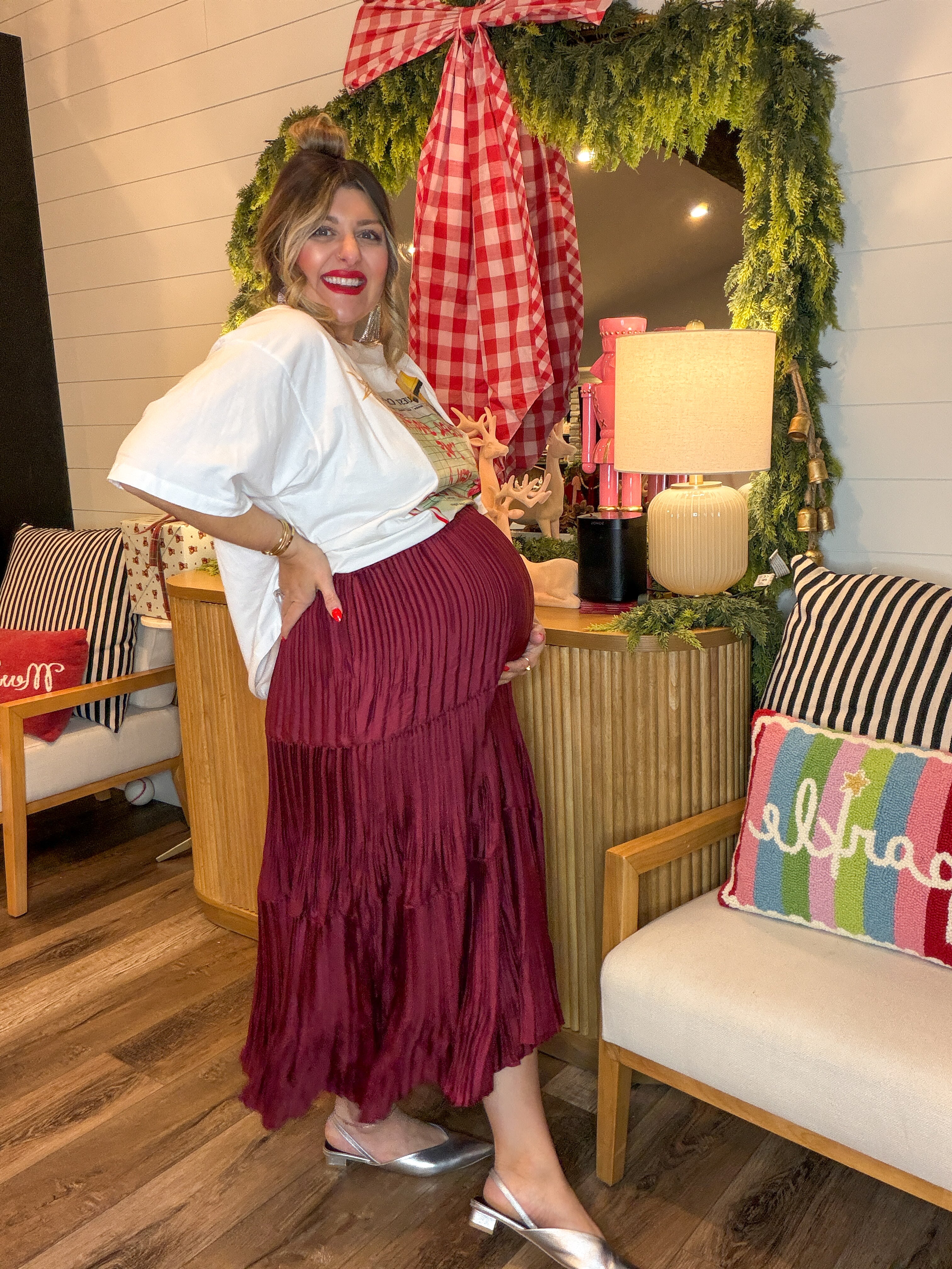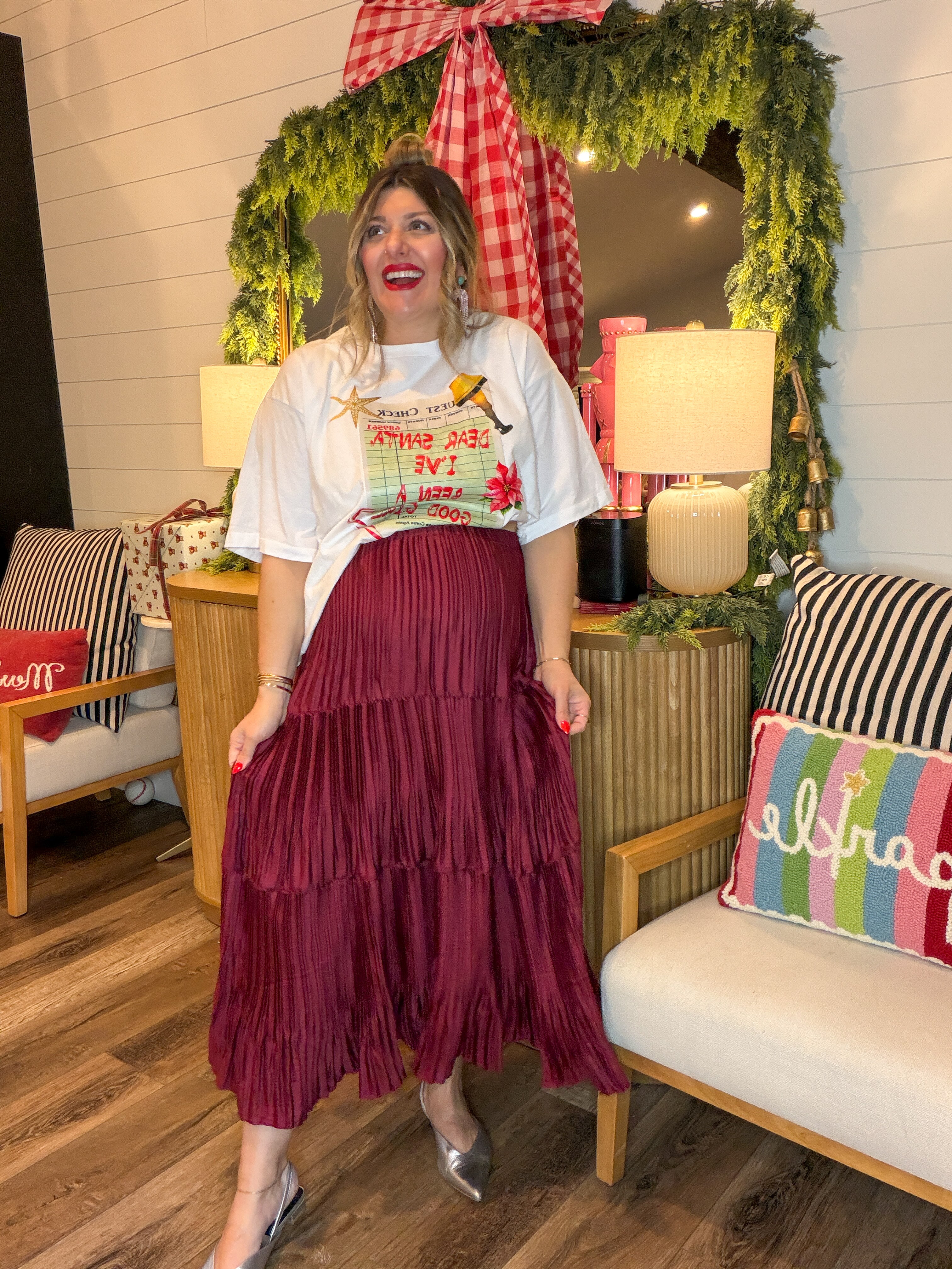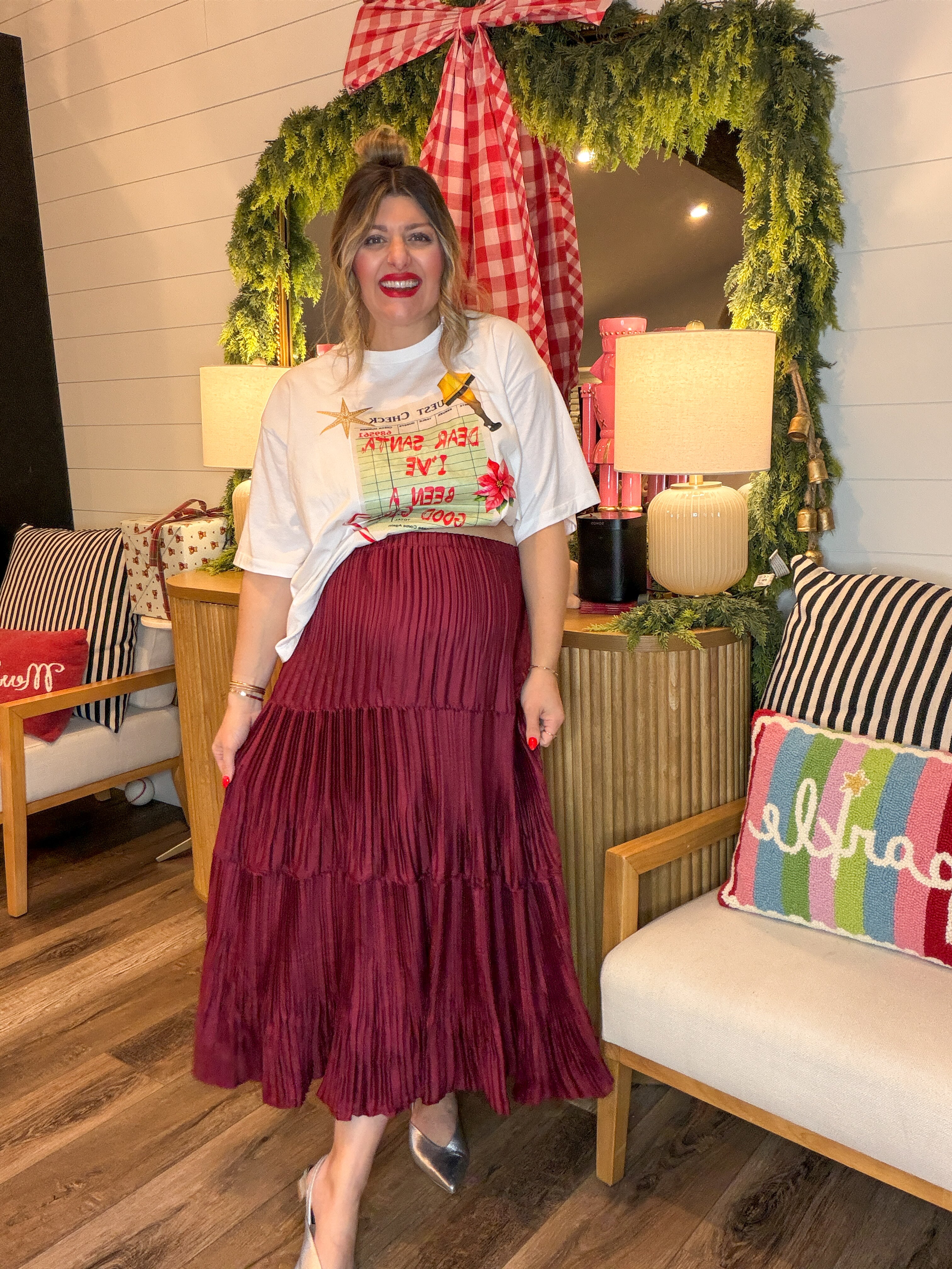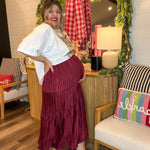 For the moments that call for a little drama… and a lot of gorgeous movement. Meet the skirt that floats when you walk. This rich burgundy beauty is all about effortless elegance — swishy pleats, soft sheen, and a tiered silhouette that moves like a dream. Whether you’re headed to dinner downtown or styling it for Sunday service, it brings instant “main character” energy without even trying.