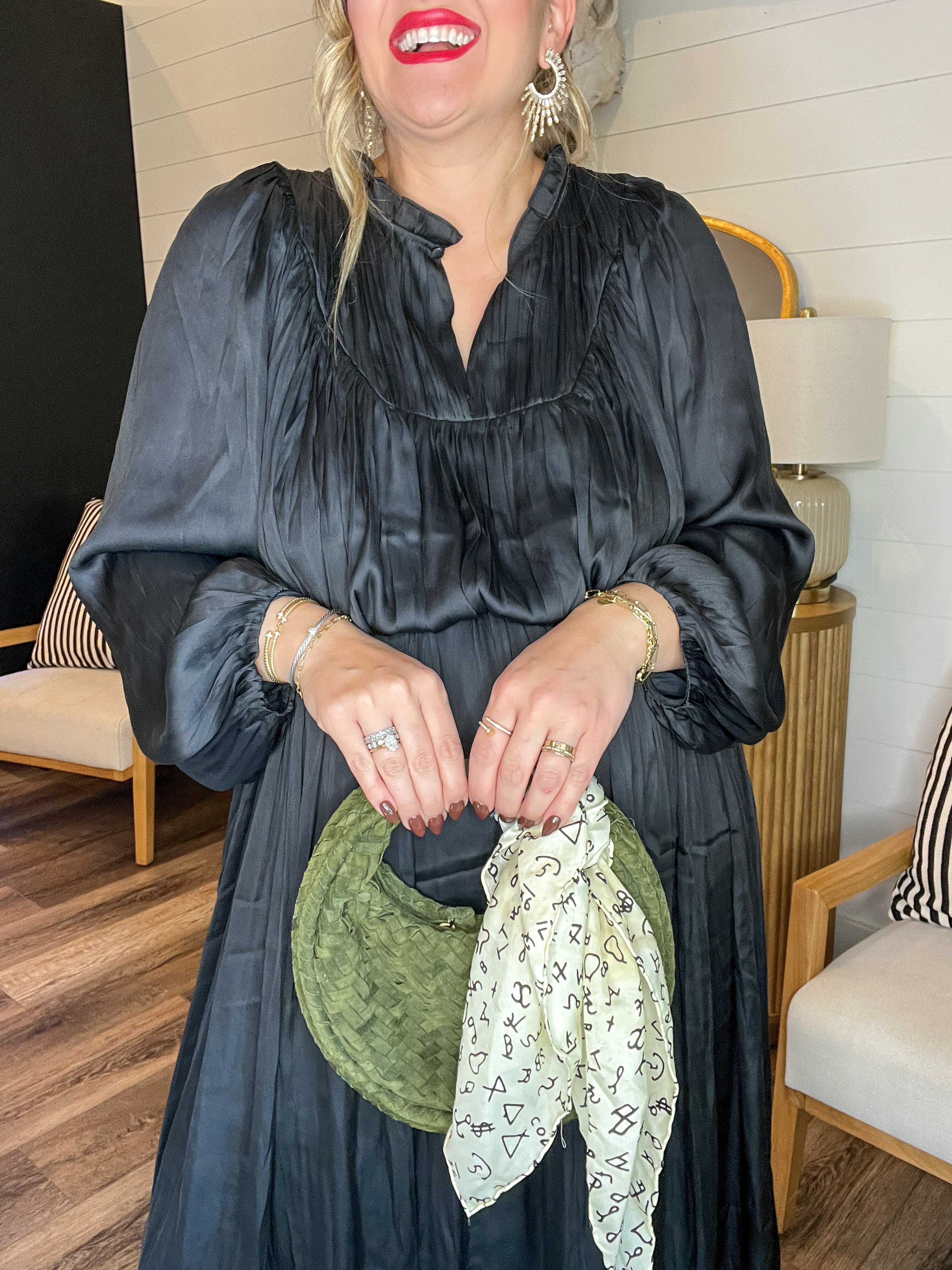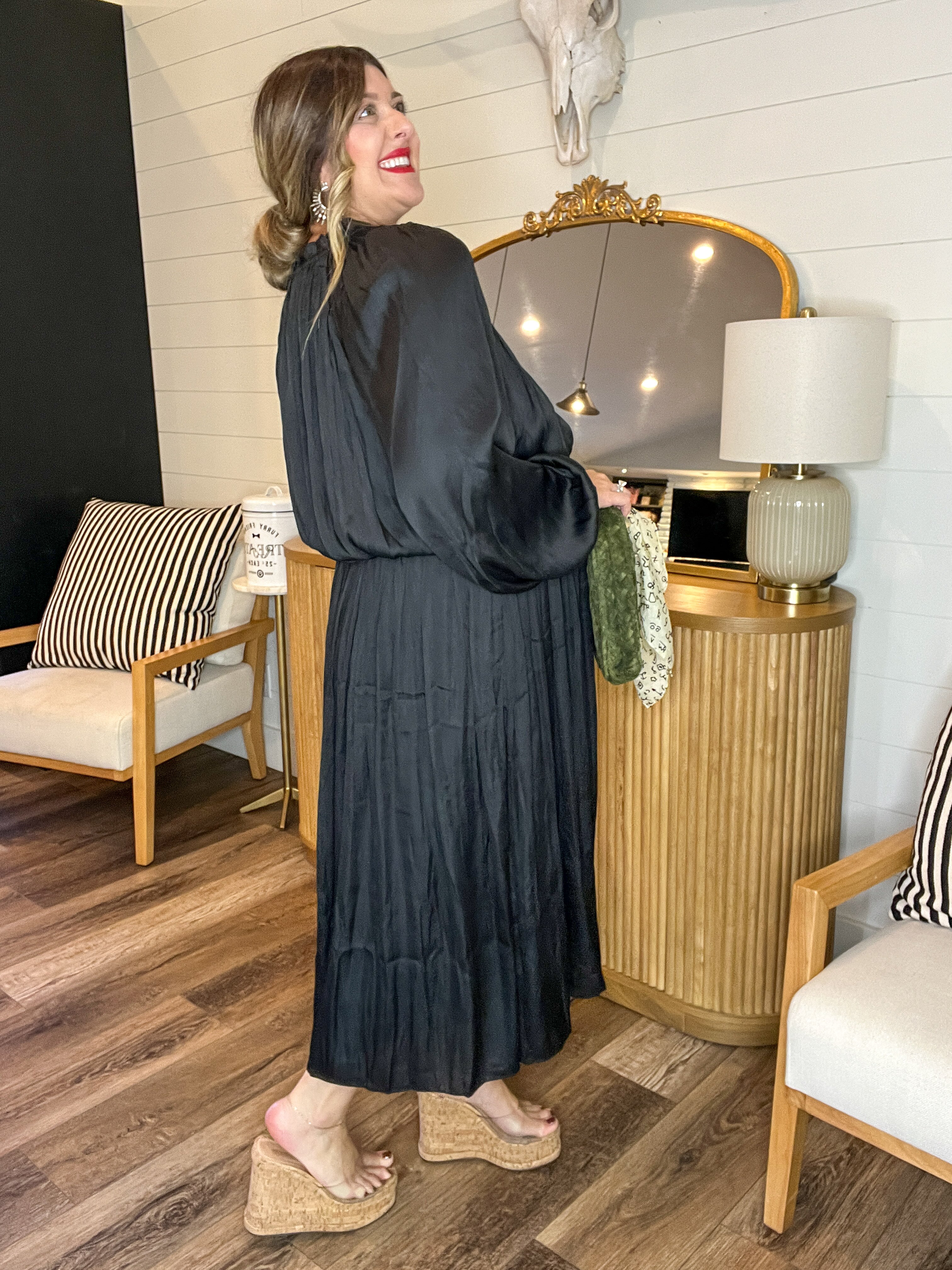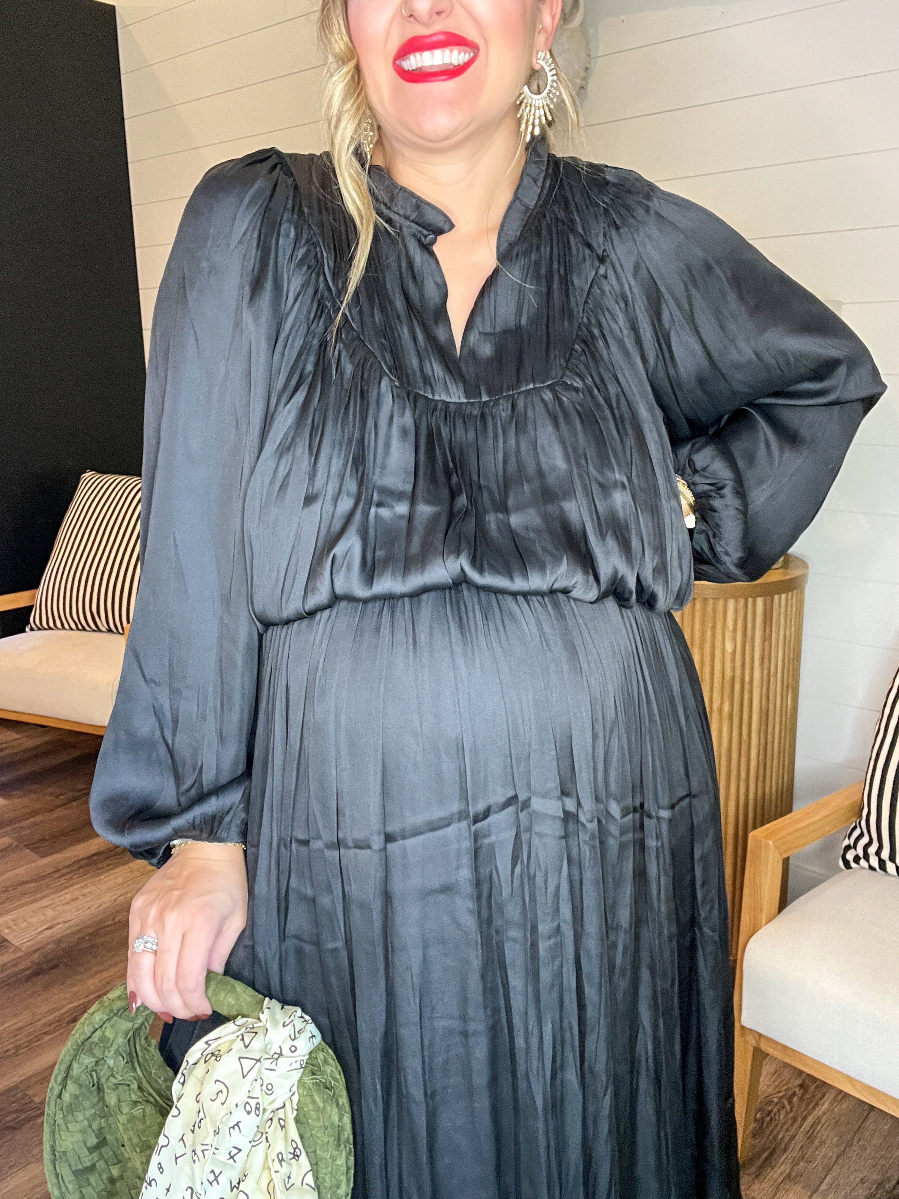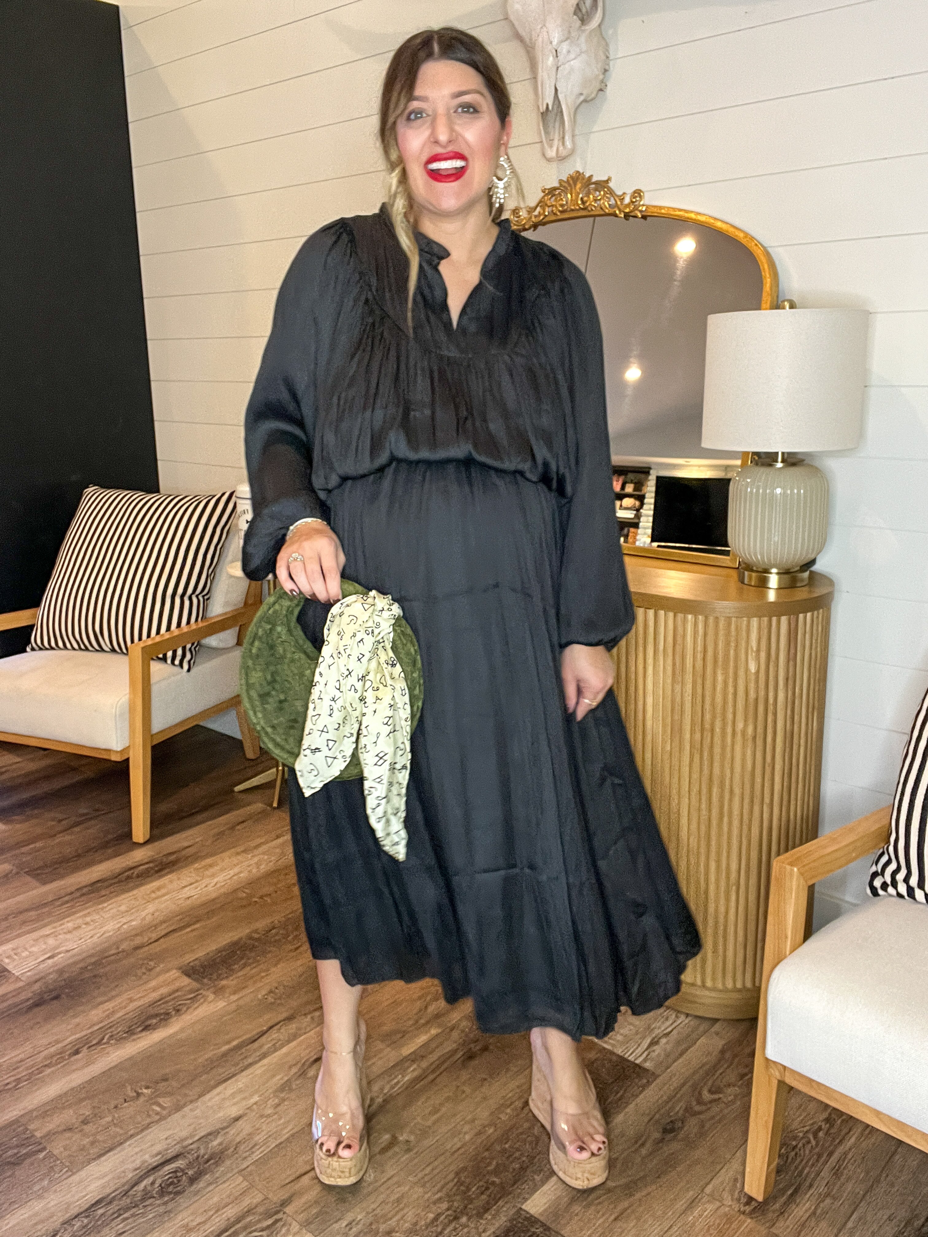 She’s giving: quiet power, dramatic flair, and a little mystery. This jet-black midi brings the heat without saying a word. Between the flowy silhouette and structured shirring, it’s like a slow burn—soft and bold all at once.
