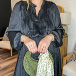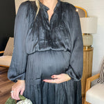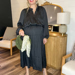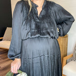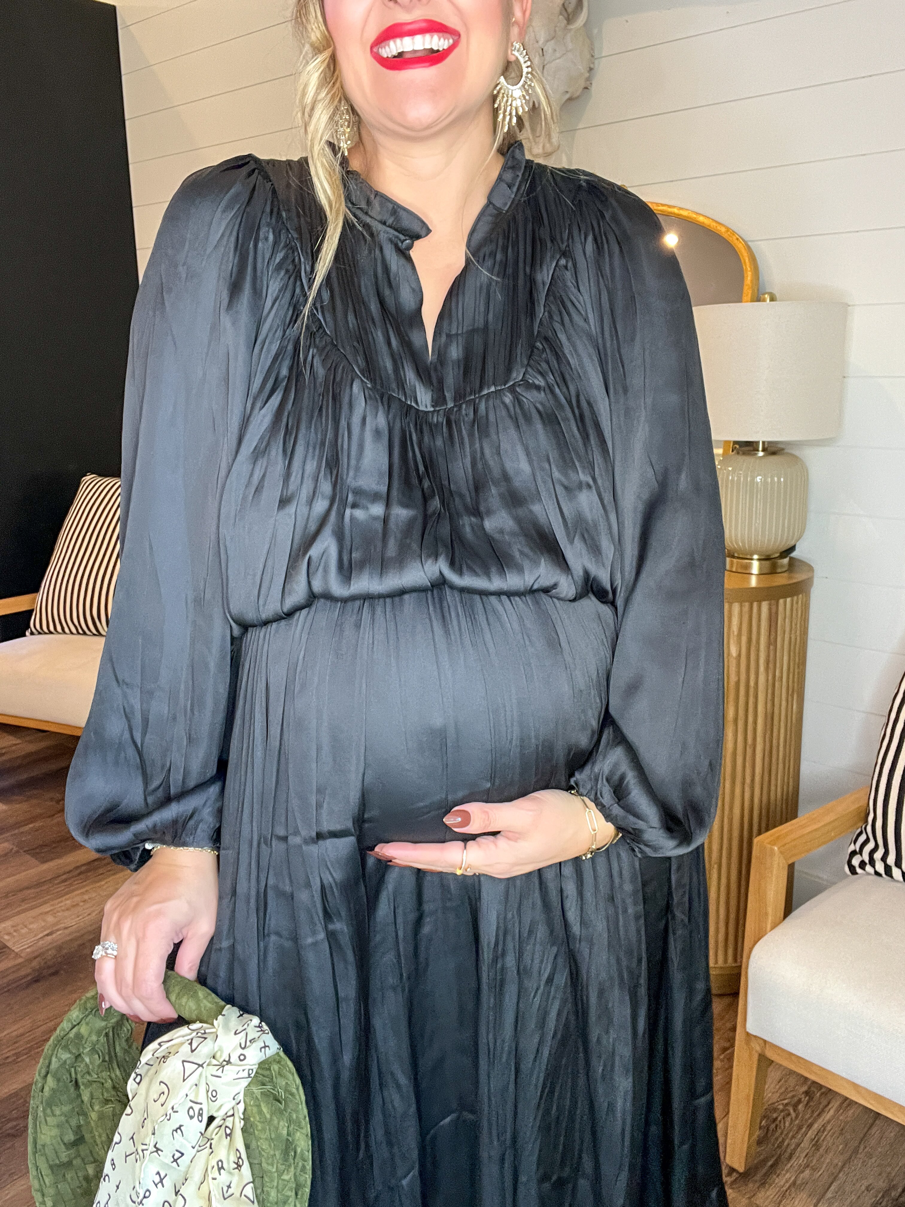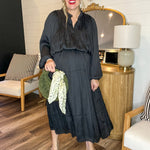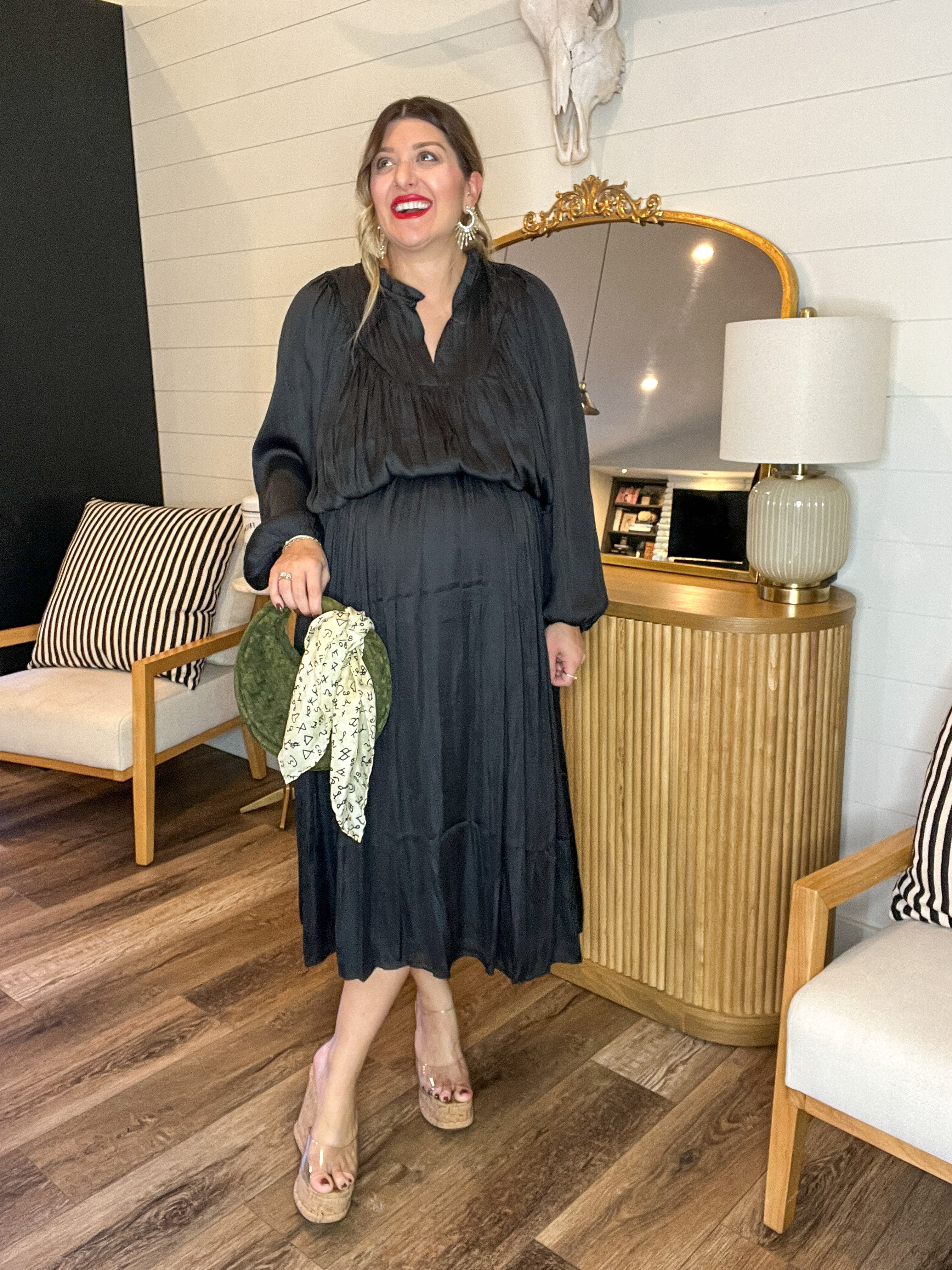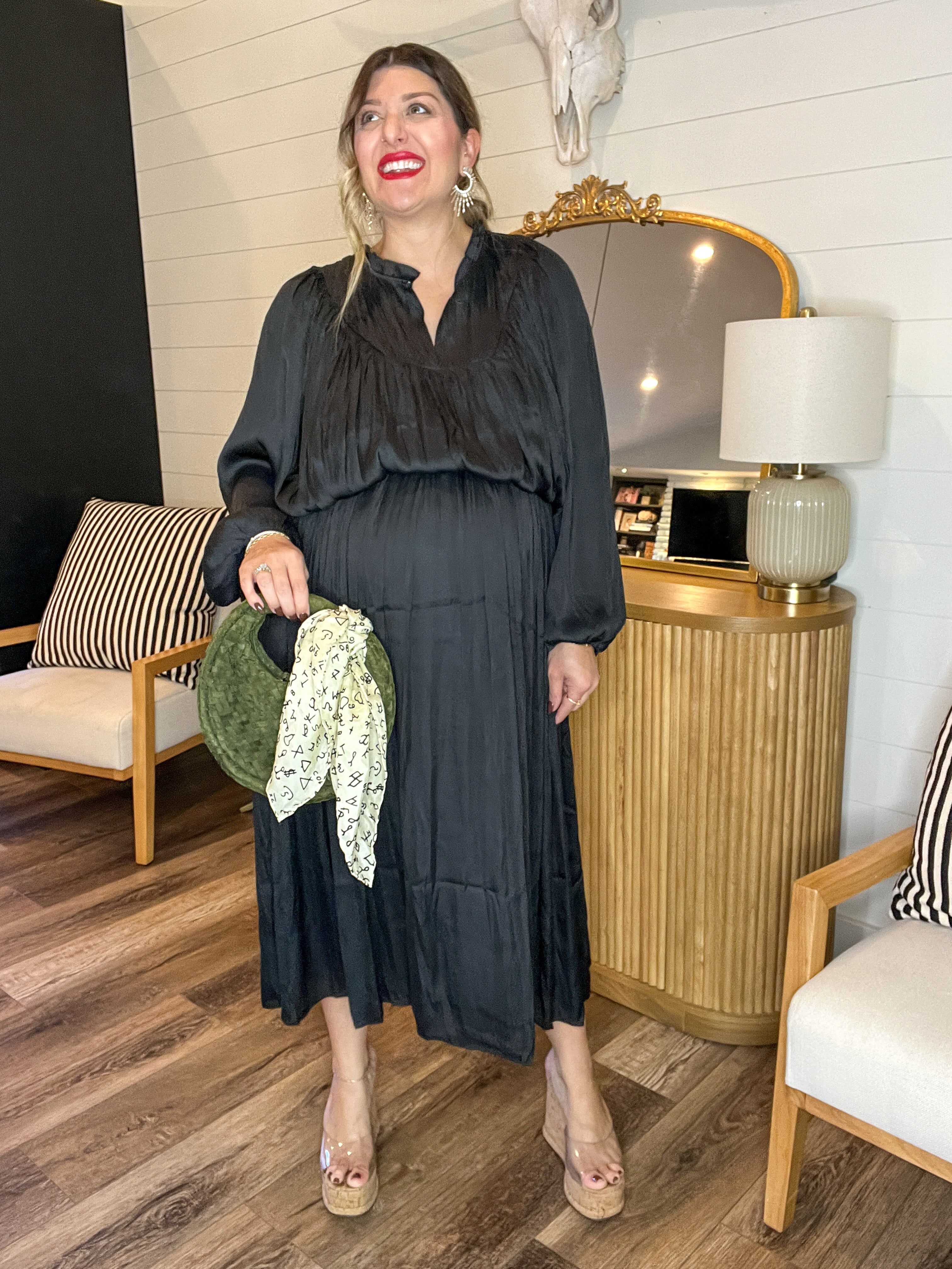 She’s giving: quiet power, dramatic flair, and a little mystery. This jet-black midi brings the heat without saying a word. Between the flowy silhouette and structured shirring, it’s like a slow burn—soft and bold all at once.
