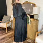 She's giving: quite power, dramatic flair, + a little mystery. This jet-black midi brings the heat without saying a word. Between the flowy silhouette + structured shirring, it's like a slow burn- soft + bold all at once.