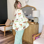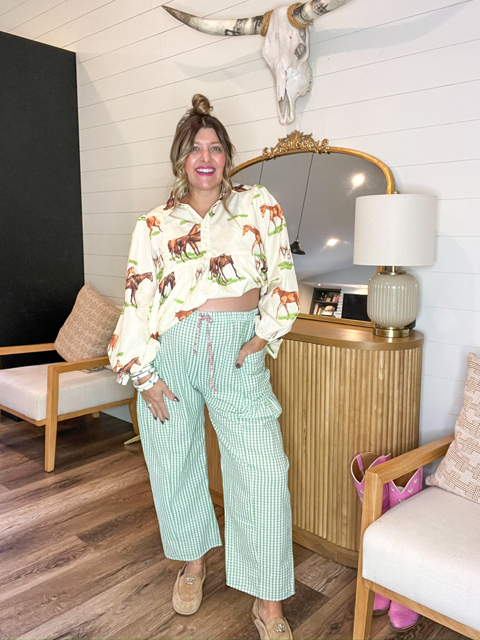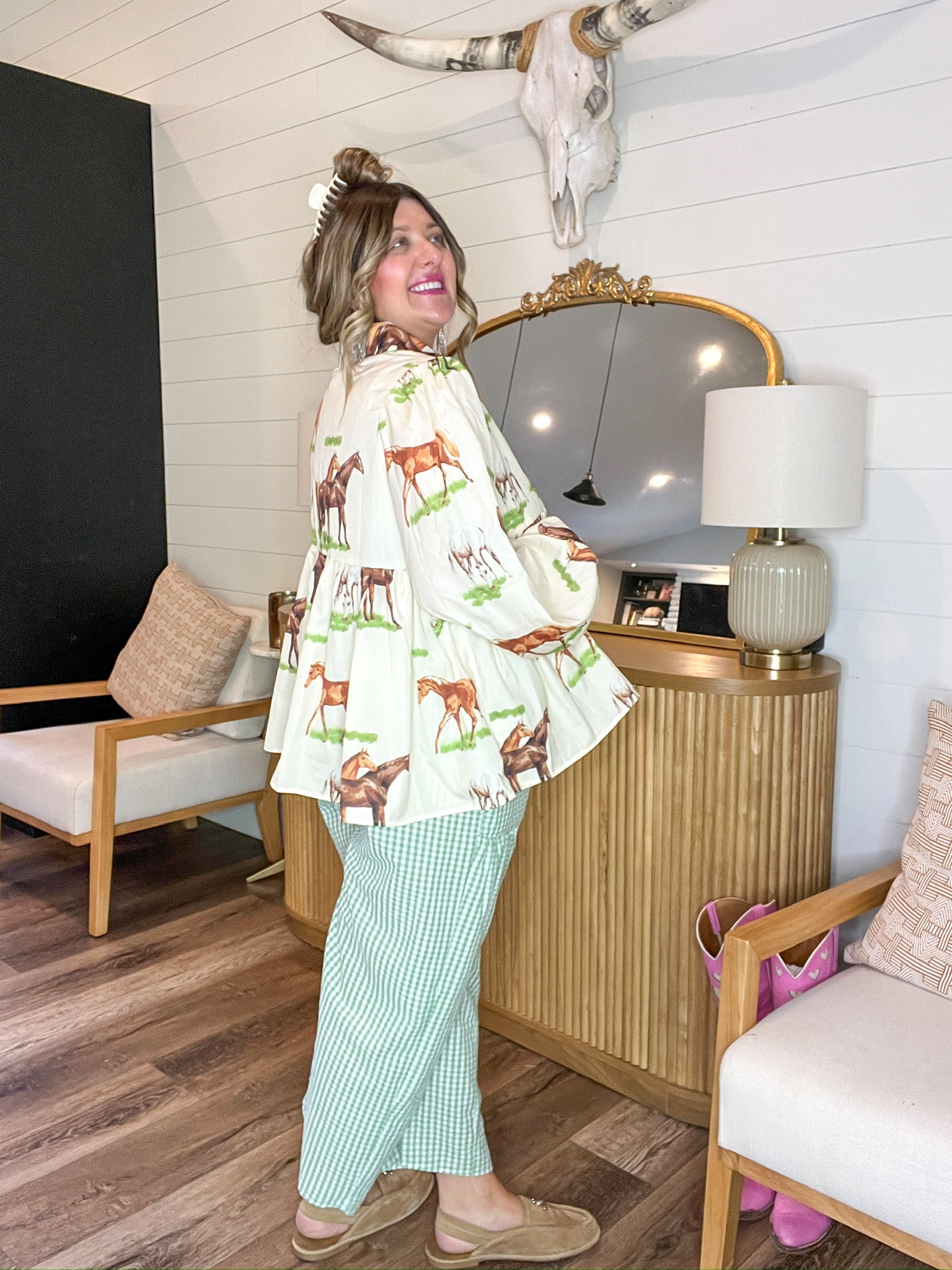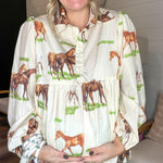 She shall no longer be called Desolate. This one’s for the dreamers, the wanderers, the pasture-proud and prairie-hearted. Featuring a painterly horse print that feels like a love letter to wide open spaces, this peplum blouse brings a soft femininity to the Western soul.