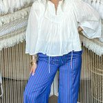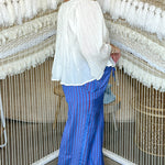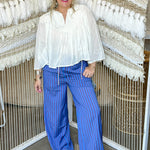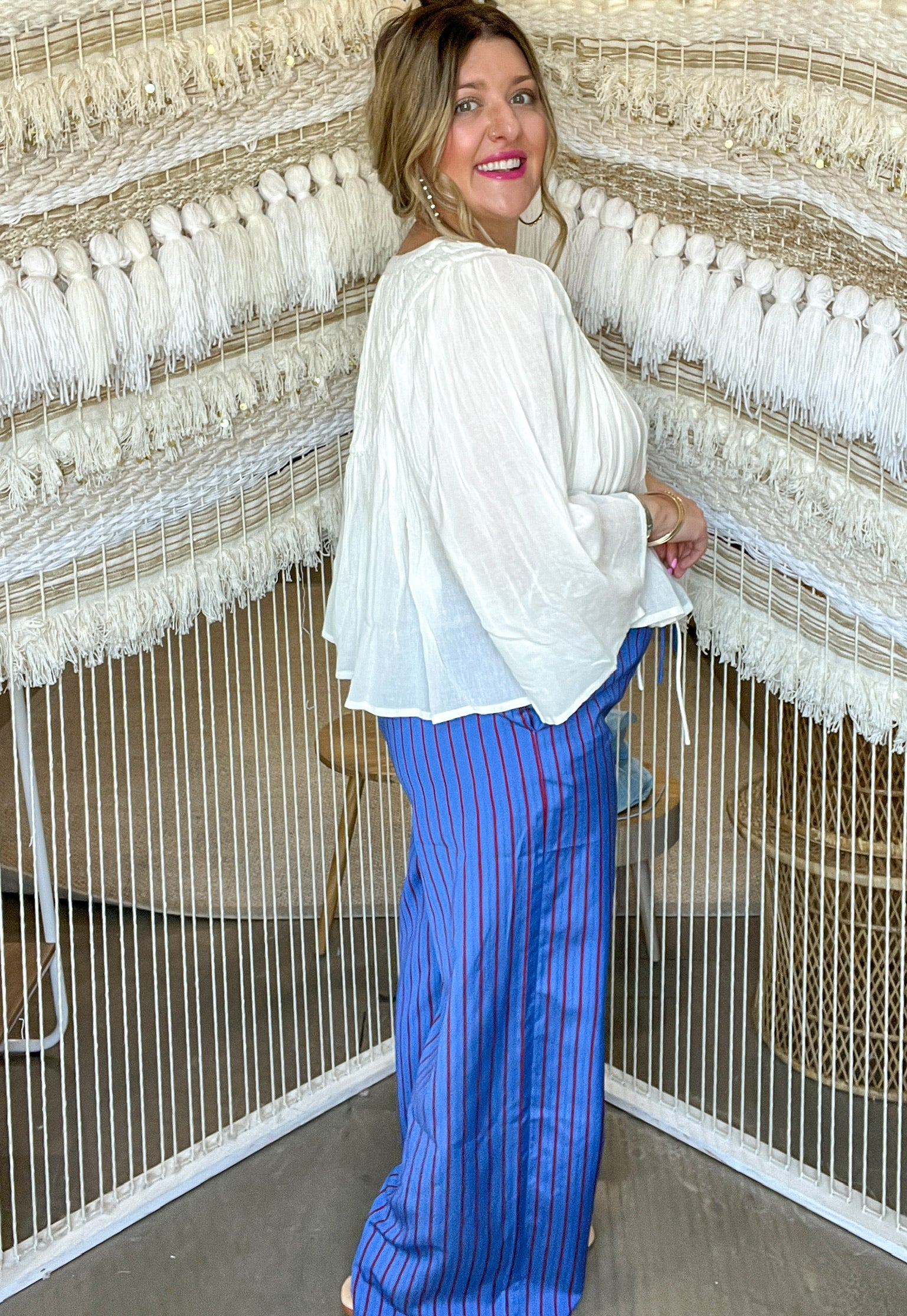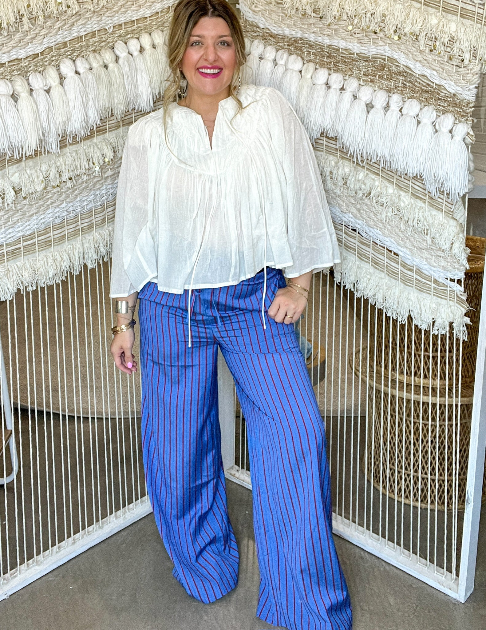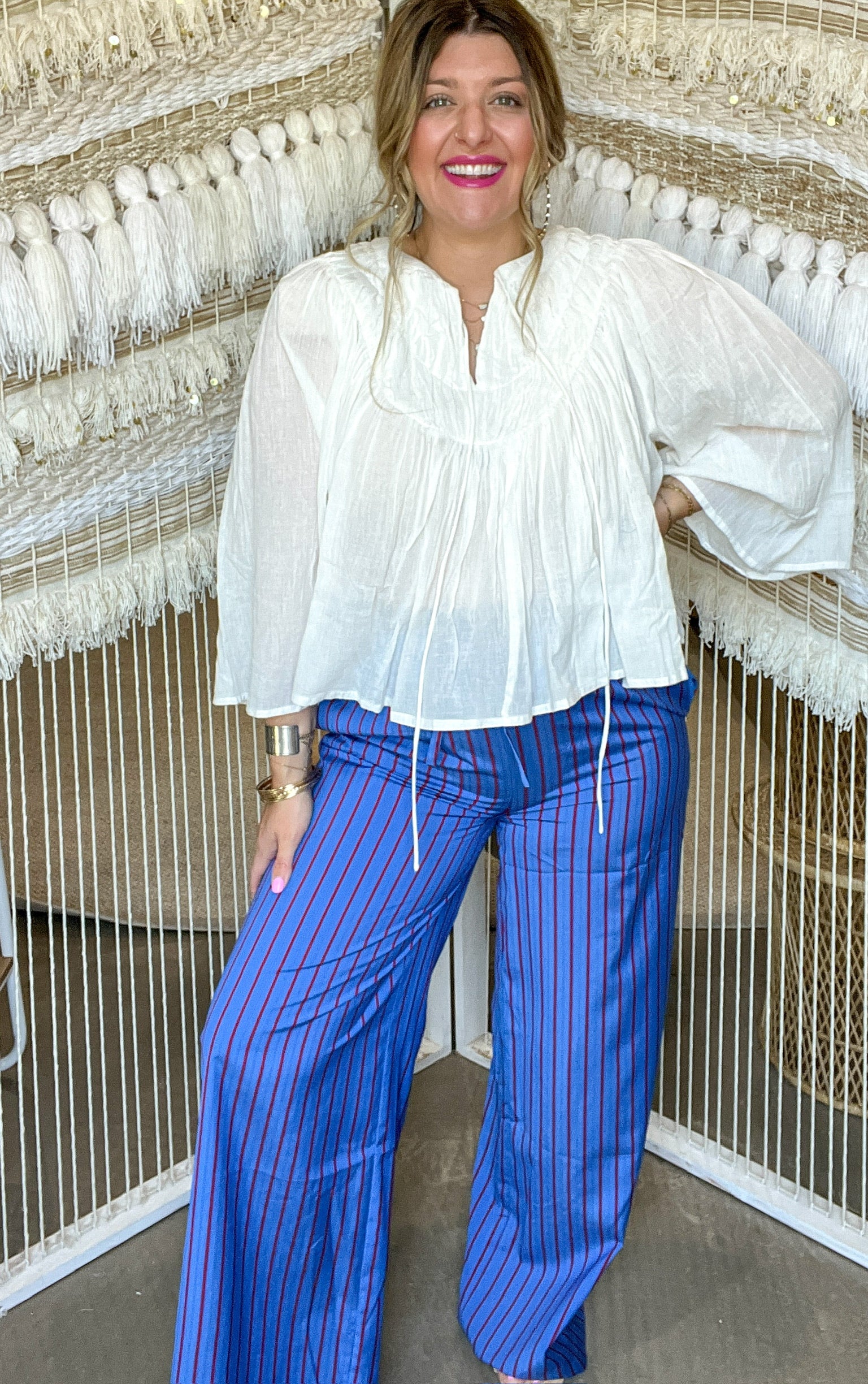 These punchy pinstripes are bringing the retro vibes back in full swing. With a high-waist fit and soft, fluid fabric, these wide-leg trousers are made for spinning through life in style—whether you’re headed to brunch or busting a move under the disco ball.