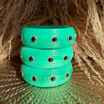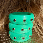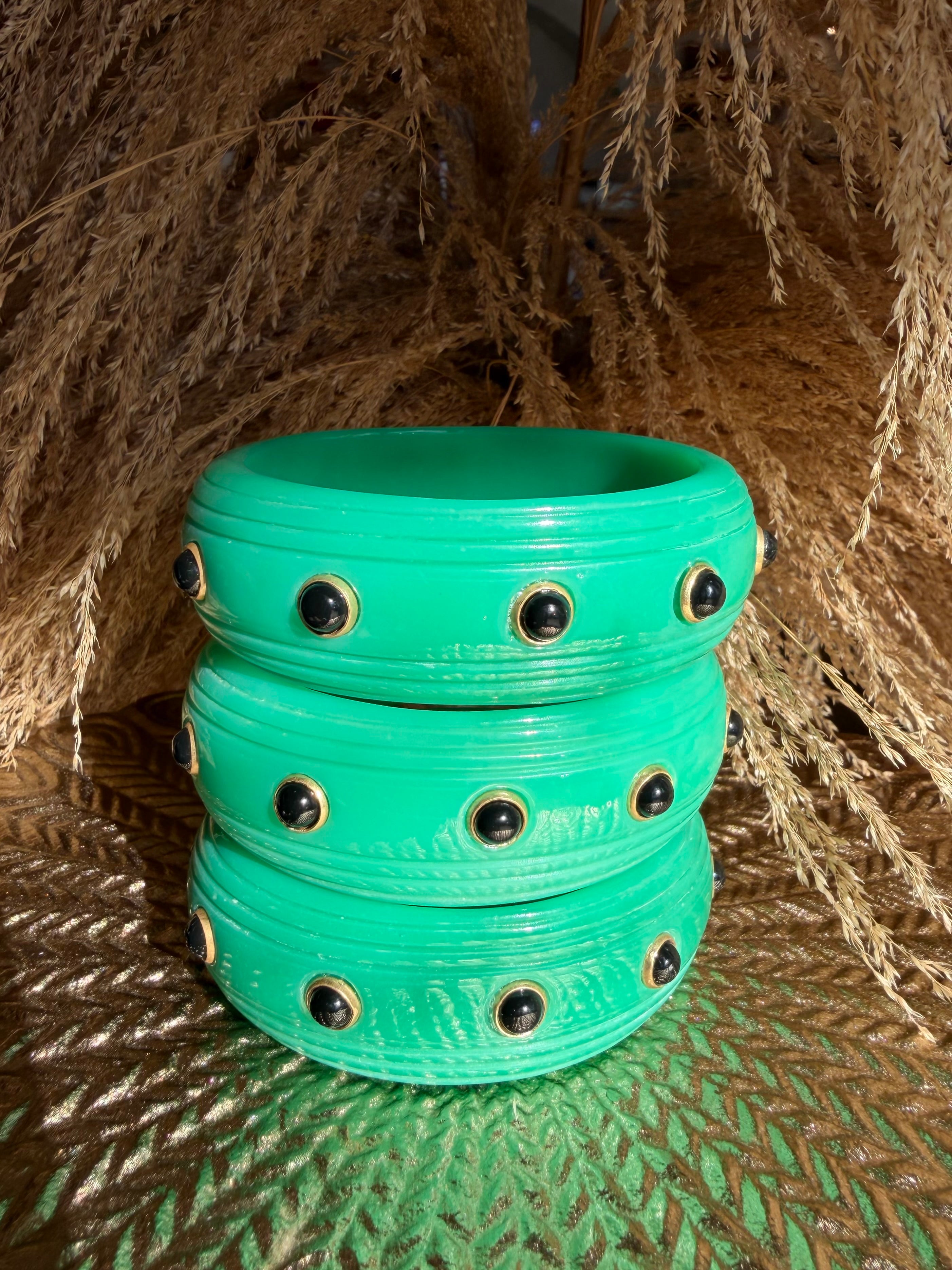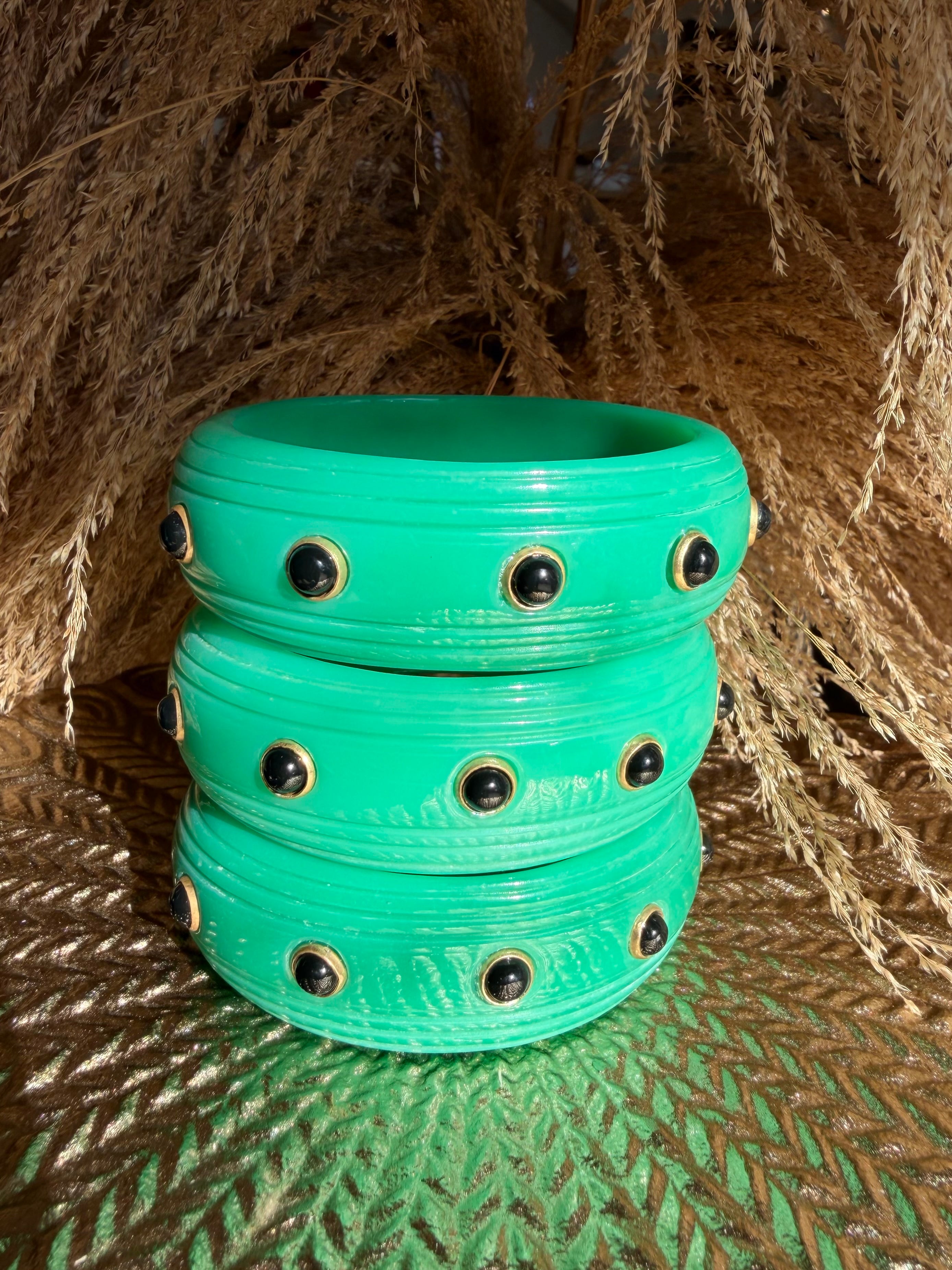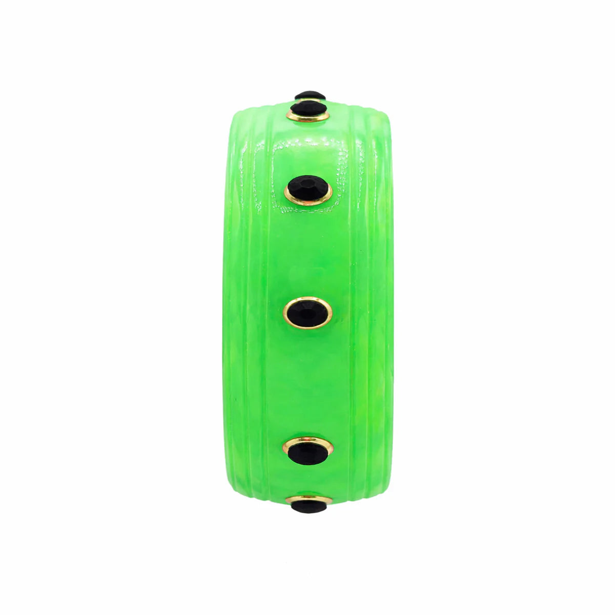 The Rosa Bangle in jade-green resin with black onyx accents is your go-to when you want something striking but still timeless. The vivid jade tone brings fresh, modern energy, while the glossy black onyx stones ground the look with a sleek, elevated edge. It’s one of those pieces that instantly pulls an outfit together — no overthinking required.