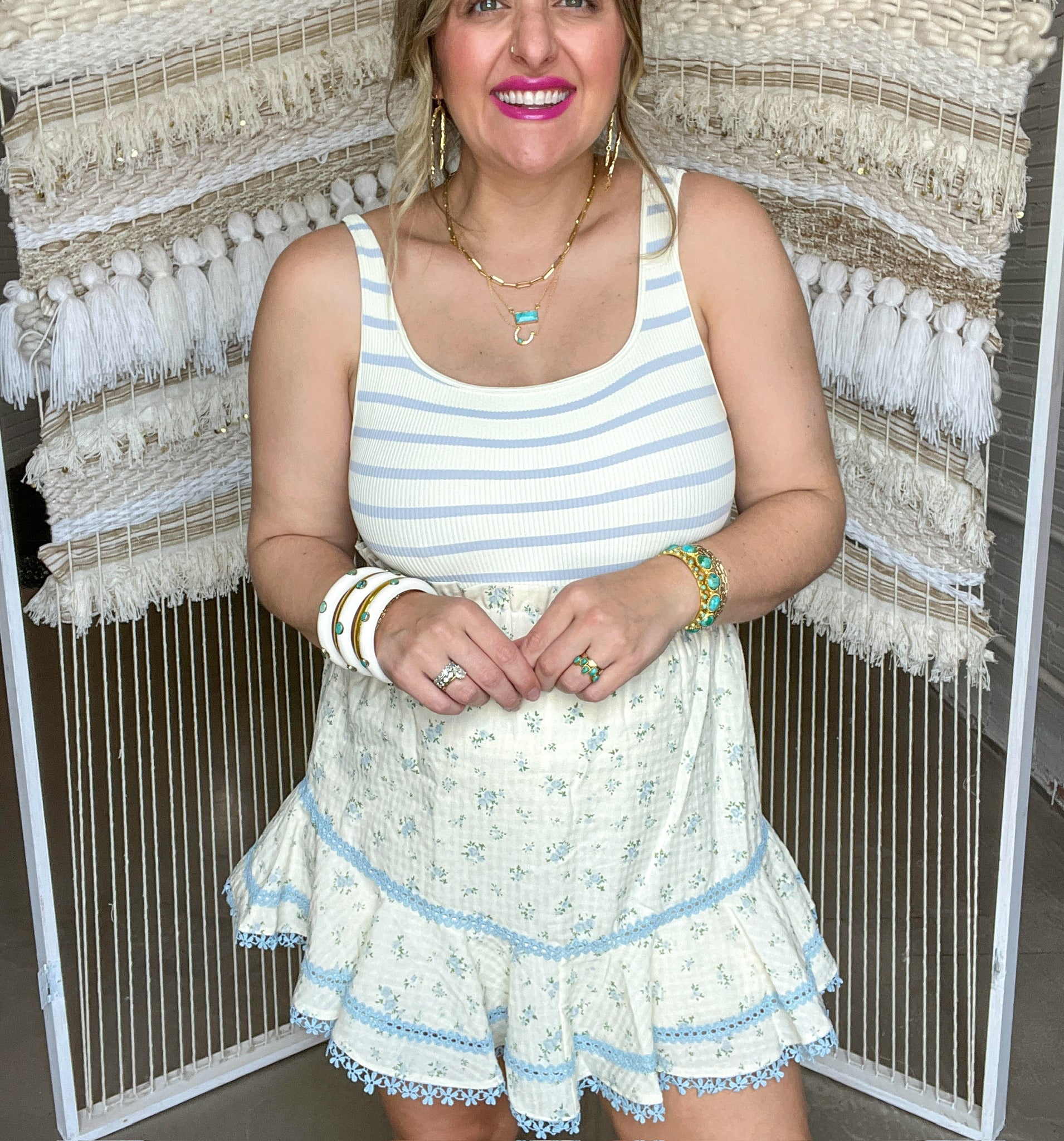 If cottagecore met coquette and they designed the sweetest summer skort—this would be it. Rosalie’s delicate floral print, vintage-inspired lace trim, and breezy ruffled hem are made for slow mornings, bike rides, and twirling through flower fields (or just brunch, your call).