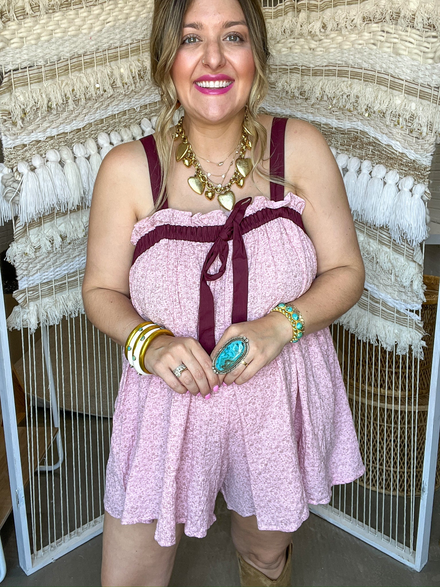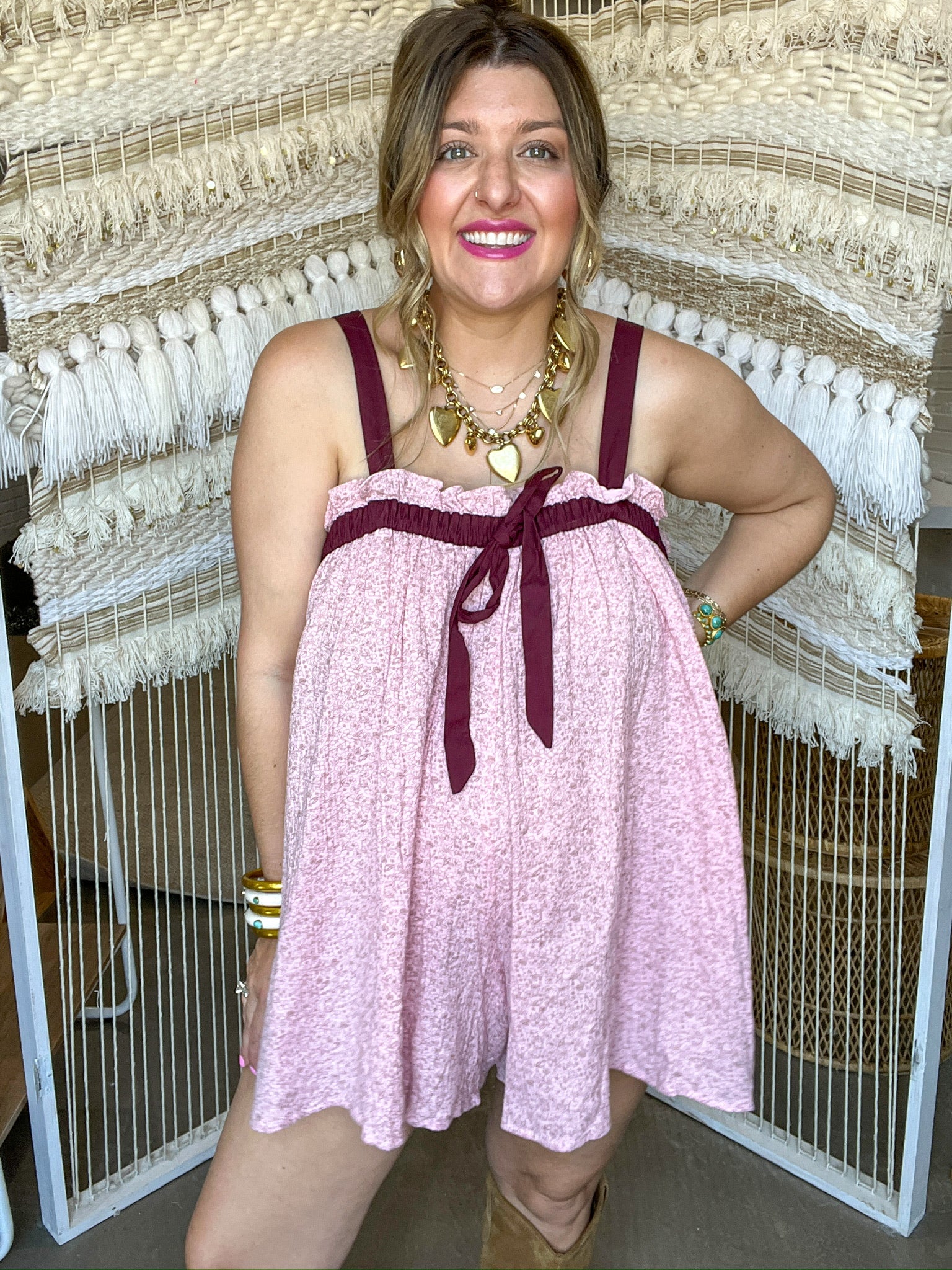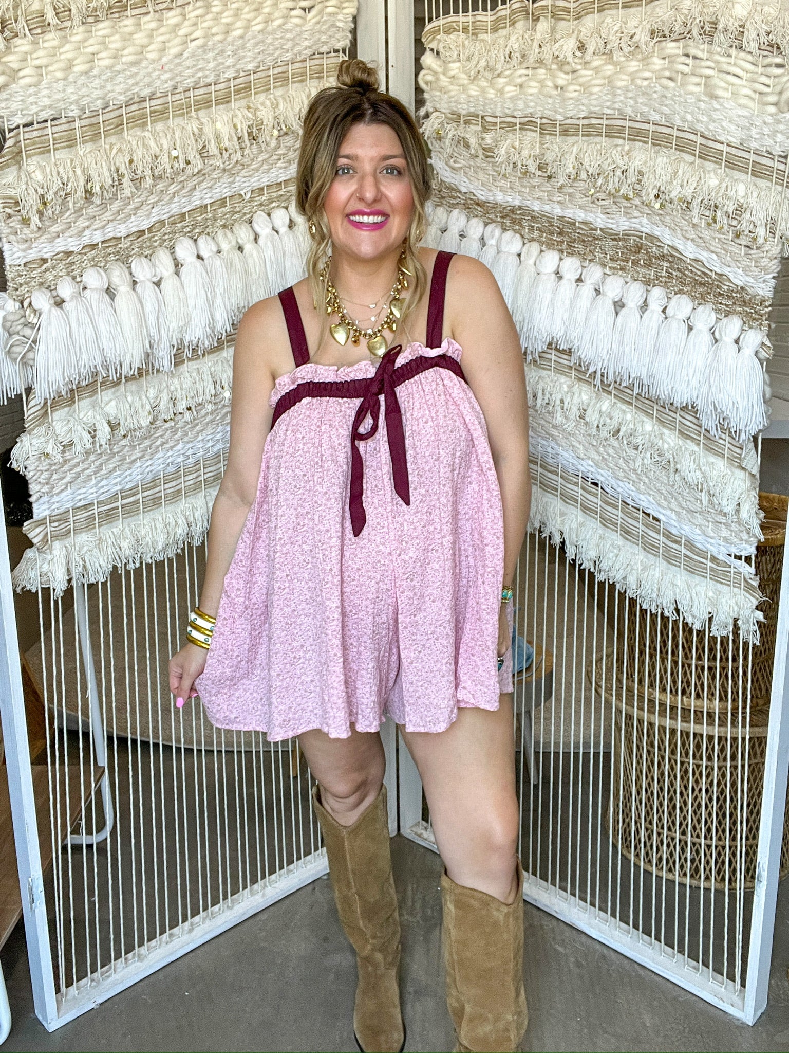 The Rosie Day’s Romper is sweet, spirited, and ready for sunshine. With a button-up front, flattering waistband, and fluttery sleeves, this one-and-done wonder was made for everything from coffee runs to country concerts. The soft pink hue and feminine fit give it that perfectly flirty feel—like something straight out of a small-town summer romance (cue the montage).