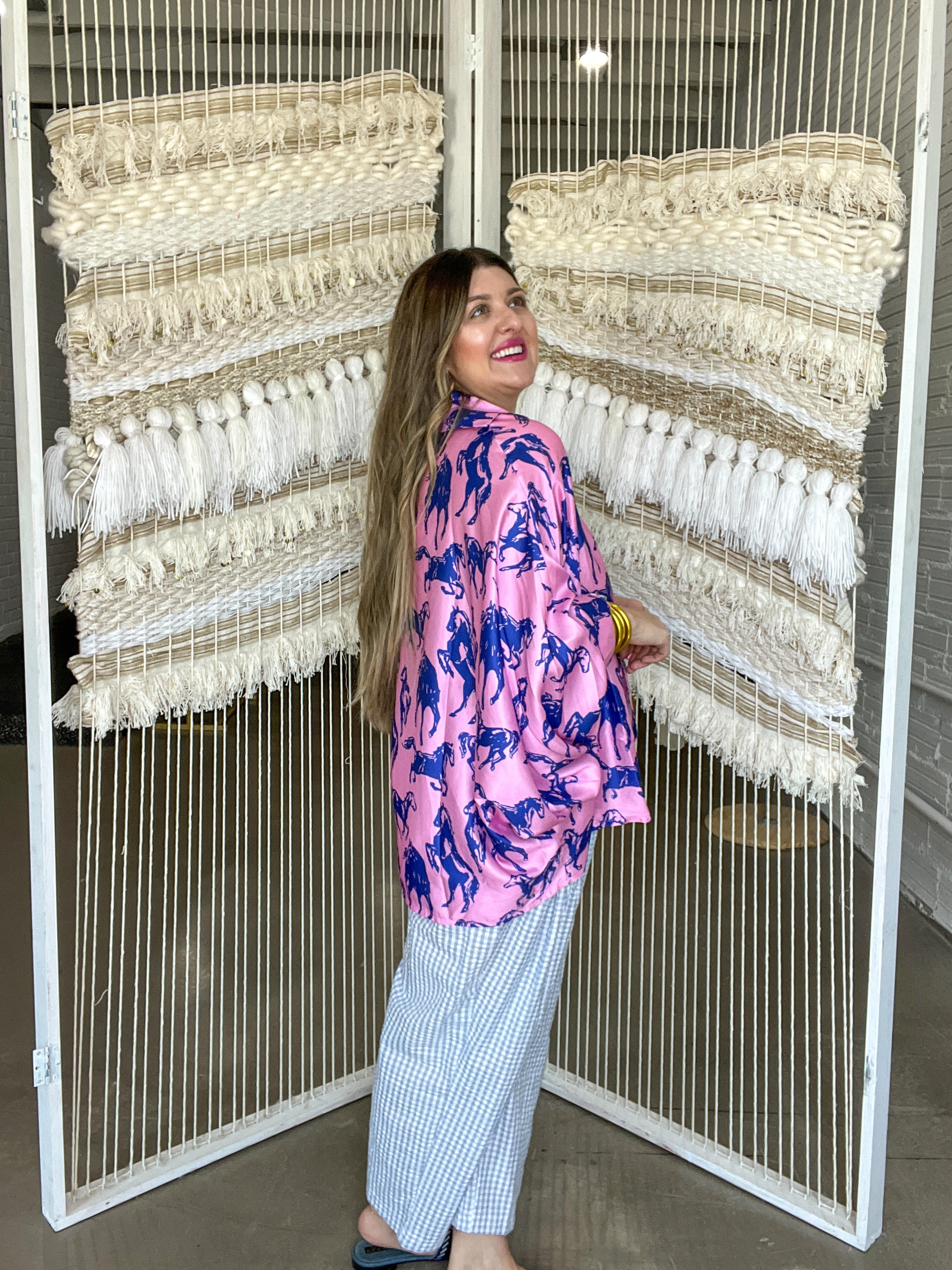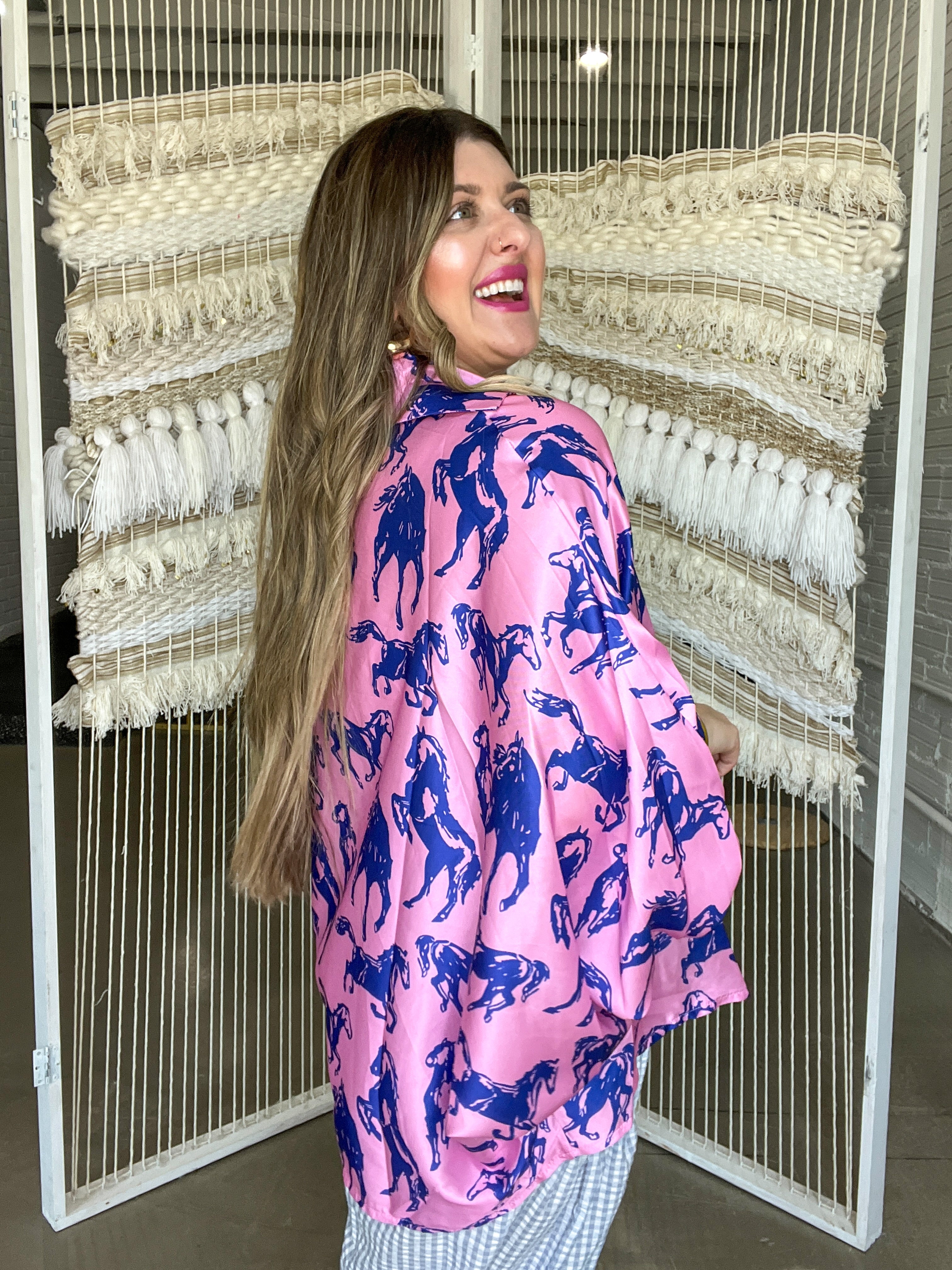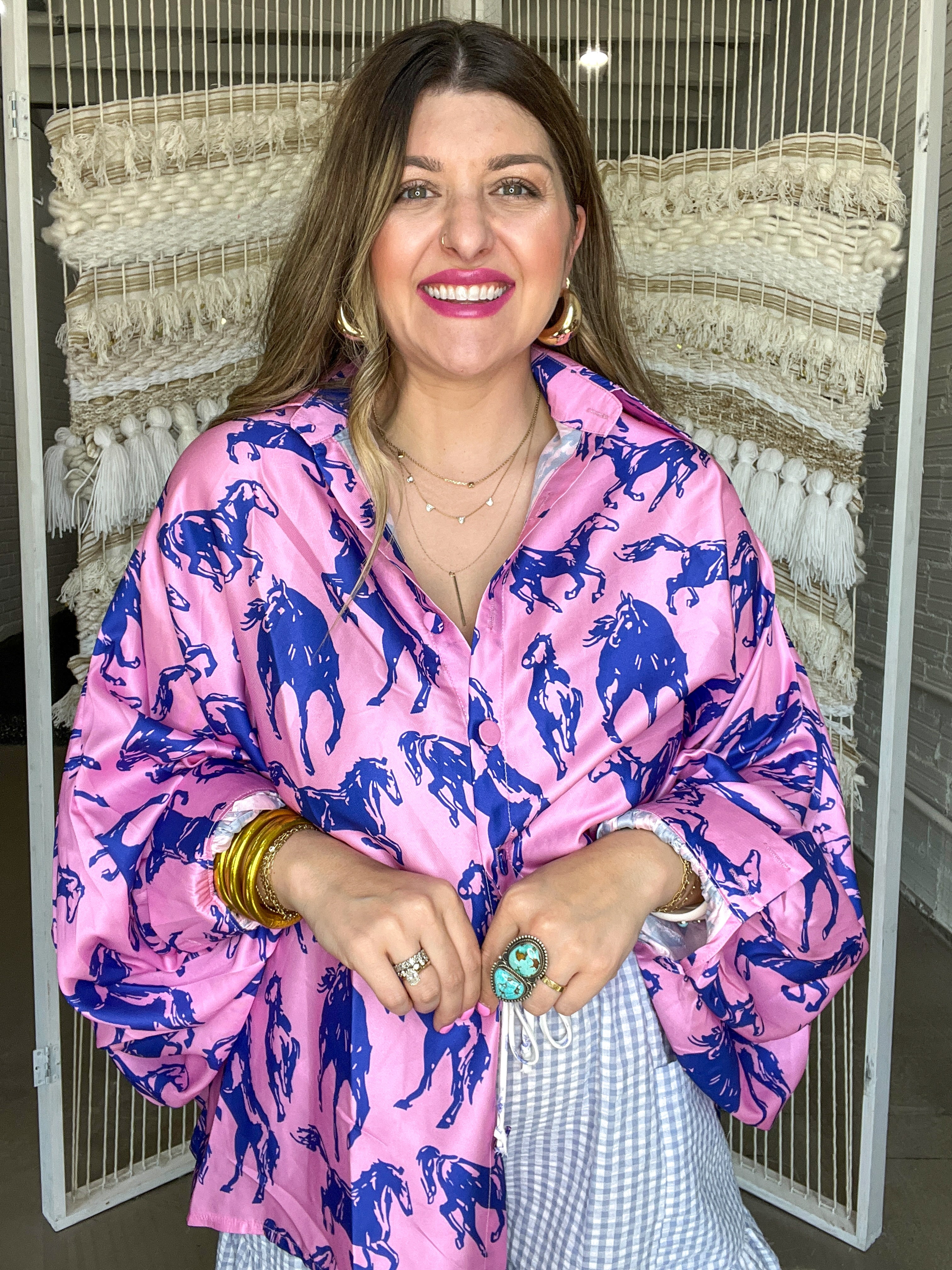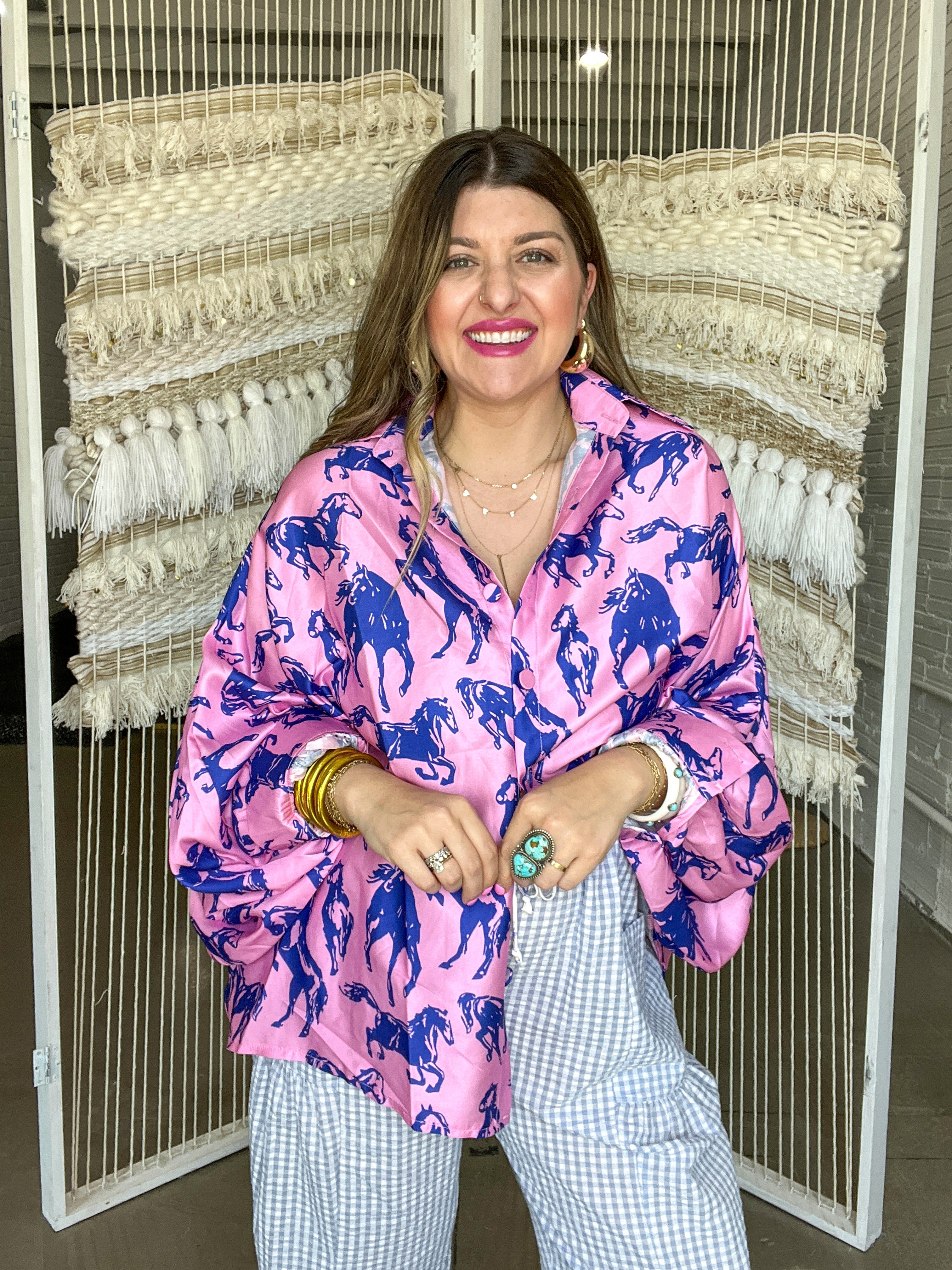 Out of stockRunning Horses Oversized Blouse Top - Pink + Blue