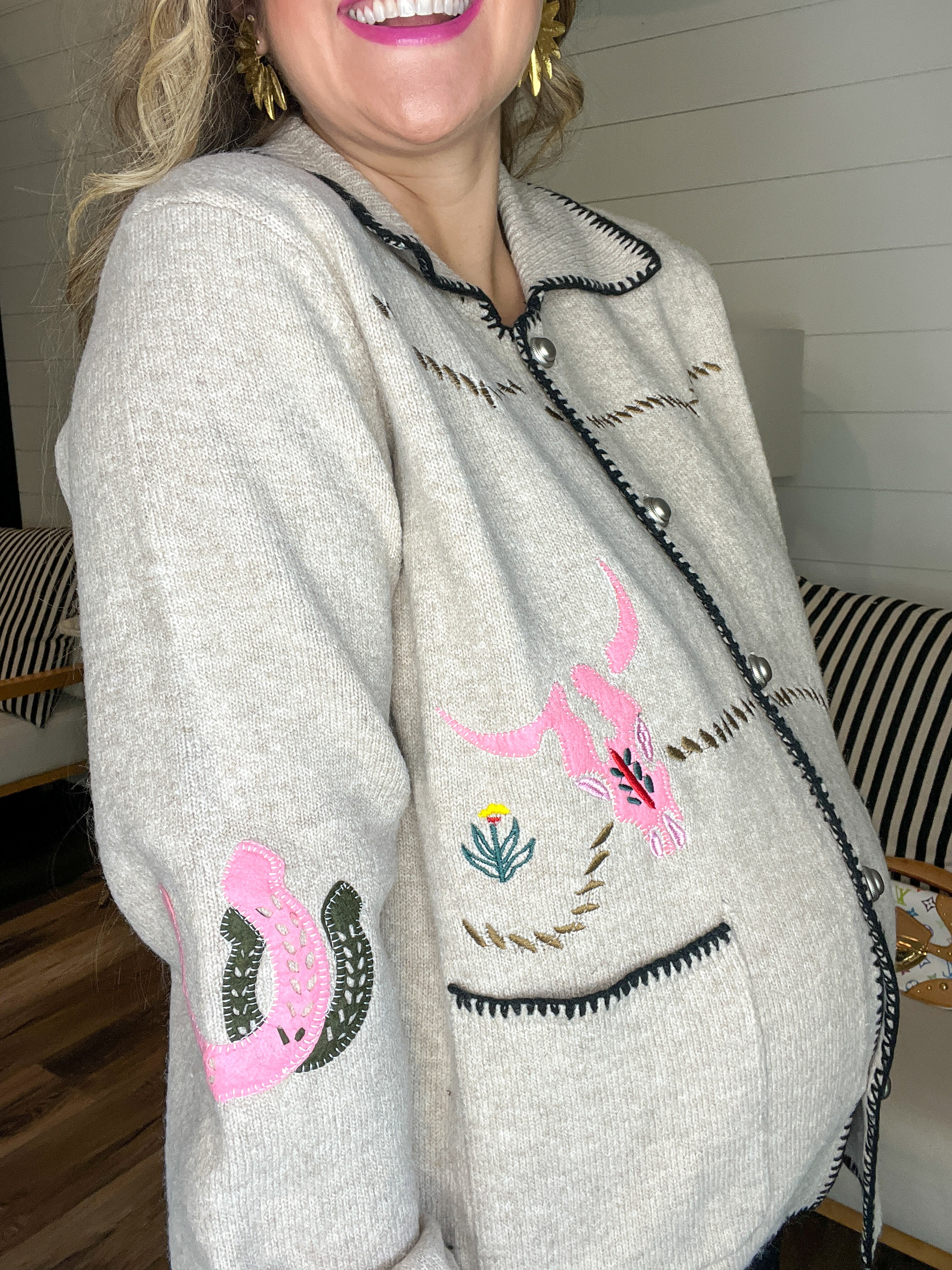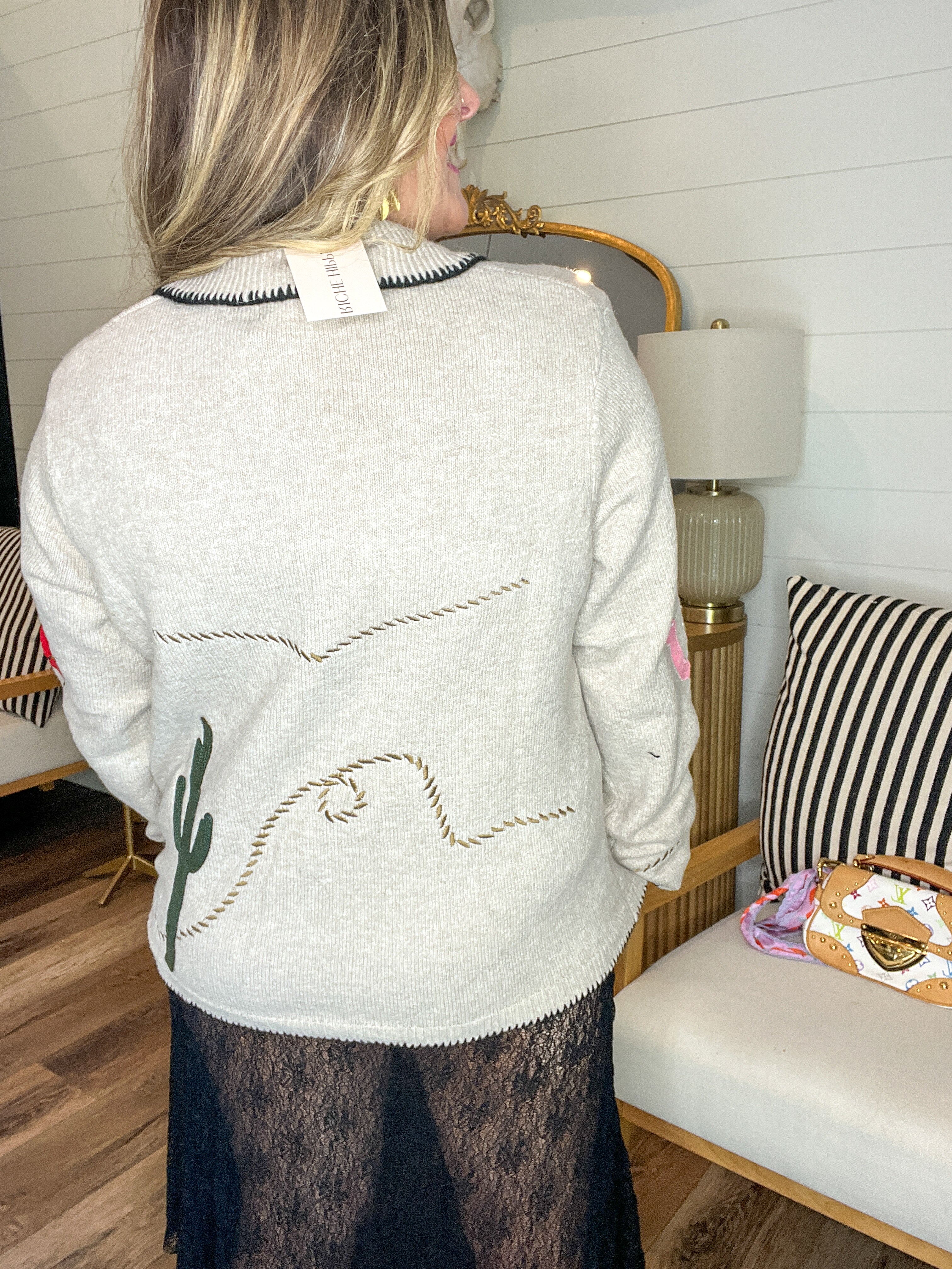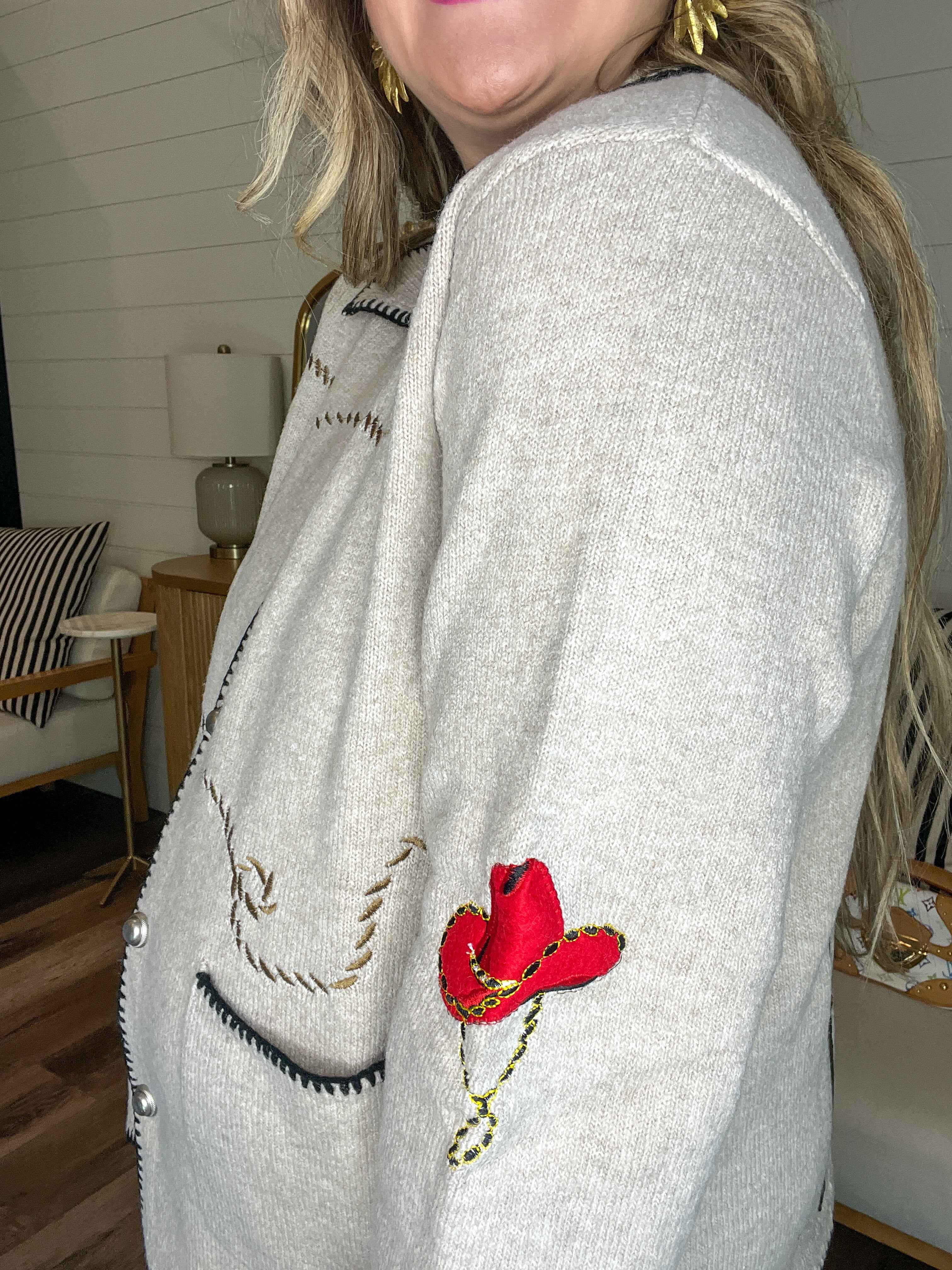 Western charm meets granny-core chic, and we’re obsessed. The Saddle Stitch Sweater Jacket is your new favorite layer: detailed like a storybook and stitched with cowgirl dreams. Think porch chats, prairie skies, and a whole lotta personality—buttoned up and ready to ride.