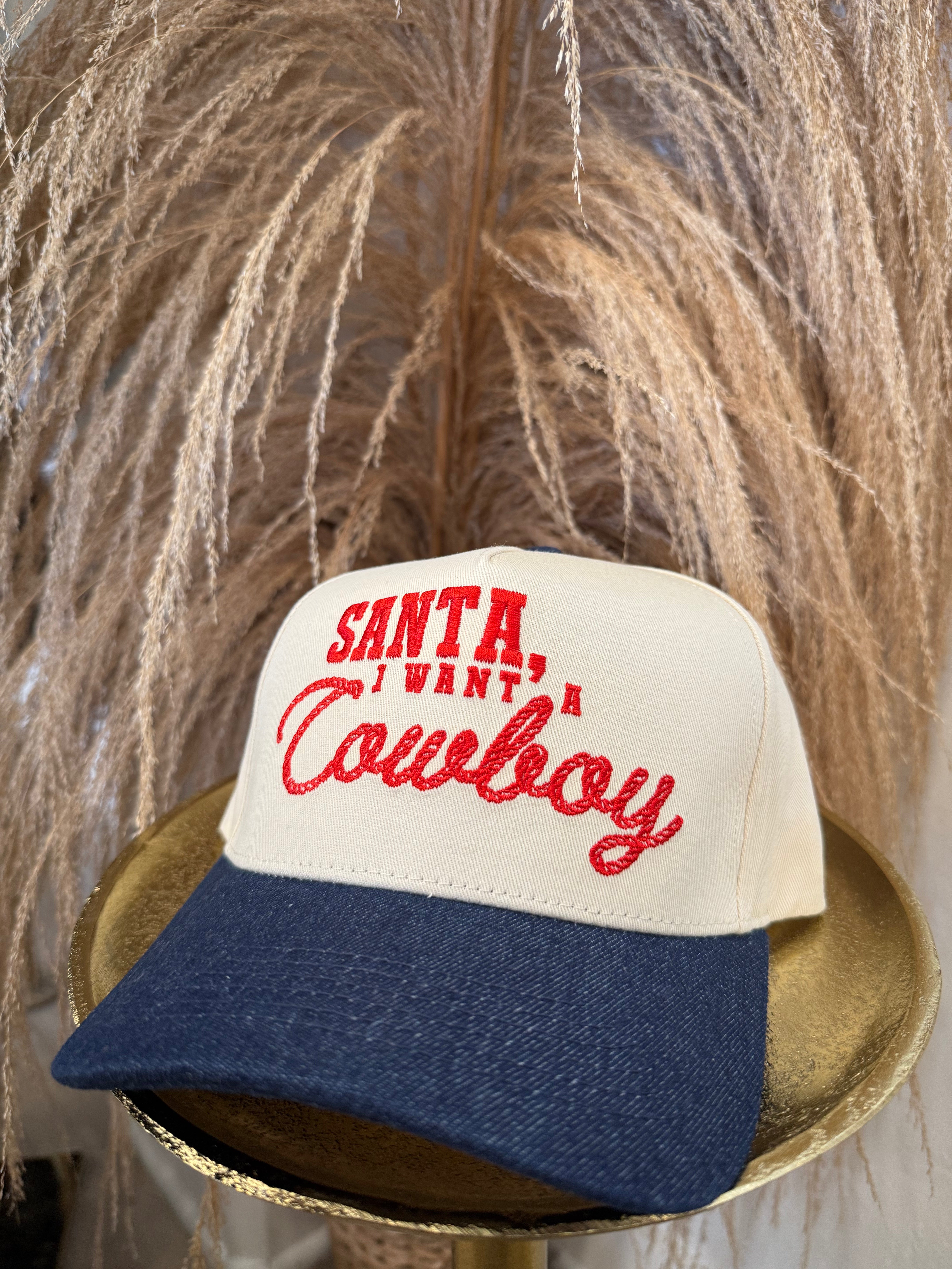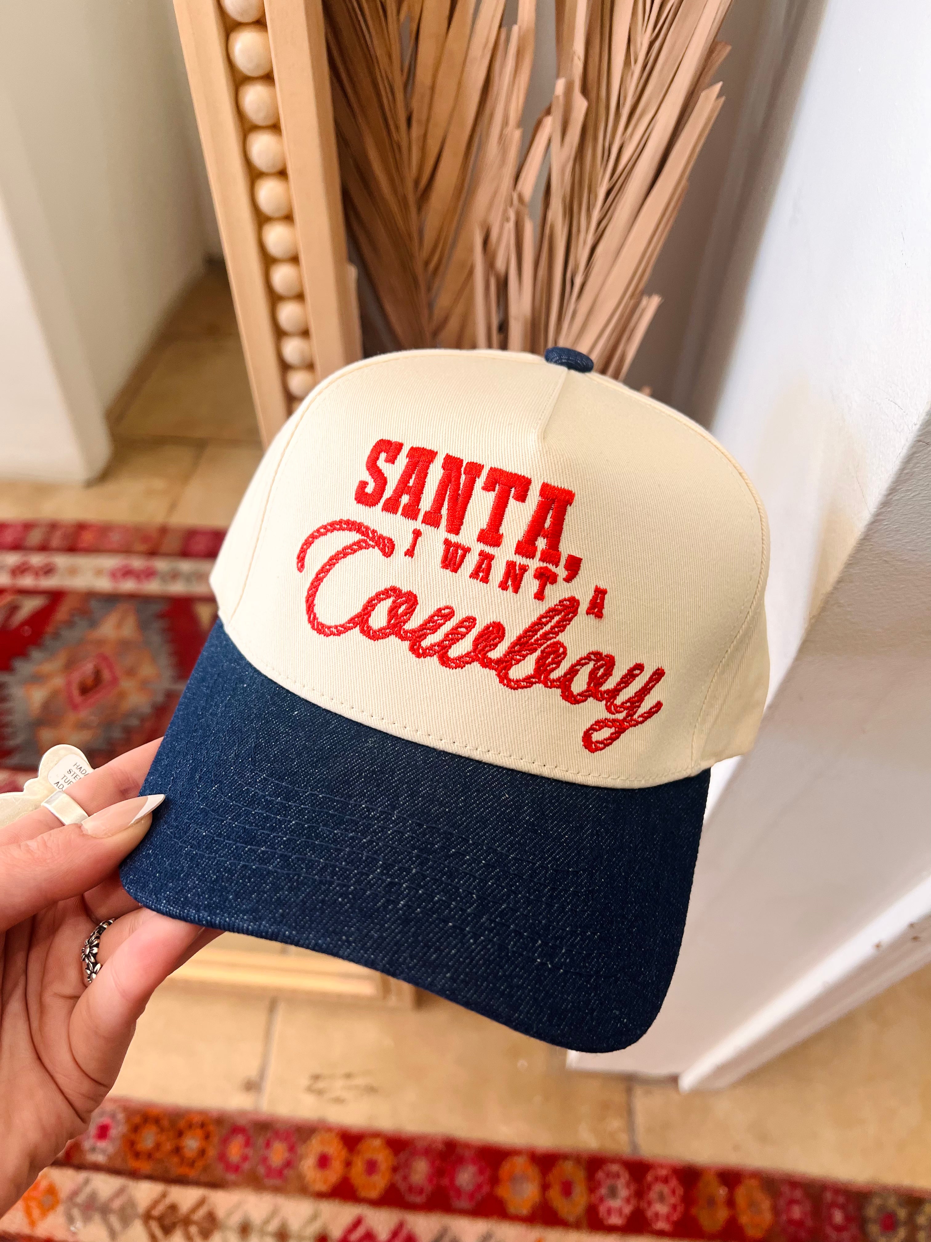 • Bold red “Santa, I want a Cowboy” embroidery—equal parts playful + iconic