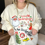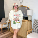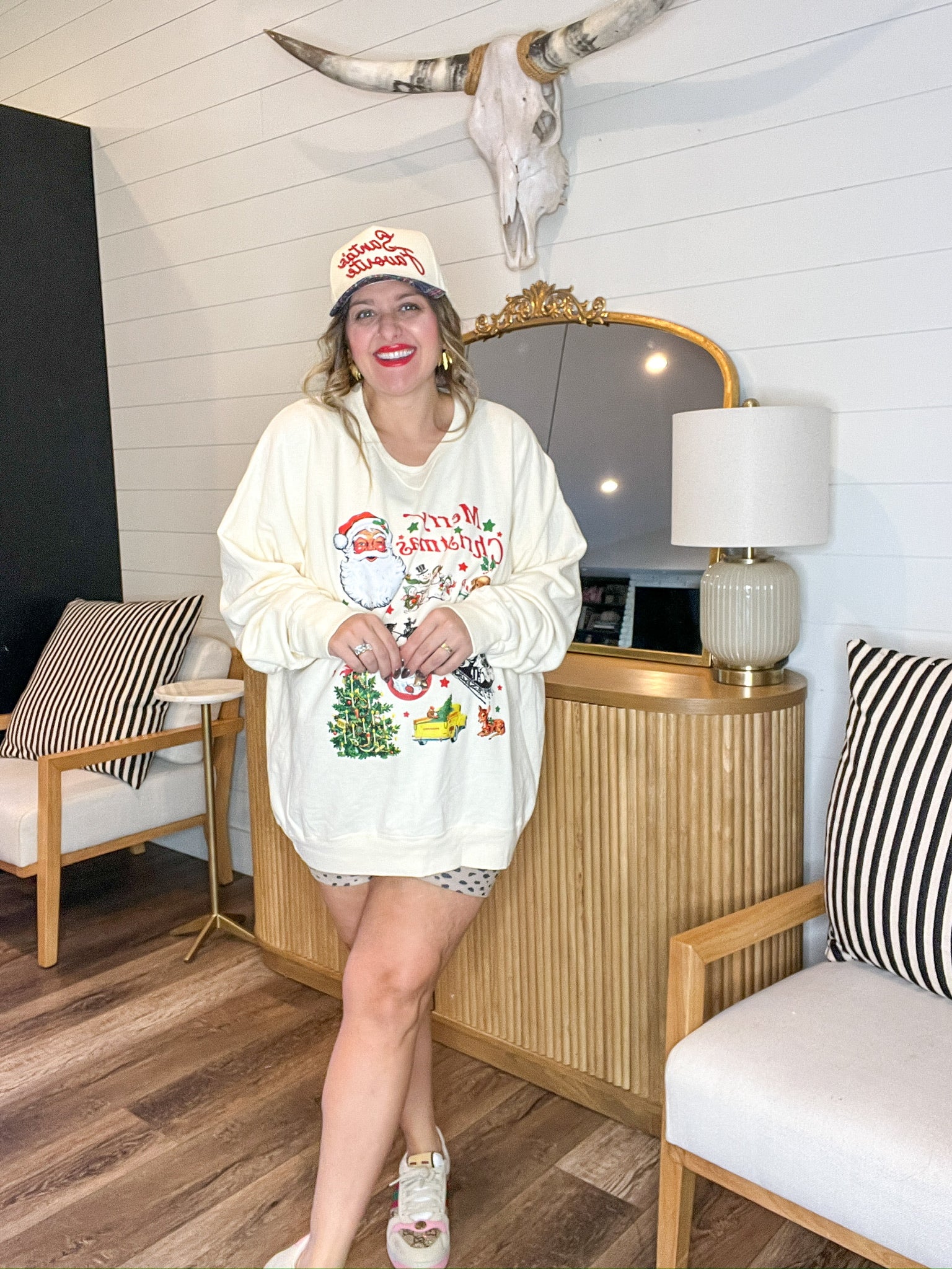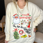 A nostalgic sleigh ride straight into your childhood Christmas dreams. This ivory crewneck is decked out in the cutest retro print—Santa, snowmen, a holly pup, and candy canes galore. It’s basically what hot cocoa tastes like in sweatshirt form.
