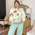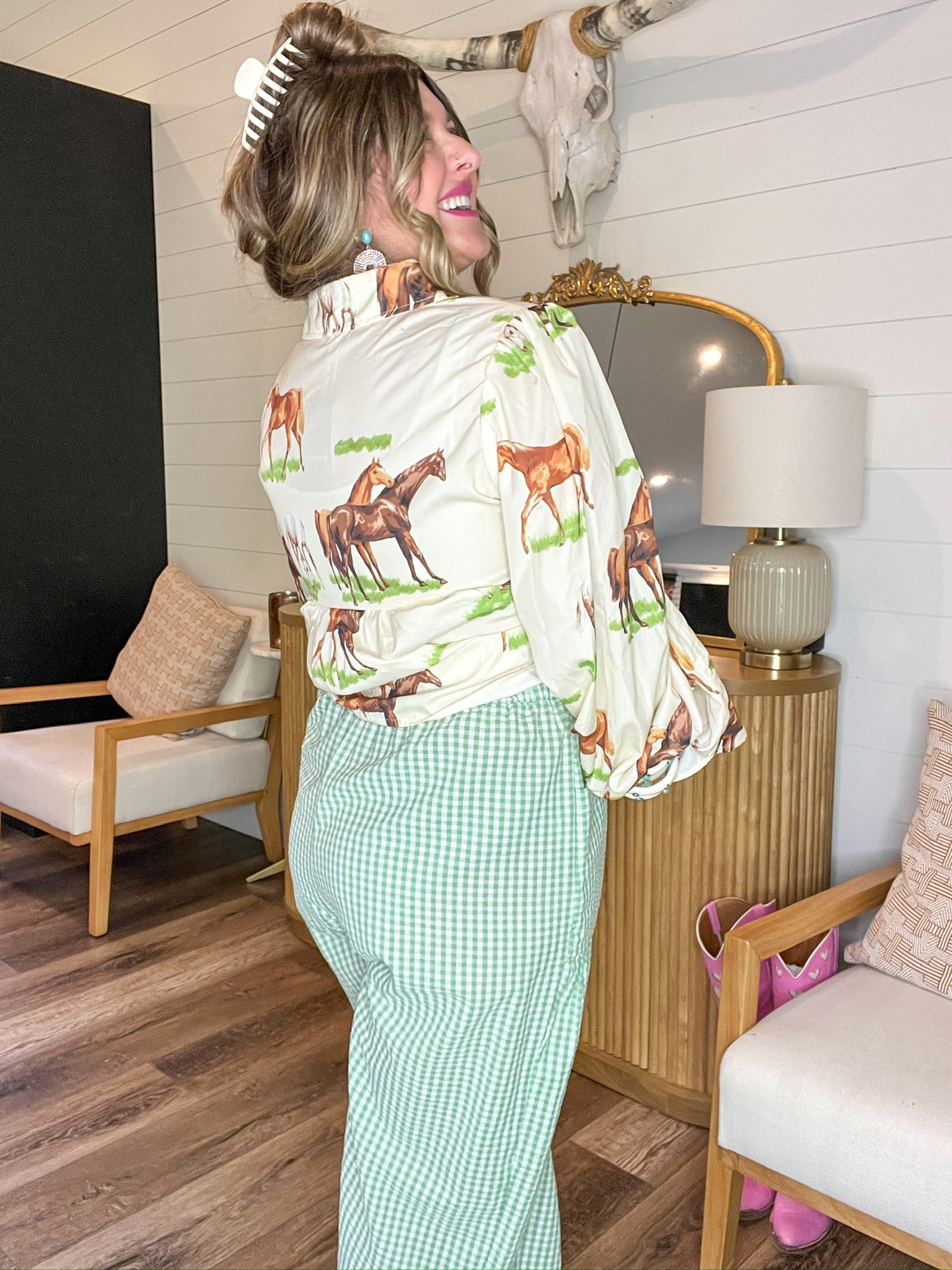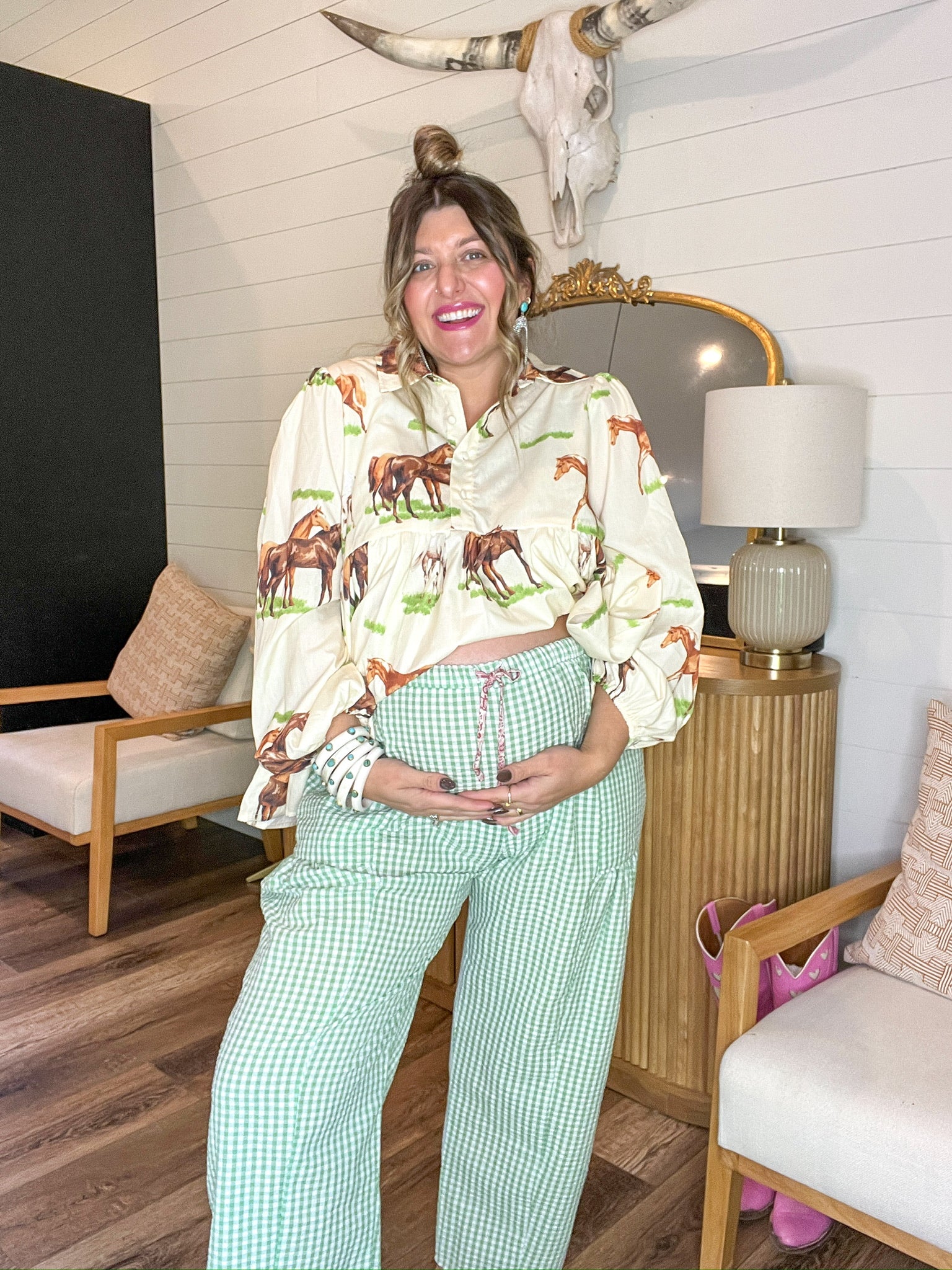 Like a picnic tablecloth… but make it fashion. These green gingham drawstring pants bring fresh air to your closet—think front porch lounging, farmer’s market wandering, and “oops, I accidentally matched the salad” moments. The tiered seams and breezy seersucker texture keep things light and easy, while the adjustable waistband makes sure comfort never takes a backseat.