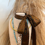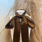 Hand drawn art on a beautiful silk twilly with a crochet trimmed edge.