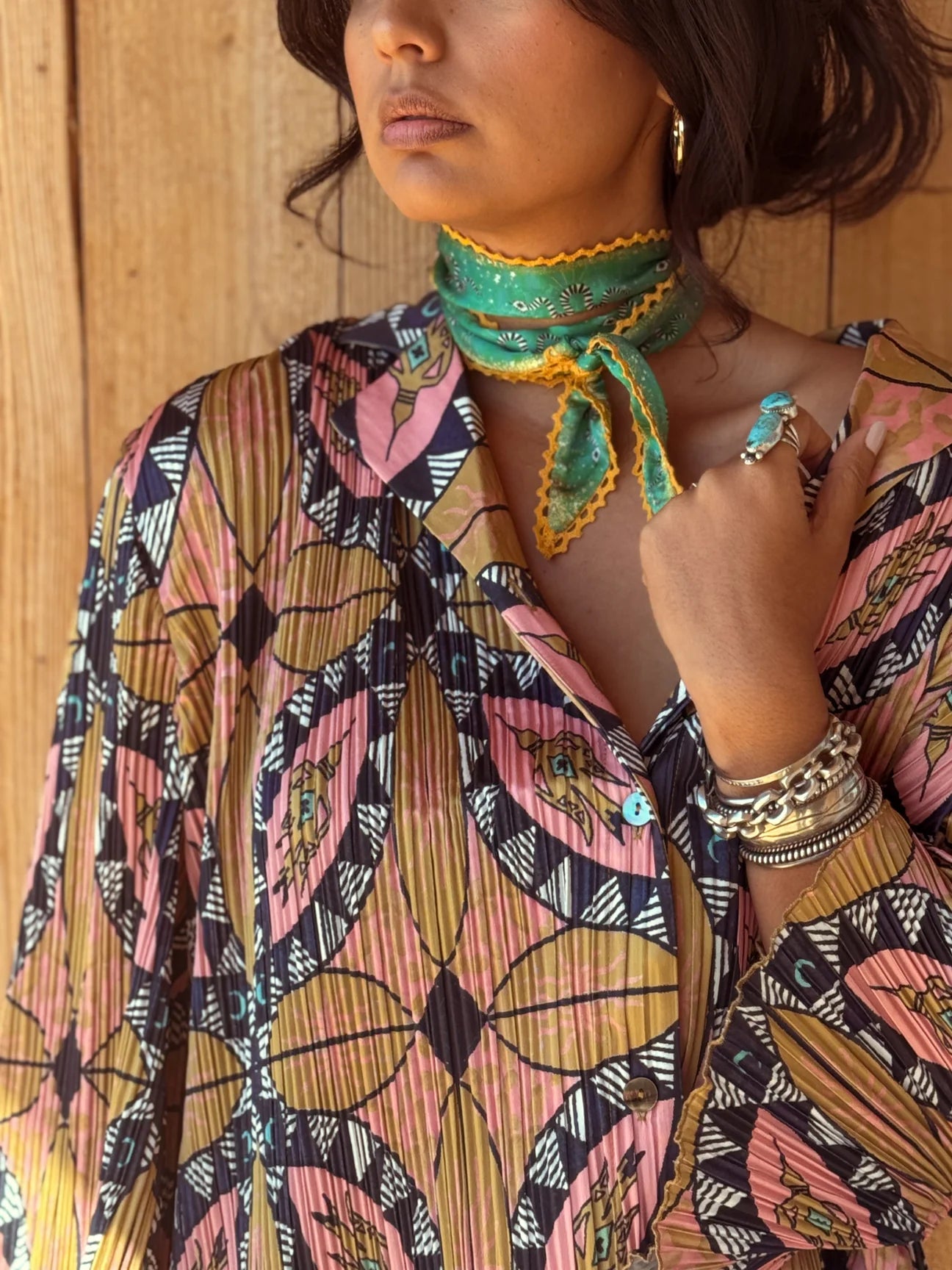 Hand drawn art on a beautiful silk twilly with a crochet trimmed edge.