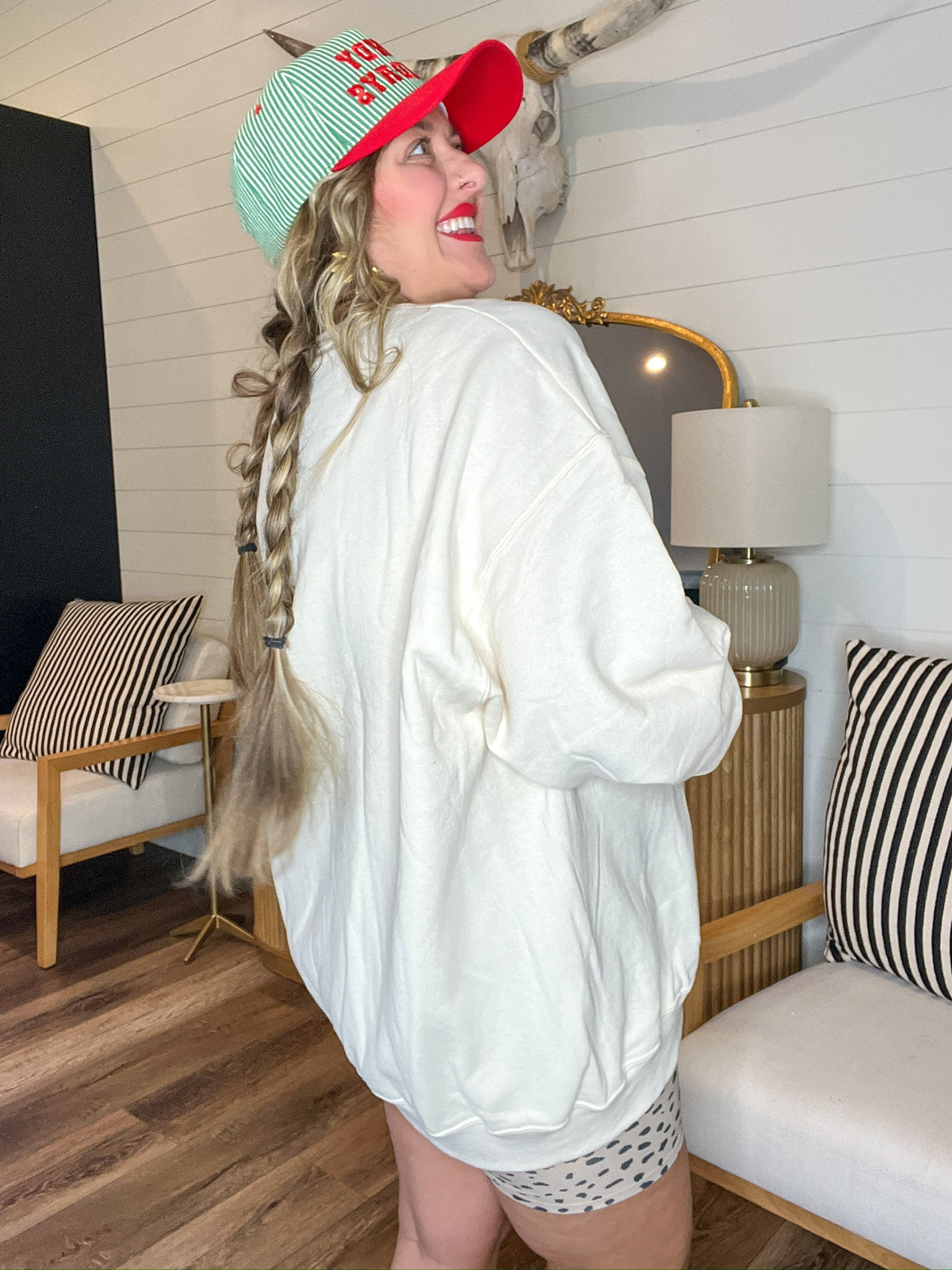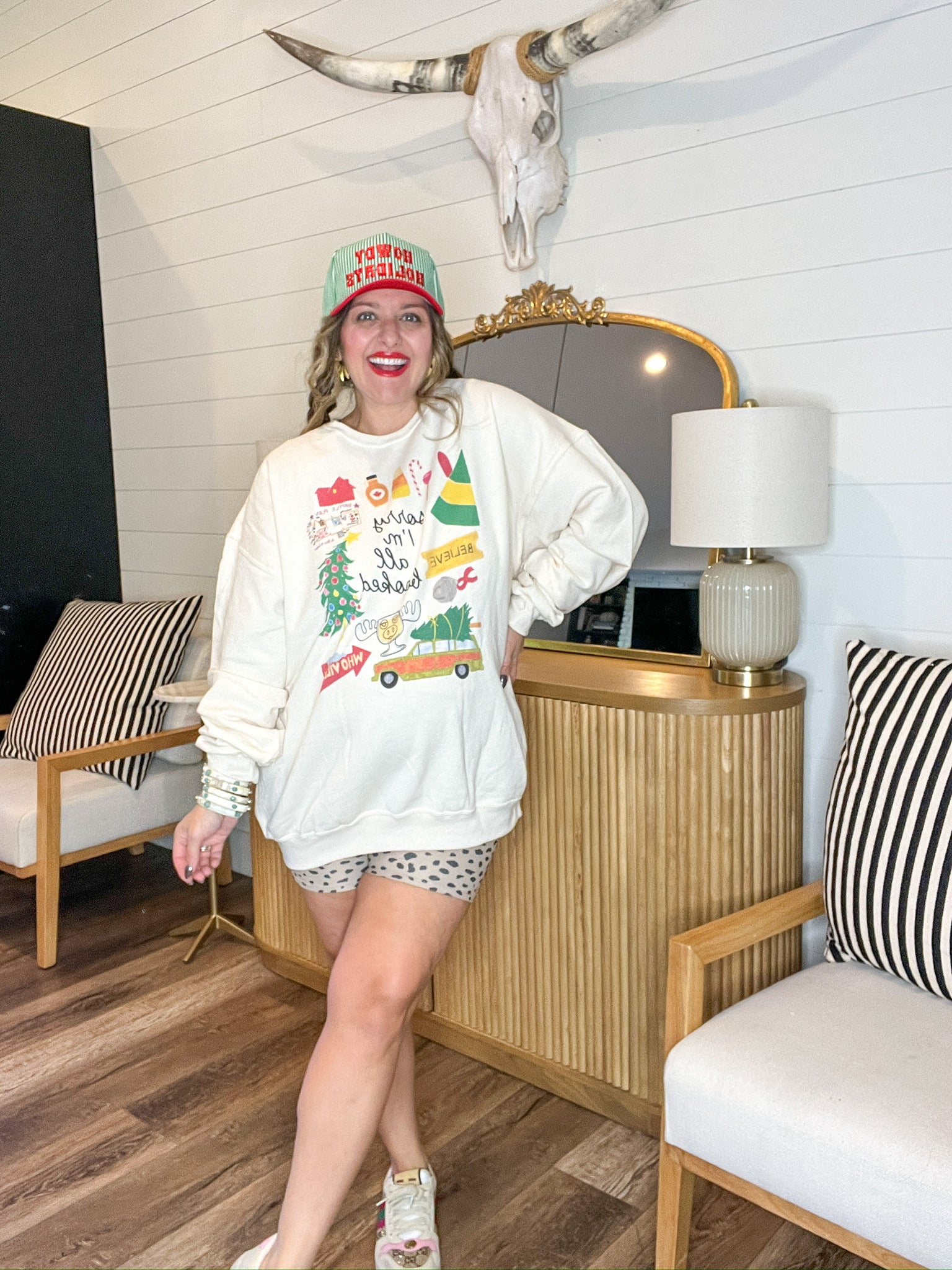 Pair it with buffalo plaid jammie pants, wide-leg jeans, or polka dot lounge shorts (trust us-cute.) Throw on a "Christmas Enthusiast" hat & you're the whole holiday mood.