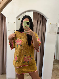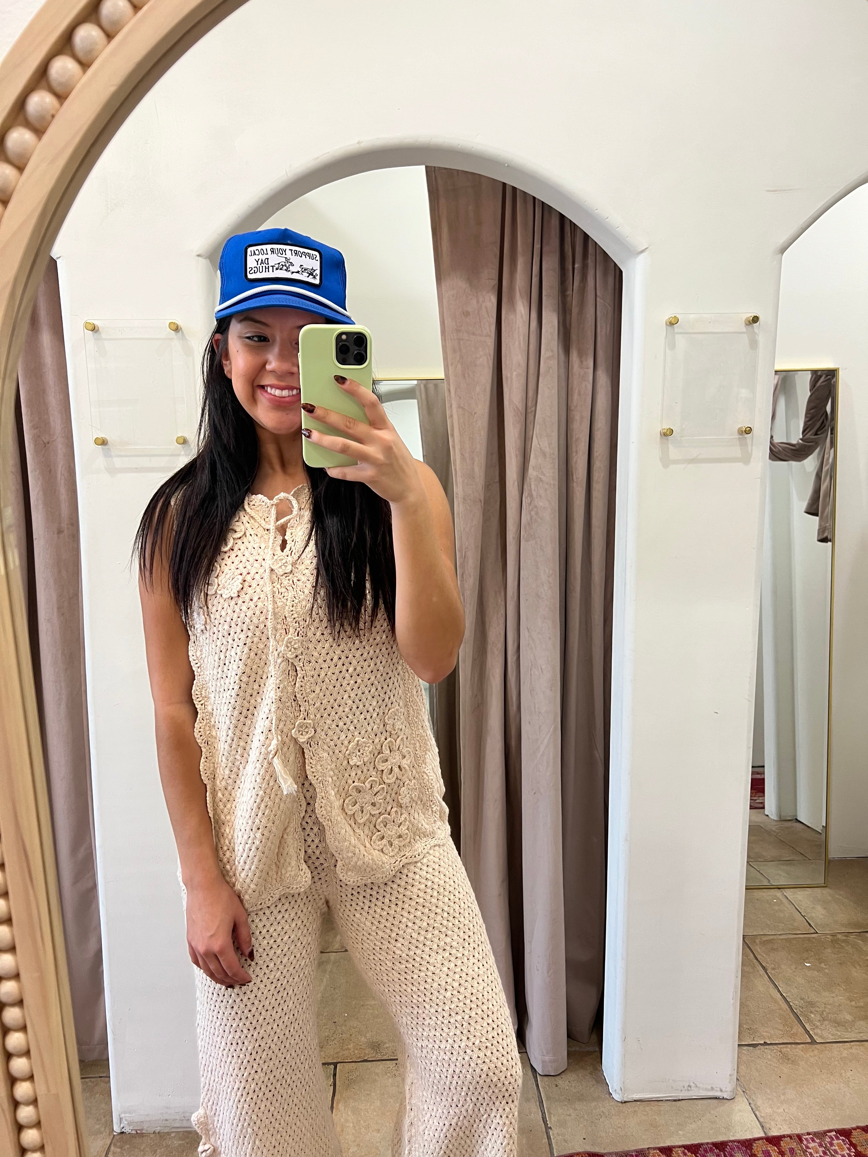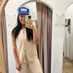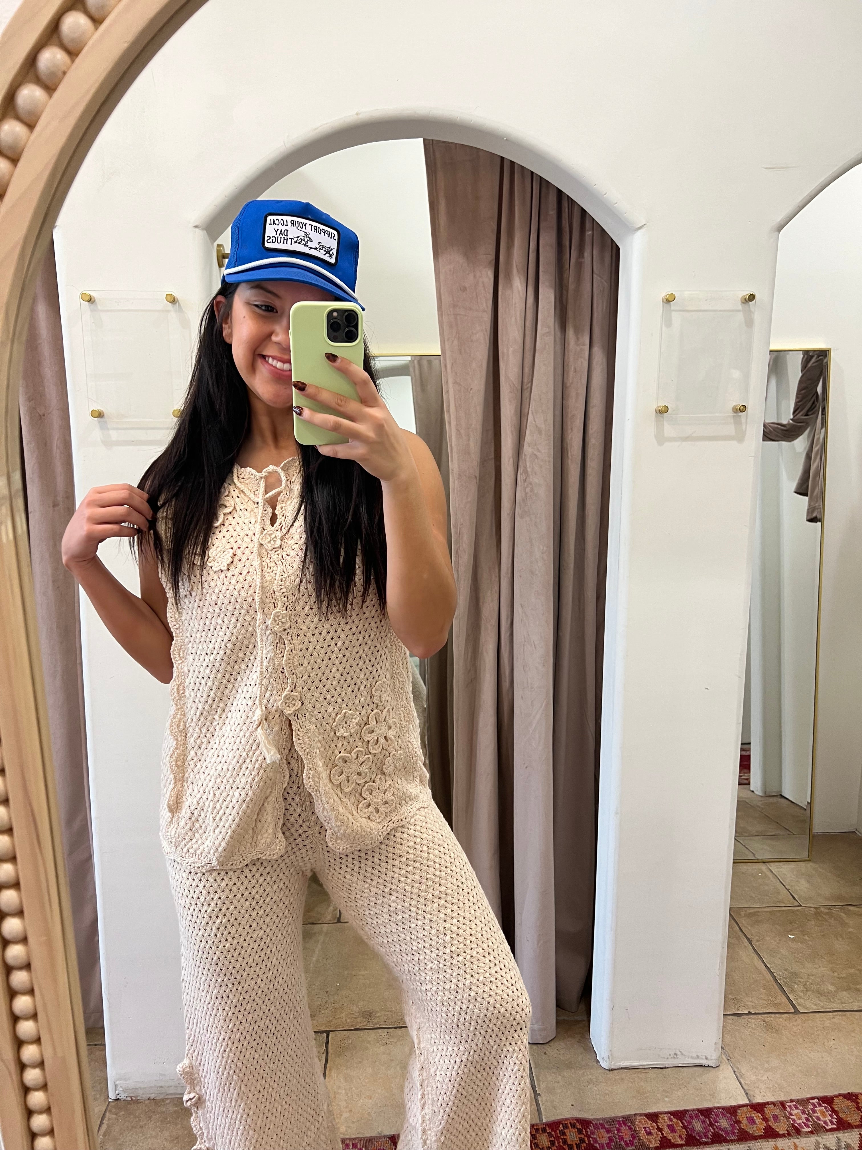 The Paradise Found Pant in Sand Dune celebrates effortless cool with a fresh, playful vibe. Crafted from a true knit blend of recycled and organic cotton, it features a comfy elastic waist and a delicate scalloped hem that adds a flirty finish. Unlined and breezy, these pants are designed to pair perfectly with the matching Paradise Found Vest. With a relaxed fit that runs large, we recommend sizing down for a sleek, flattering silhouette that moves with you.