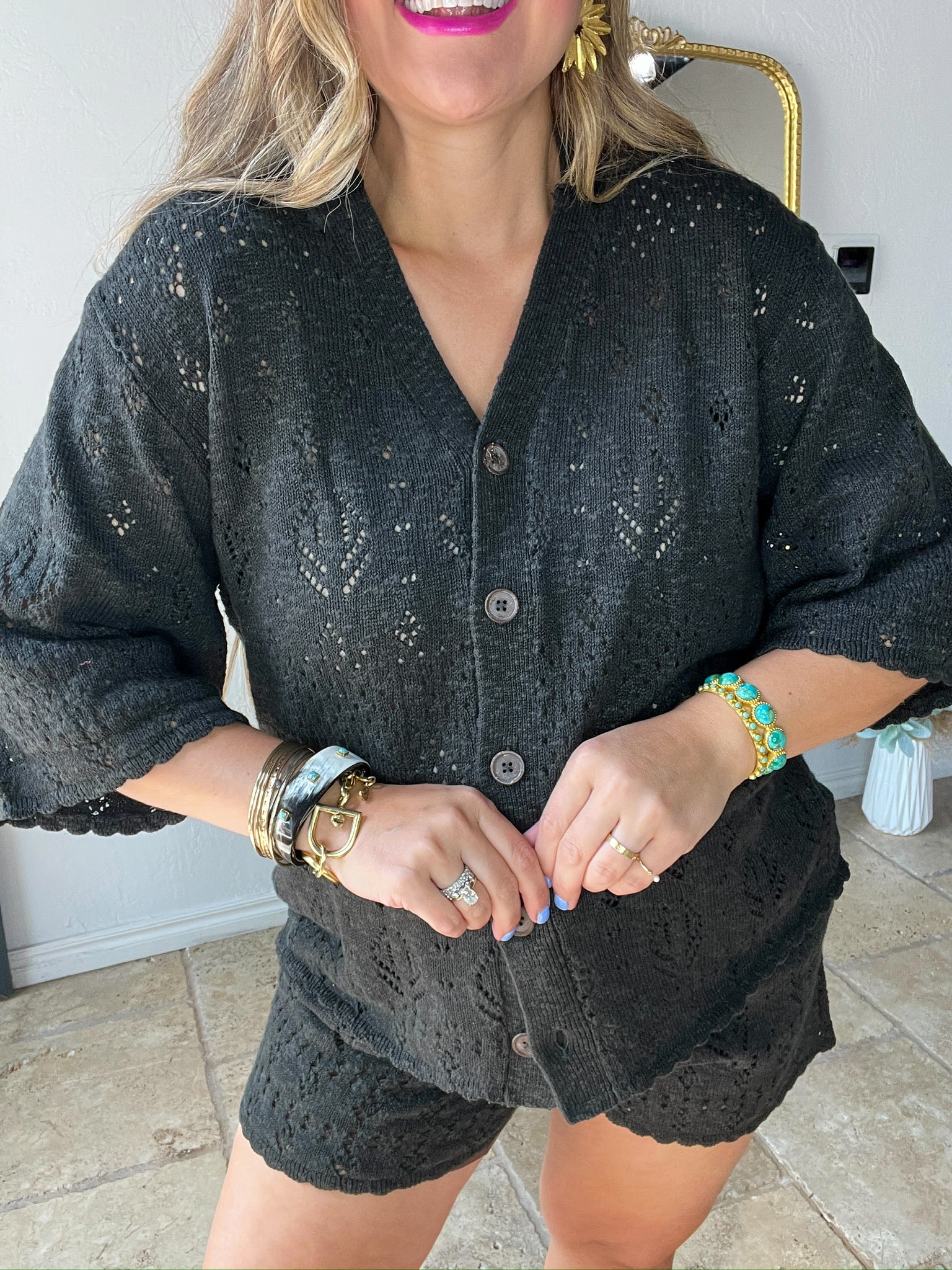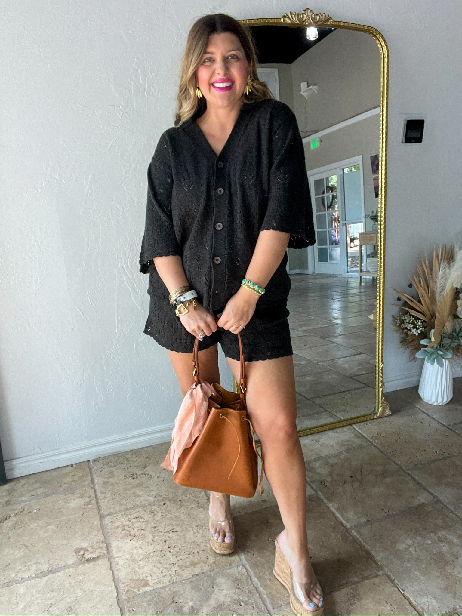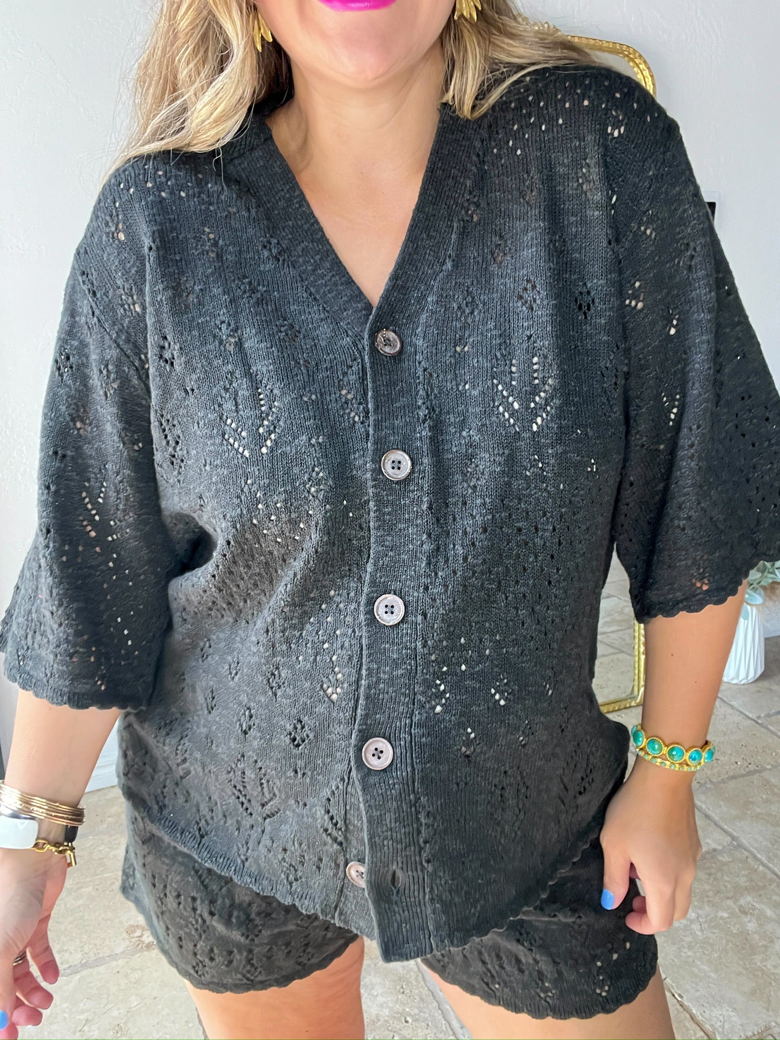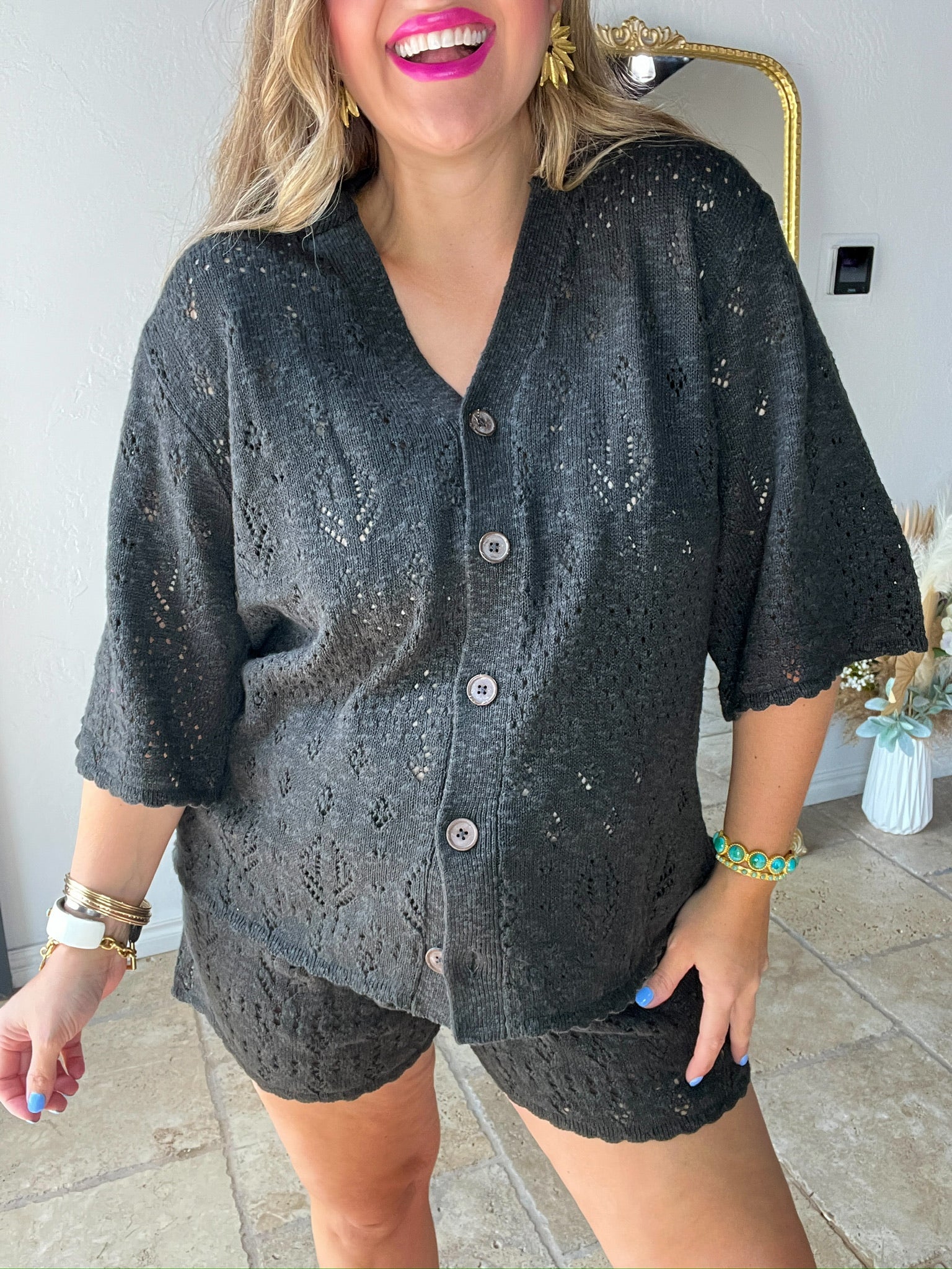 Easy like a Sunday morning, elevated like a capsule closet staple. The Rhodes Knit Shirt in Onyx is made for golden hour lounging, breezy market mornings, and throw-it-on-and-glow days. With its delicate pointelle knit and effortless drape, this shirt feels like quiet luxury in outfit form.