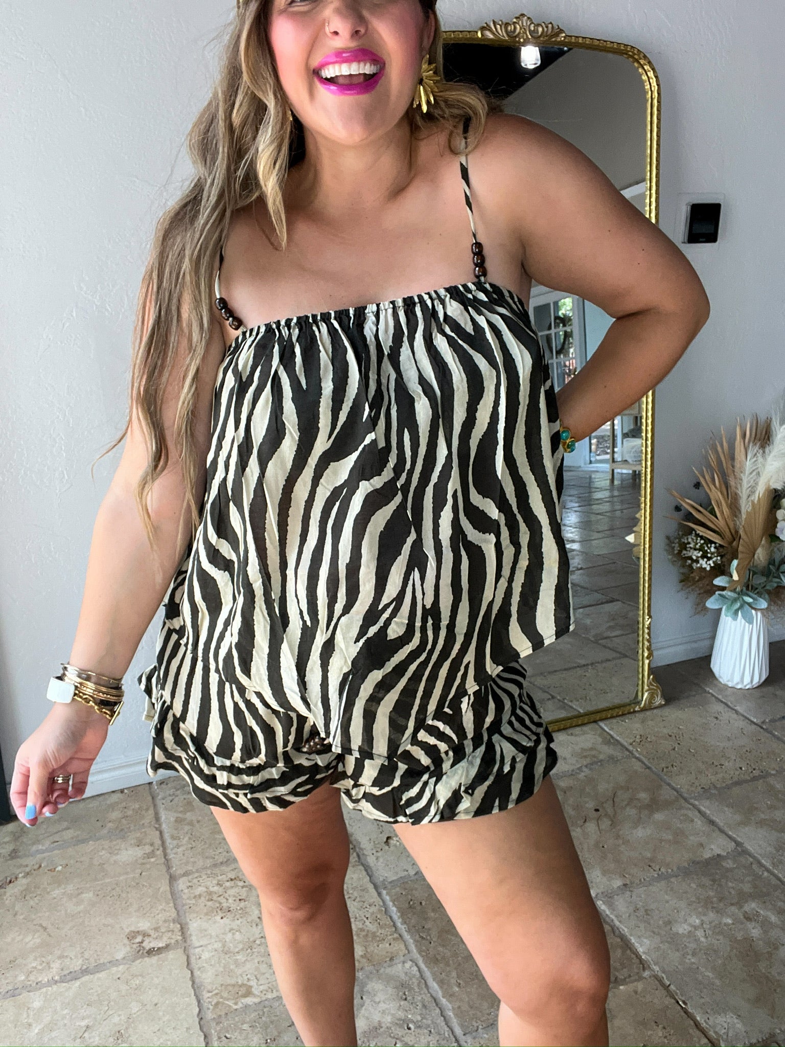 These shorts are giving main character on safari—minus the bugs, plus the glam. The Zevra Shorts from Spell blend playful edge with comfy wear-all-day vibes. With a soft, flowy drape and elastic waist, they’re just as perfect for road trips and pool hangs as they are for date night styling with the matching cami.