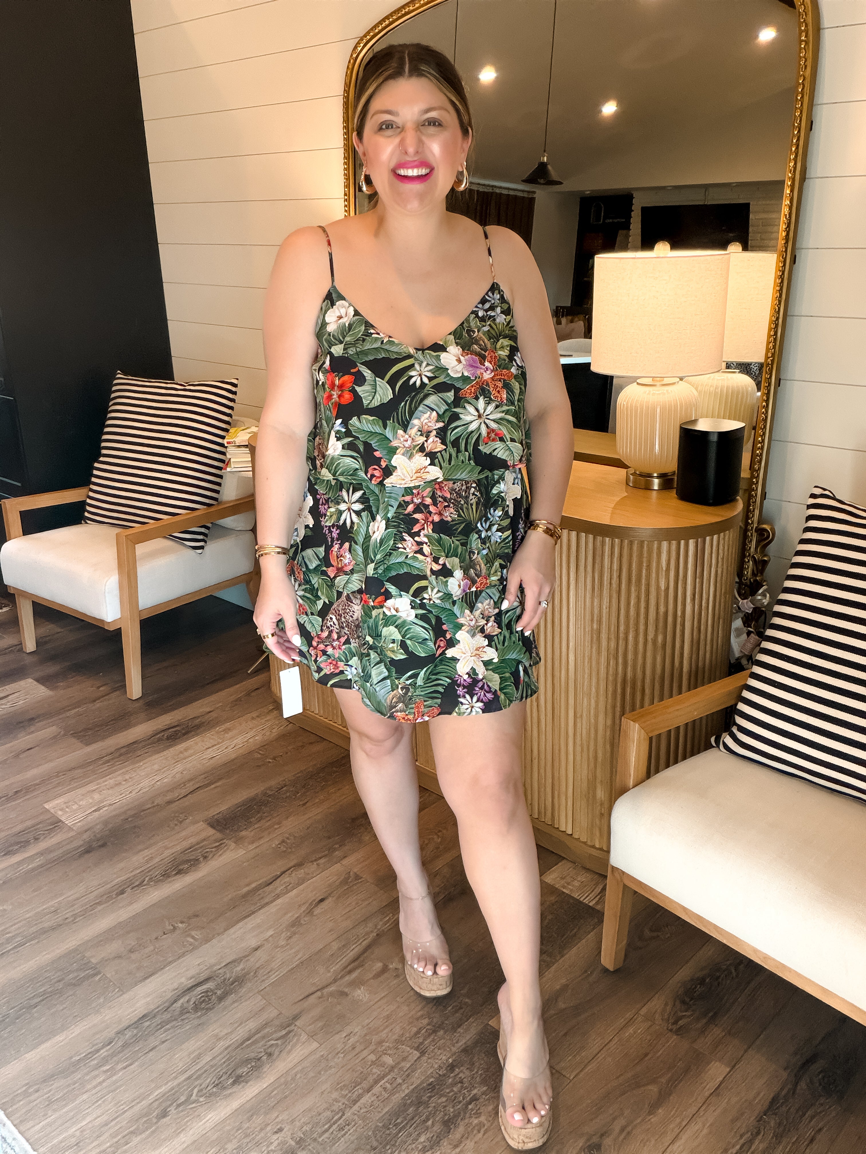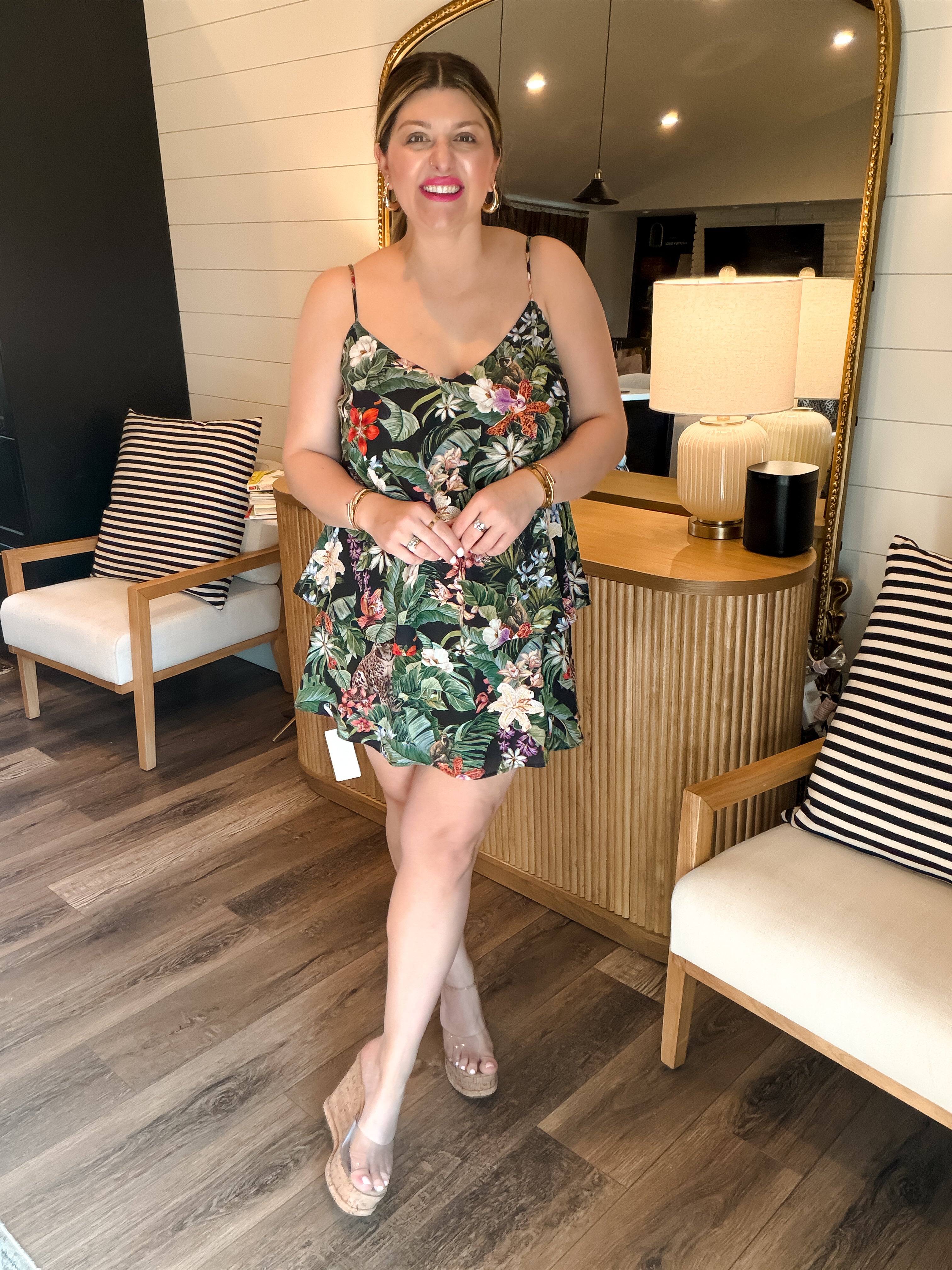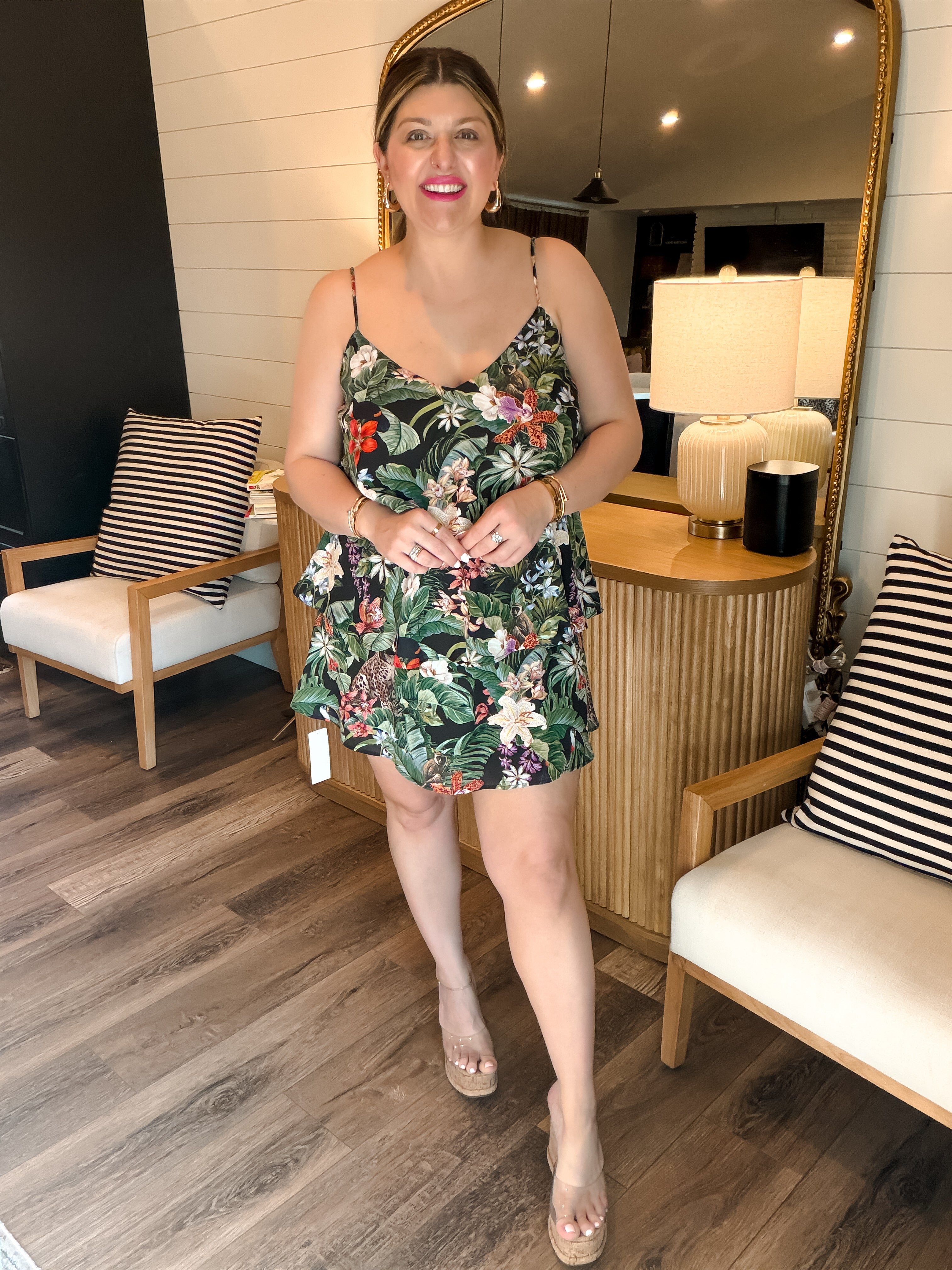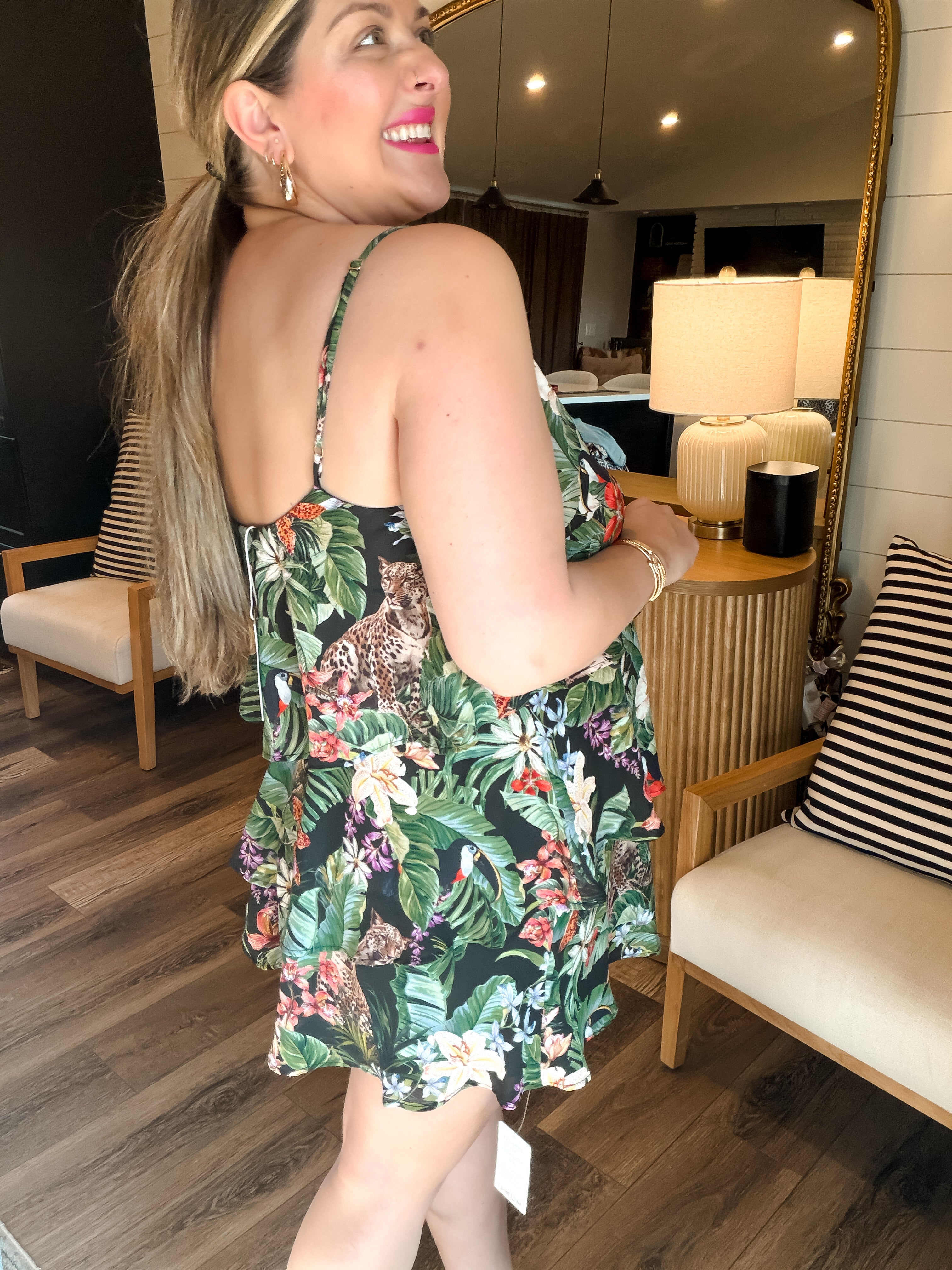The Suarez Ruffle Dress in Jungle Mirage is your go-to for tropical charm. Featuring a vibrant jungle-inspired print, delicate spaghetti straps, and playful tiered ruffles, this lightweight dress is perfect for warm days, vacations, or brunch with the girls. Effortless, flattering, and full of color—this piece was made to stand out.