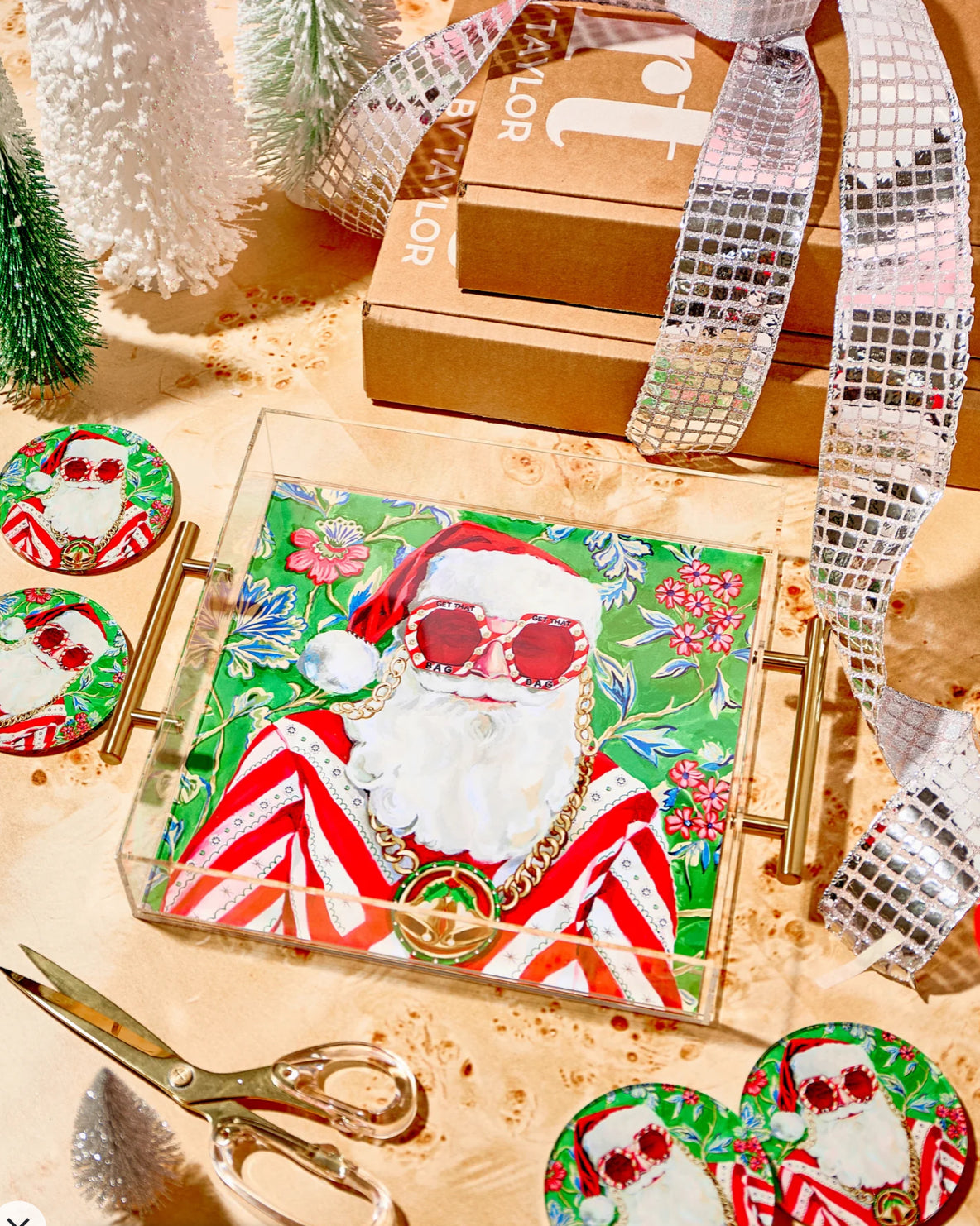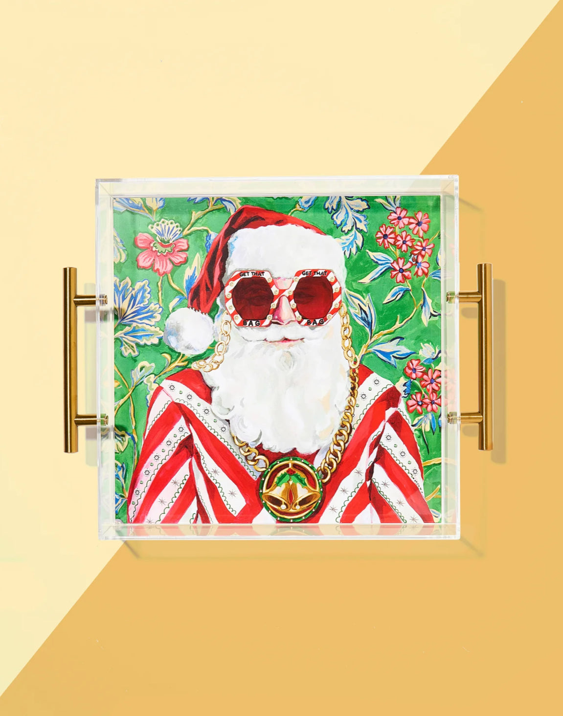 Serve up some serious style this holiday season with our Swanky Santa Large Tray! This acrylic tray features a playful depiction of Santa, perfect for adding a touch of fun to your holiday decor. Whether used for serving drinks or as a festive centerpiece, this tray is sure to be a hit with guests! Artwork by the amazing, Heather Perry.