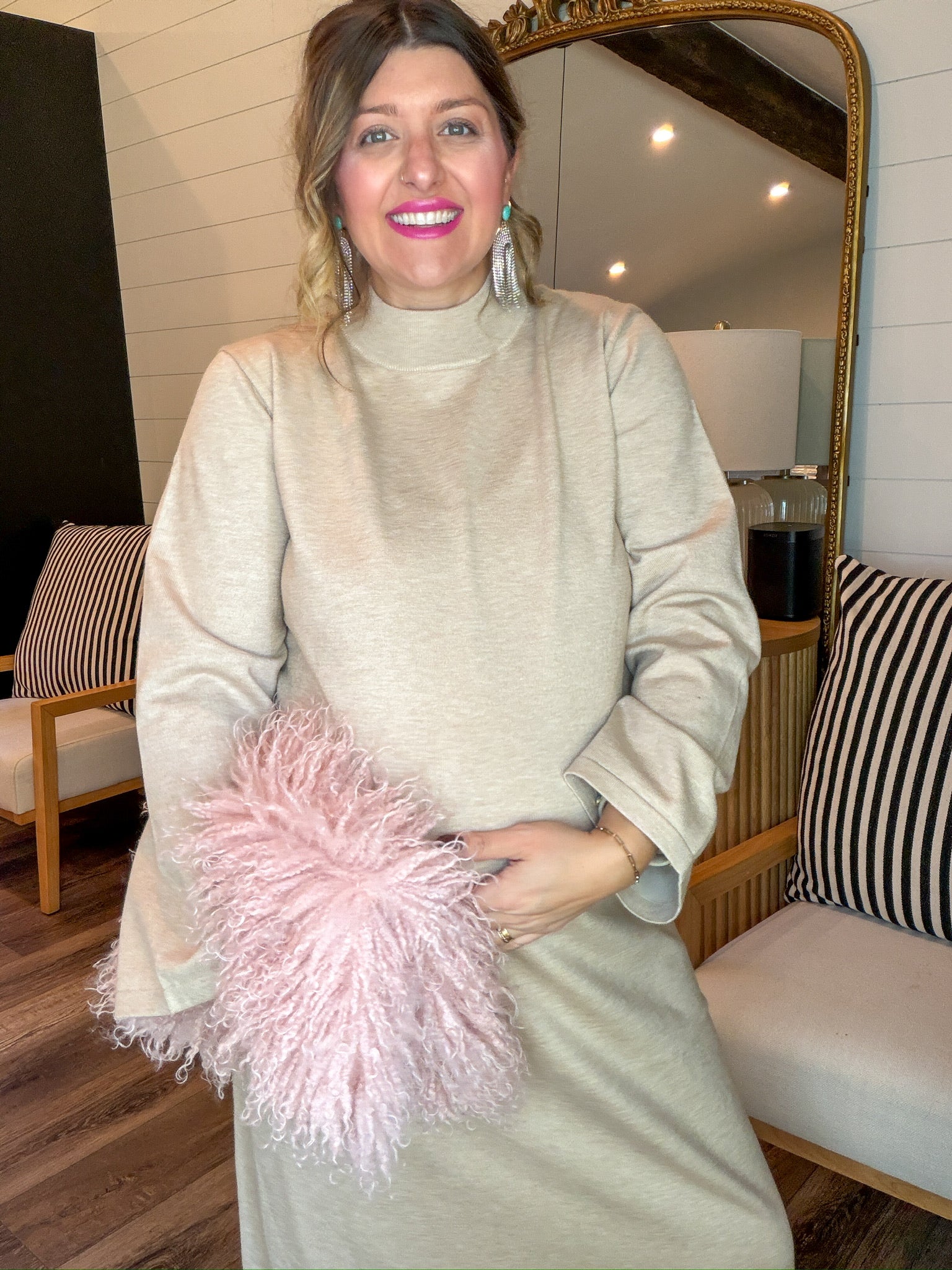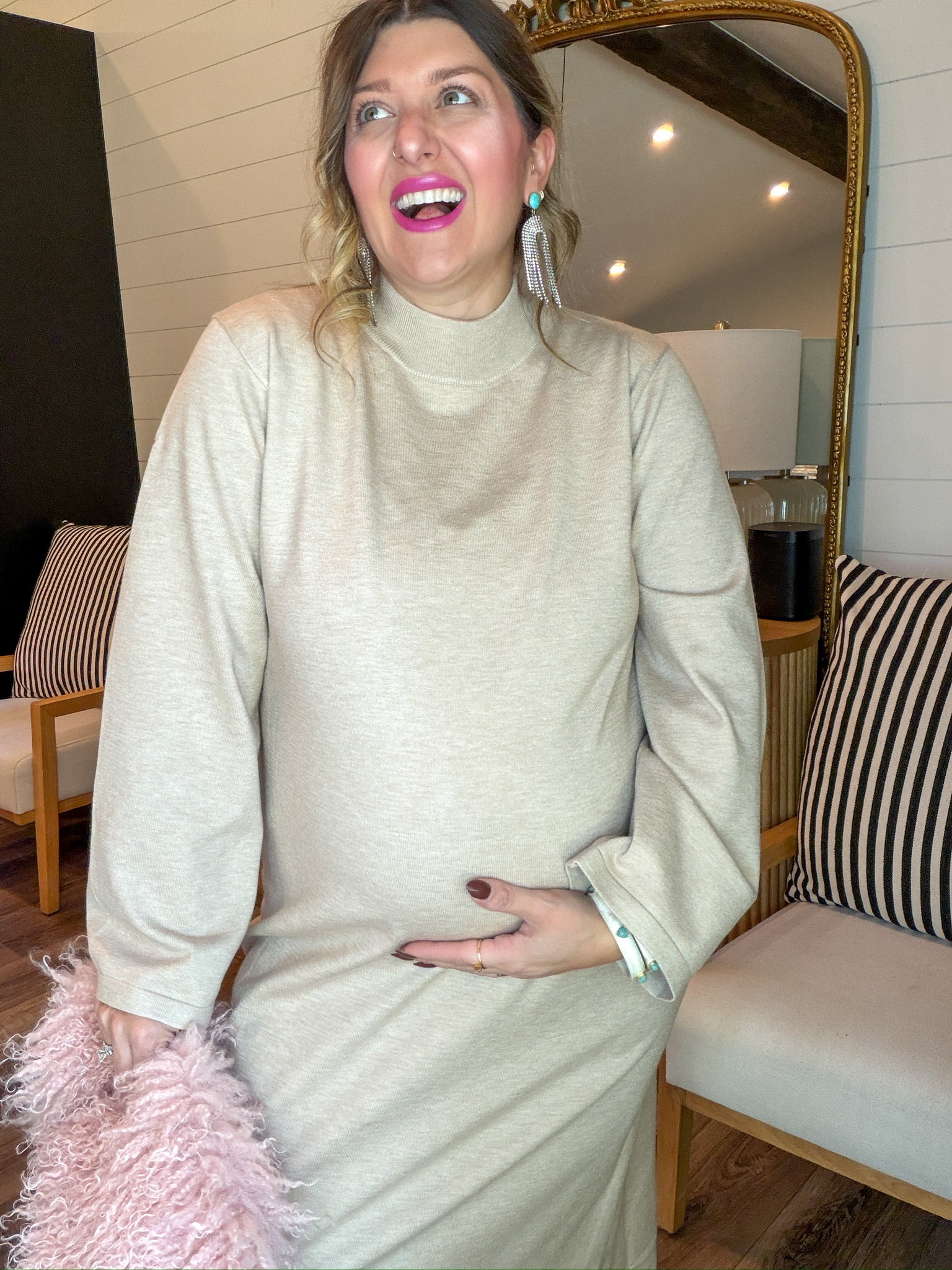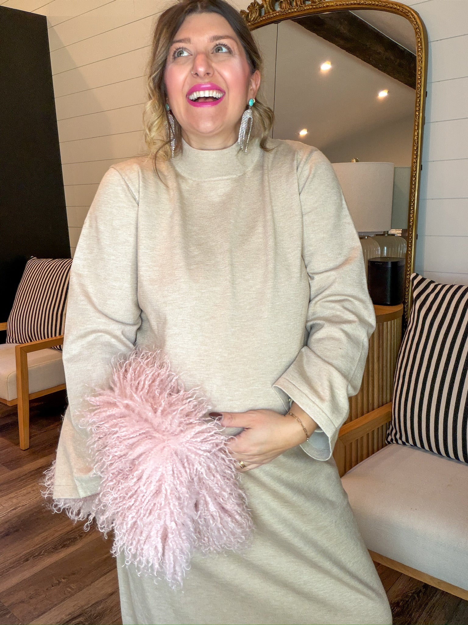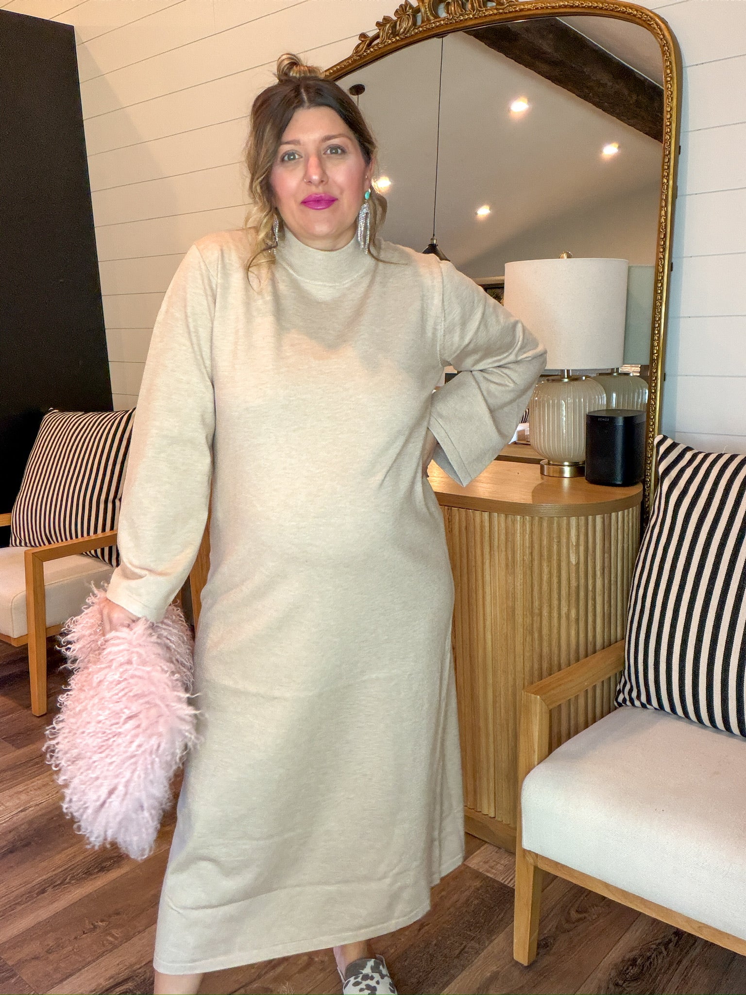 The neutral that never betrays you. This sand-hued sweater dress is that dependable, soft-lux piece you’ll reach for on I want to look expensive but feel like a warm cinnamon roll days. Minimal, sleek, and secretly comfy enough to nap in — basically the quiet-luxury energy we all manifest on Pinterest at 2am.