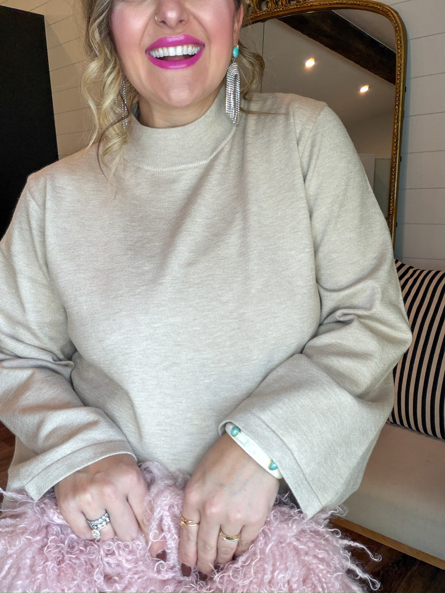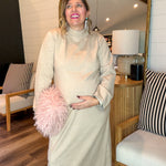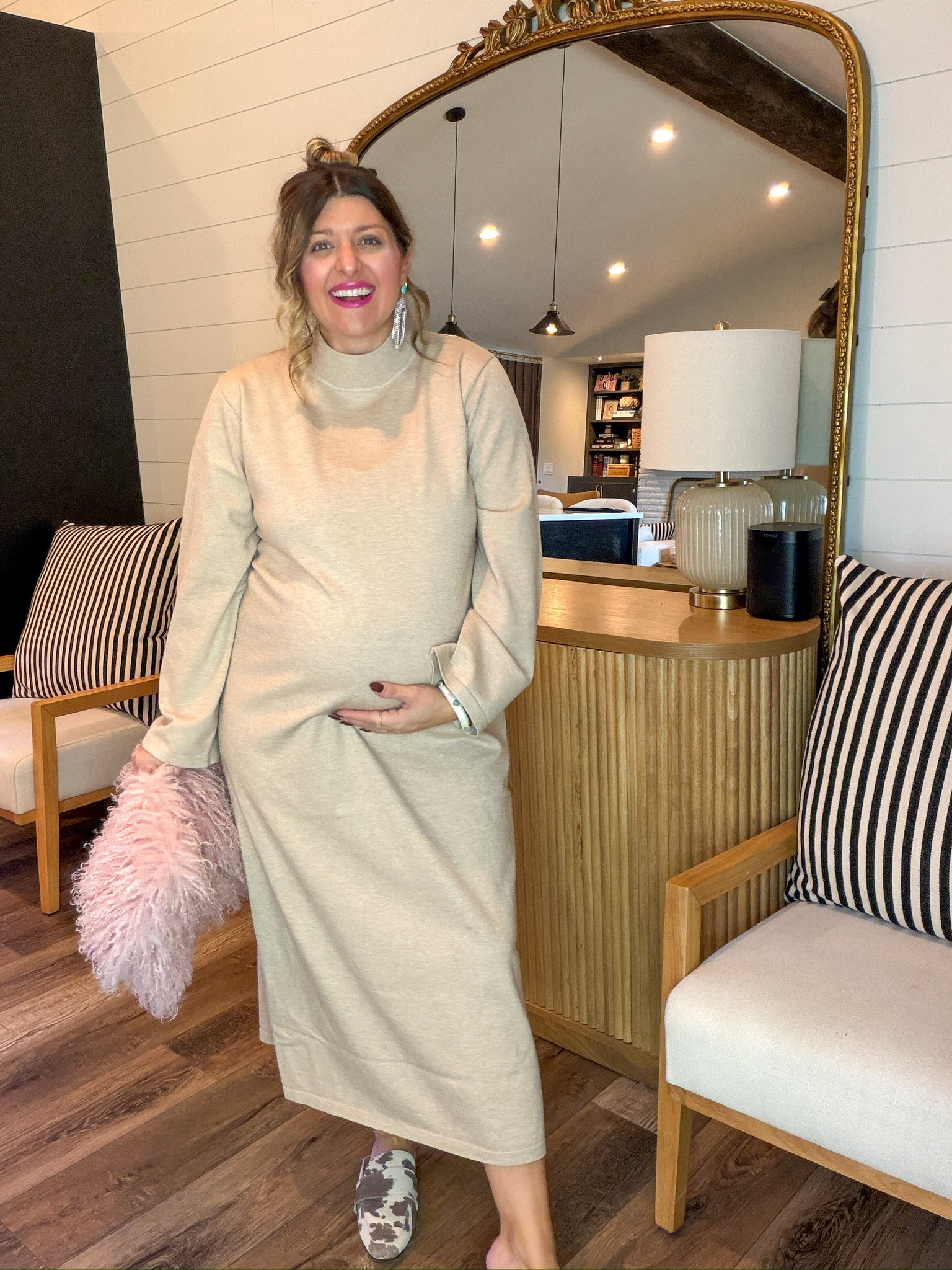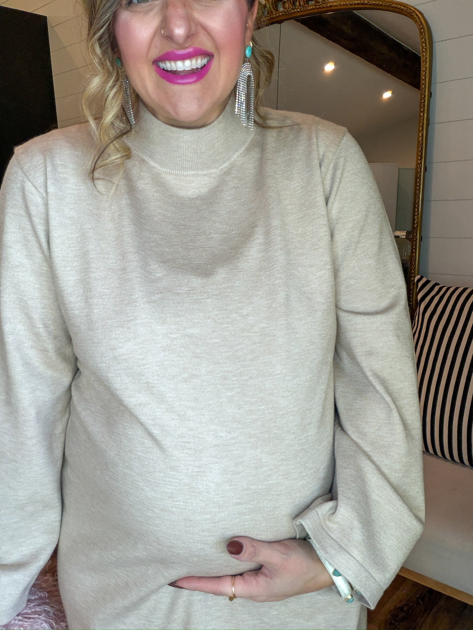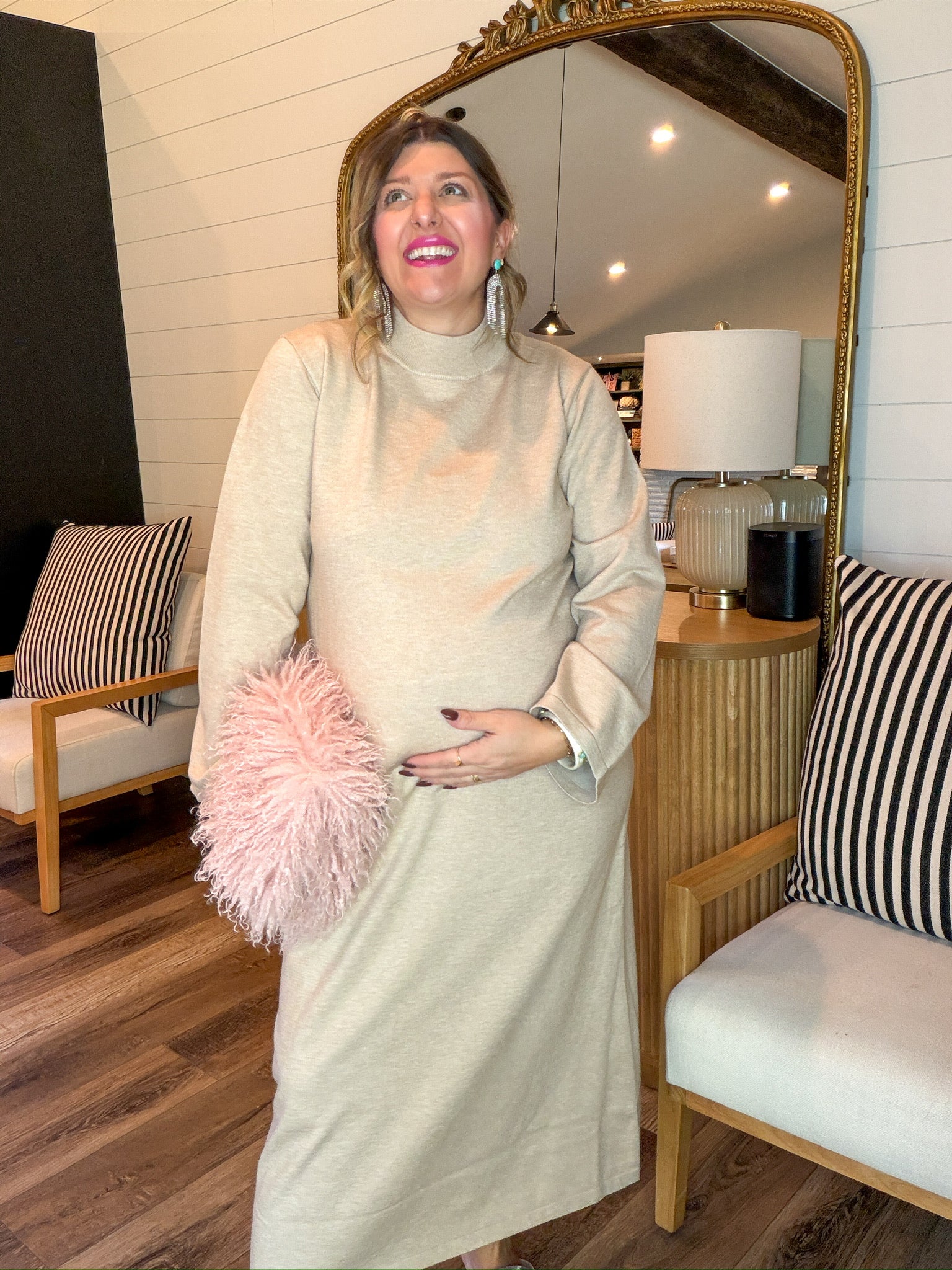 The neutral that never betrays you. This sand-hued sweater dress is that dependable, soft-lux piece you’ll reach for on I want to look expensive but feel like a warm cinnamon roll days. Minimal, sleek, and secretly comfy enough to nap in — basically the quiet-luxury energy we all manifest on Pinterest at 2am.