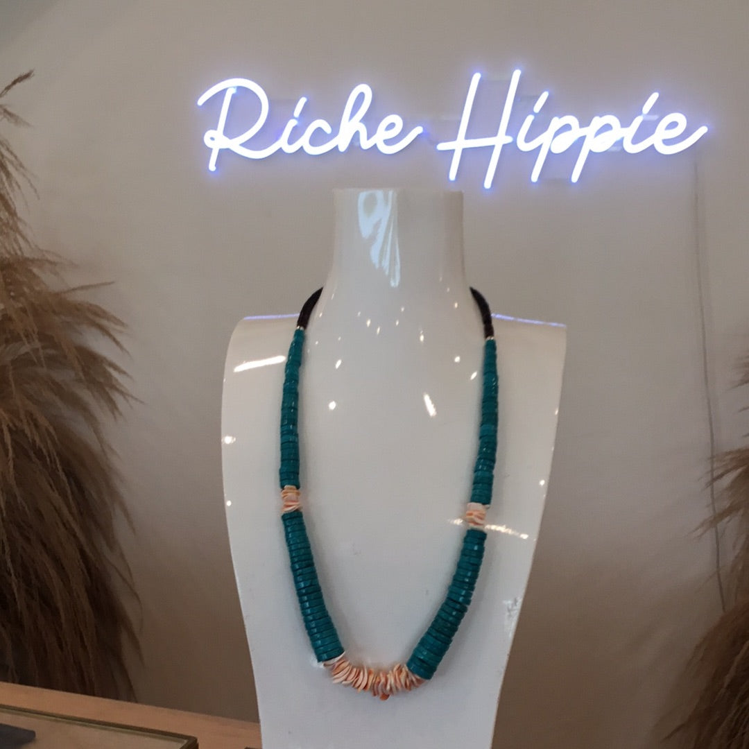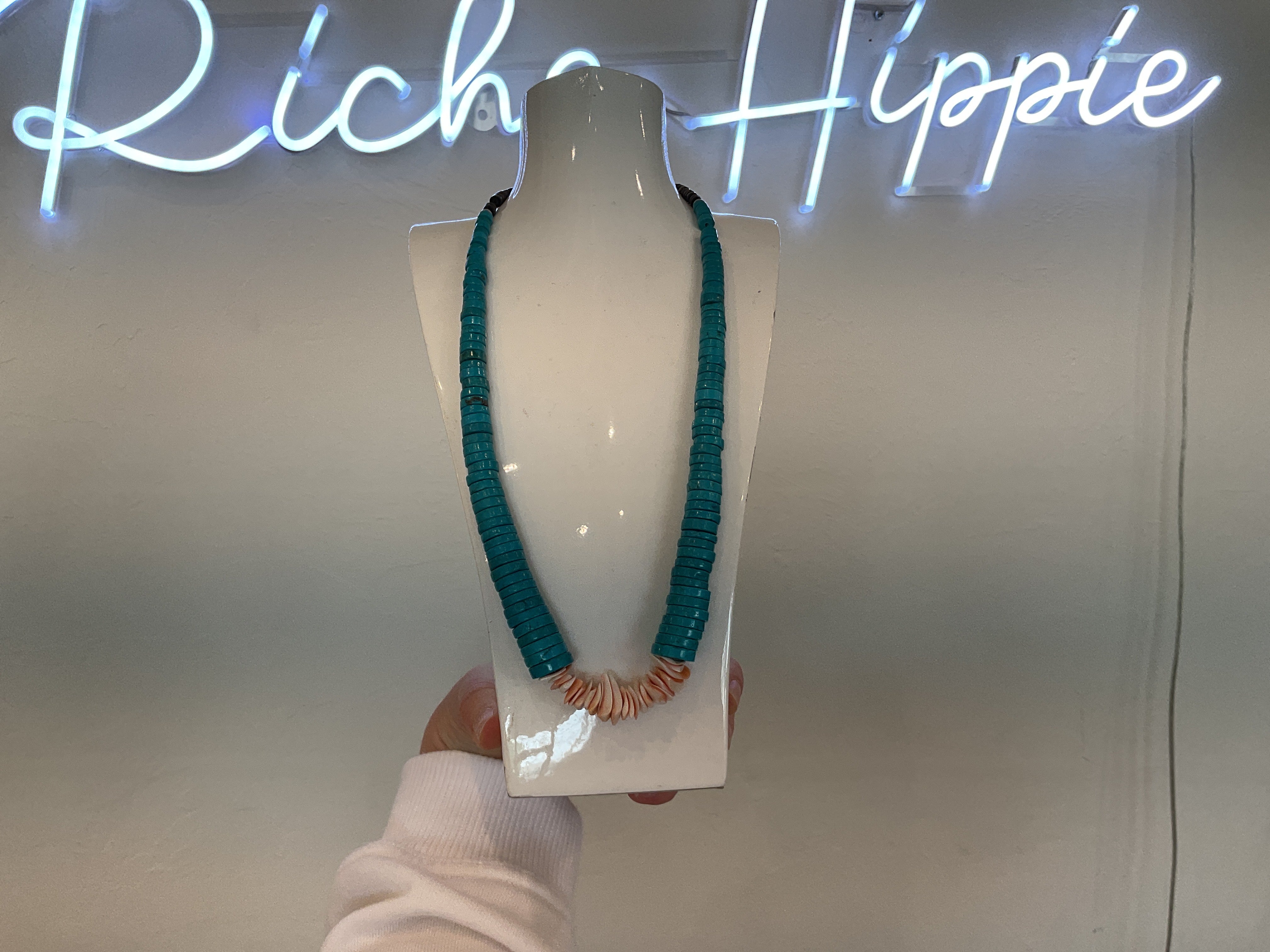 From Farmington, NM... we support a family who handmakes these necklaces right here in the USA. Made with real turquoise, coral, and shells. We love supporting a handmade artist and these right here are the best quality yet.