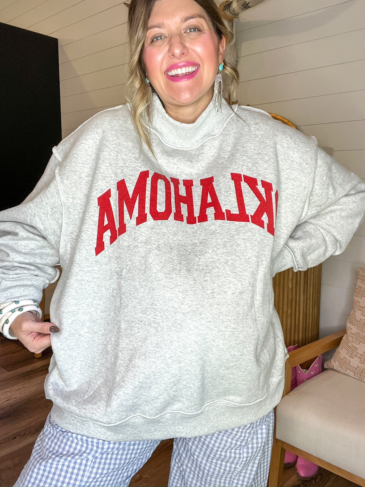 Double the spirit, double the slay. This cozy mock neck sweatshirt flips between two classic vibes—heather grey with bold OKLAHOMA across the front, or clean white with a minimalist OK moment. You’ll be reaching for this one all season long, whether you’re tailgating or hitting the coffee shop after class.