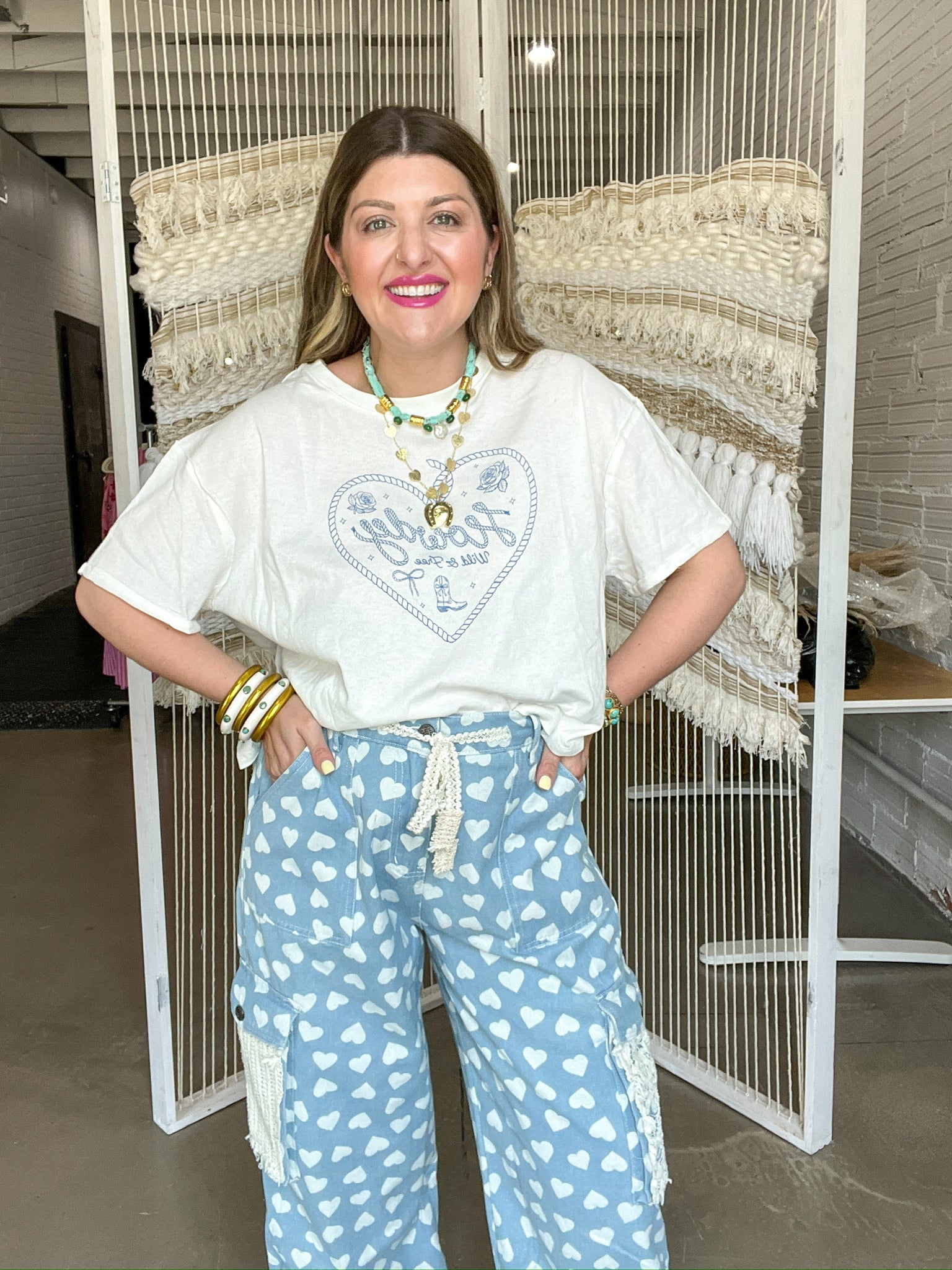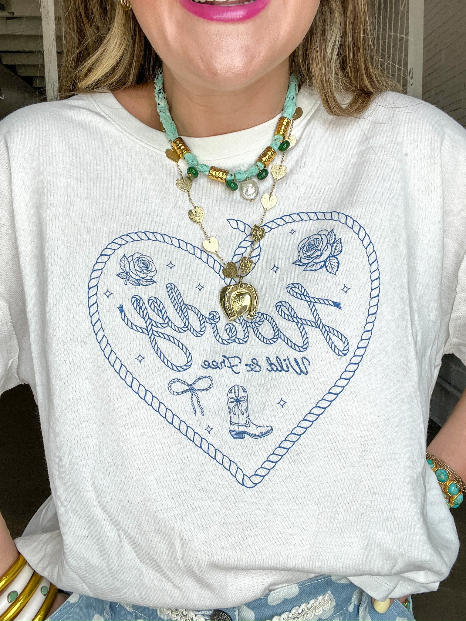 Wild at heart and free in spirit, this tee is for the girls who ride through life with grit and a whole lotta charm. The Howdy Heart graphic hits front and center with a Western twist—part rodeo queen, part cowgirl poet. Whether you’re headed to a summer concert, brunchin’ with your besties, or just chasing sunshine, this one says yee-haw without even trying. Throw it on, saddle up, and let the world know: you’re wild, you’re free, and your heart beats to a country rhythm.