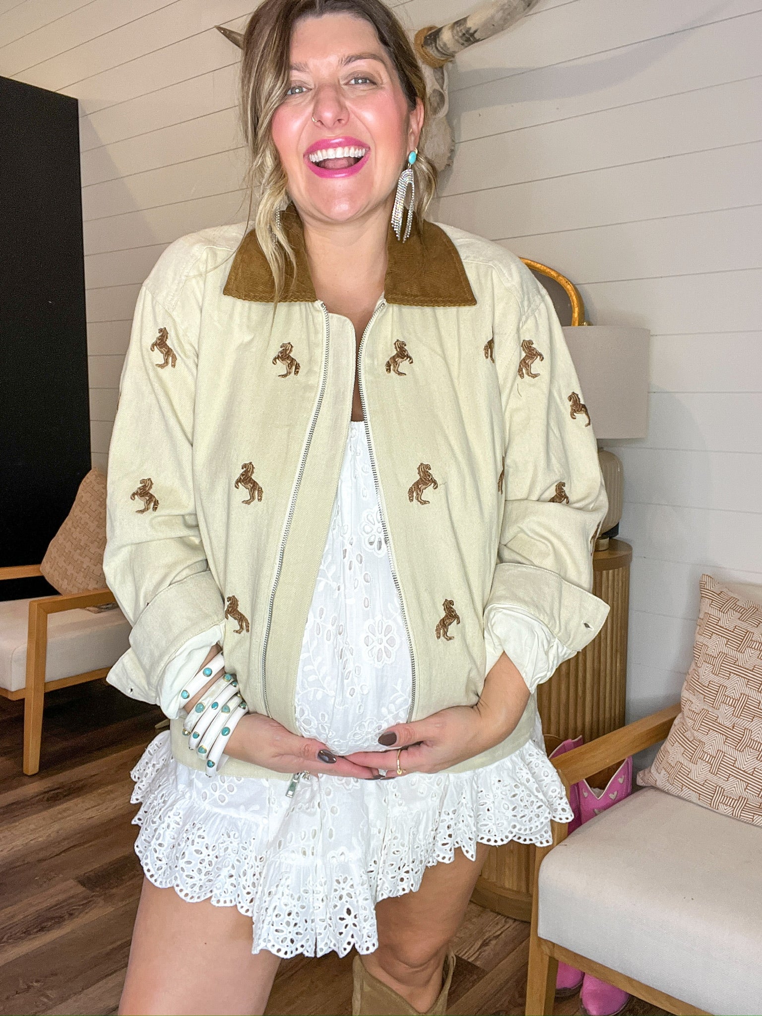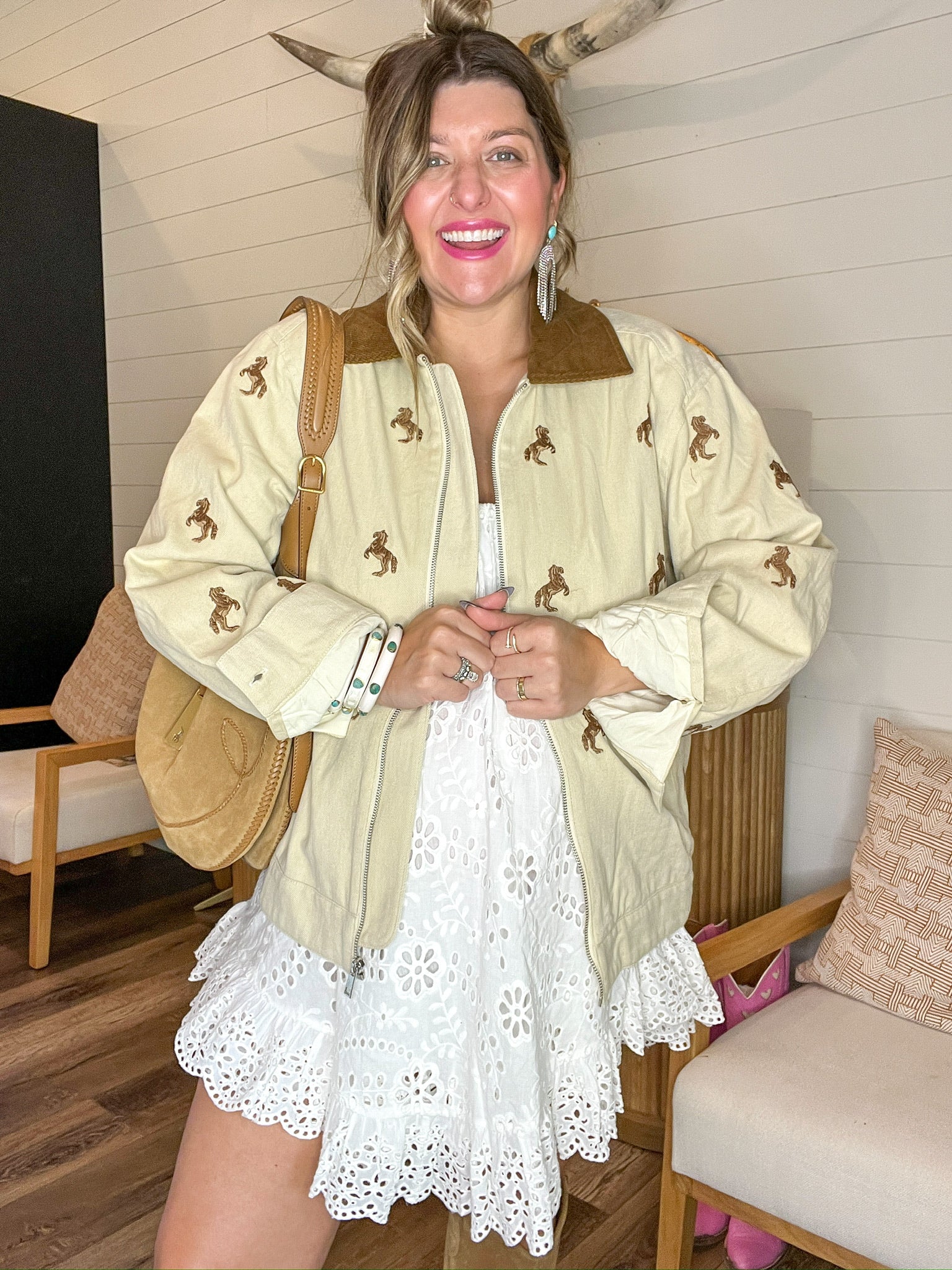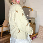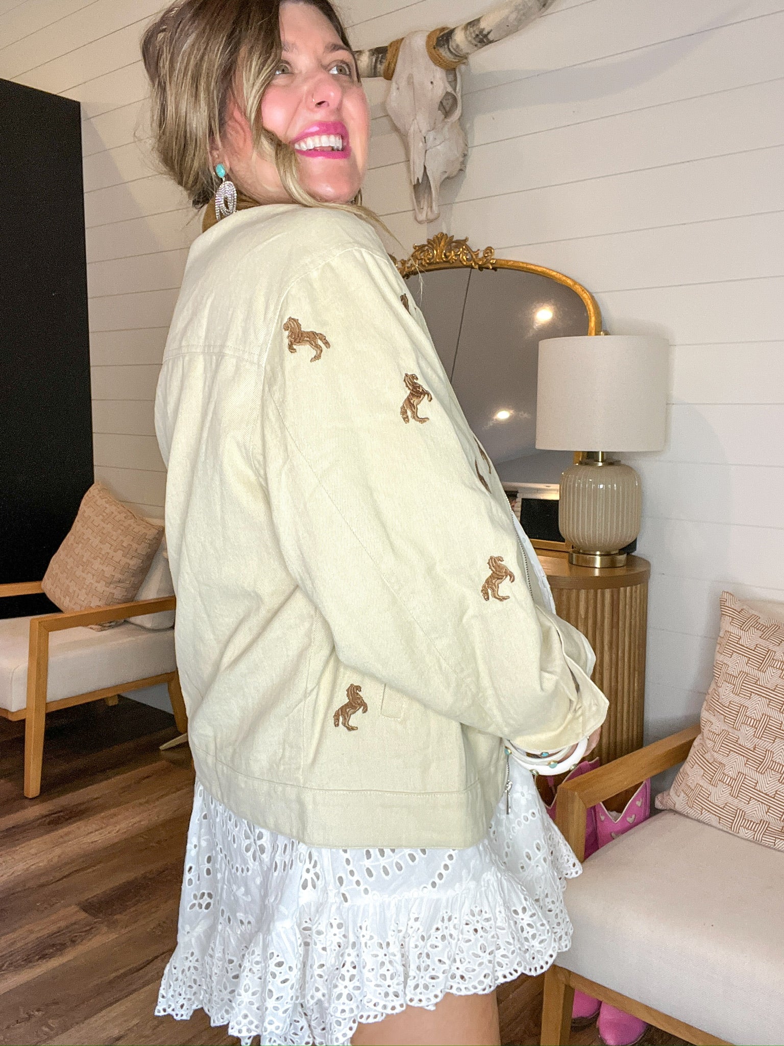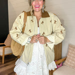 For the ones who grew up on horse girl dreams and barn bonfire nights—this jacket is a little bit Western, a little bit whimsical, and all the way iconic. The soft tan canvas is embroidered with galloping ponies, while a rich brown corduroy collar ties it all together like a storybook ranch scene.