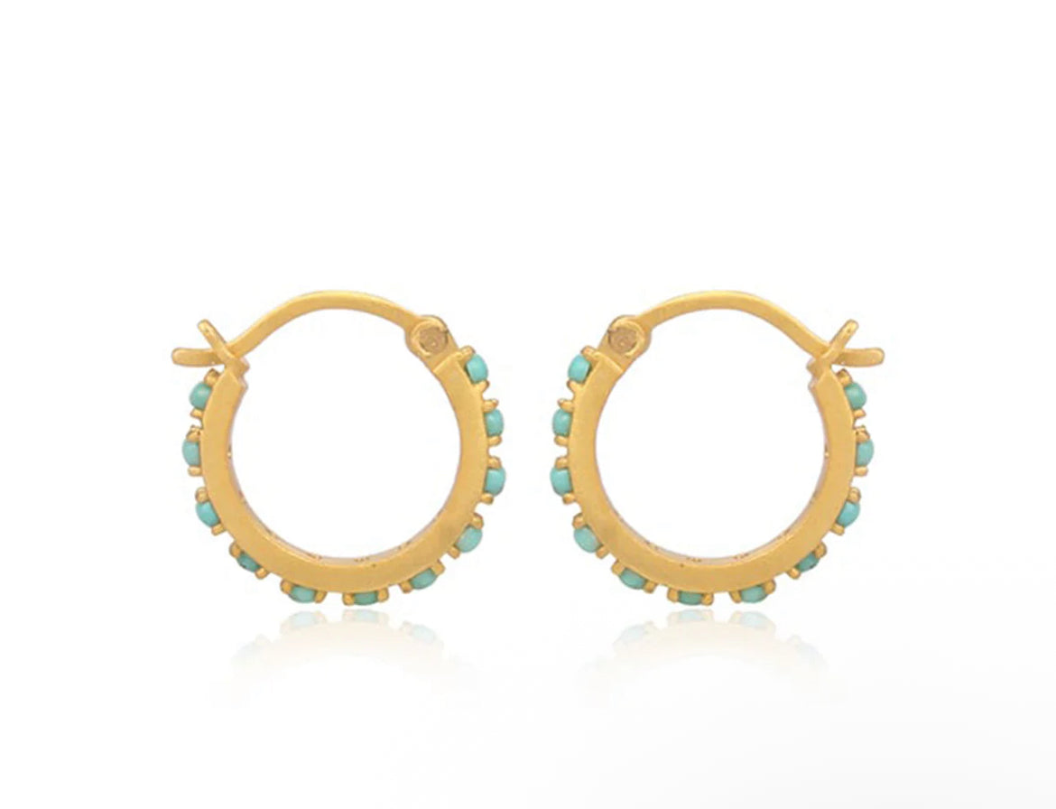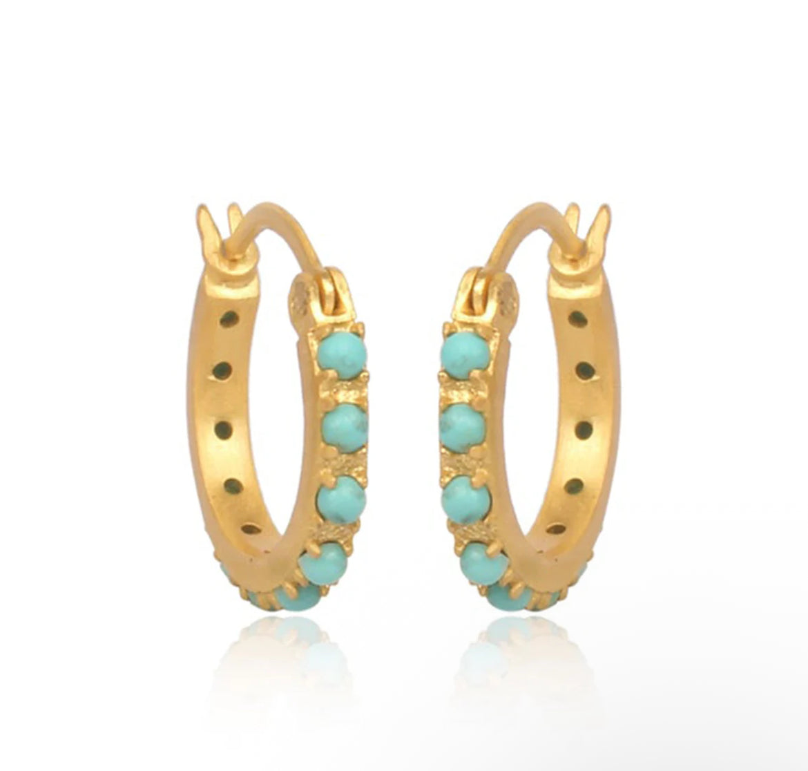 A little goes a long way with our Turquoise Huggies. These huggies are designed in brass and brushed in 18K gold plating. Adorned with round turquoise stones in dramatic prong settings, these small hoop earrings add a pop of color, without overtaking an outfit. Team these turquoise earrings with our matching Dainty Pendant Necklace for the perfect everyday jewelry combination.