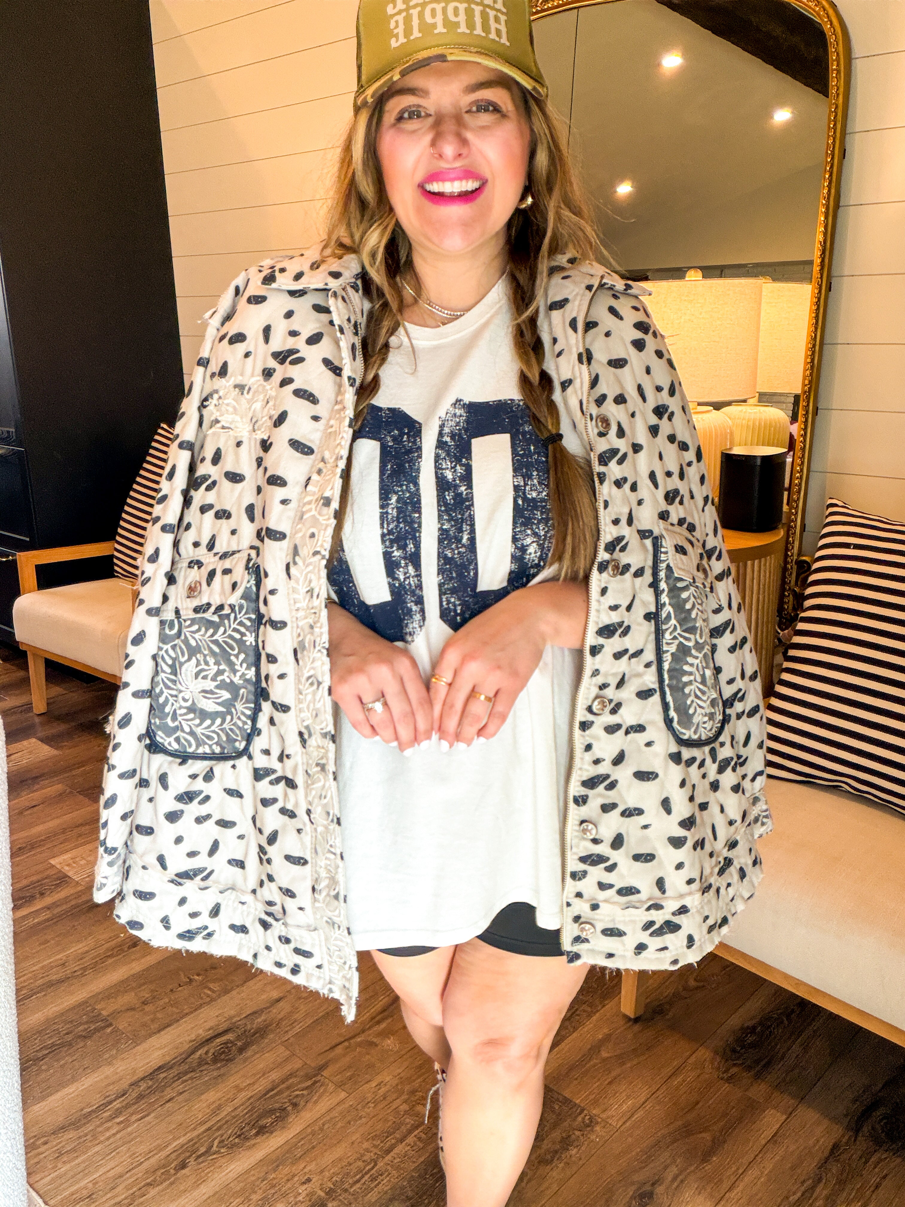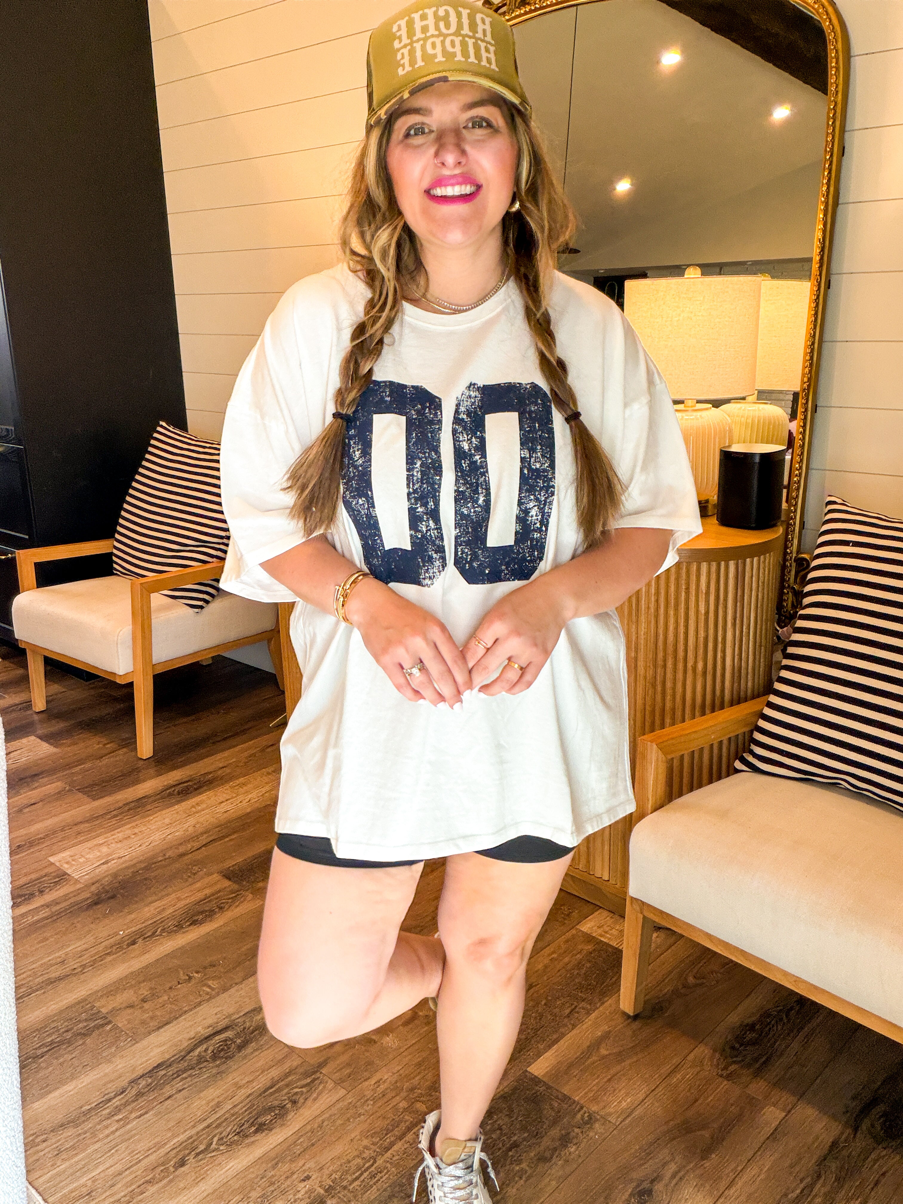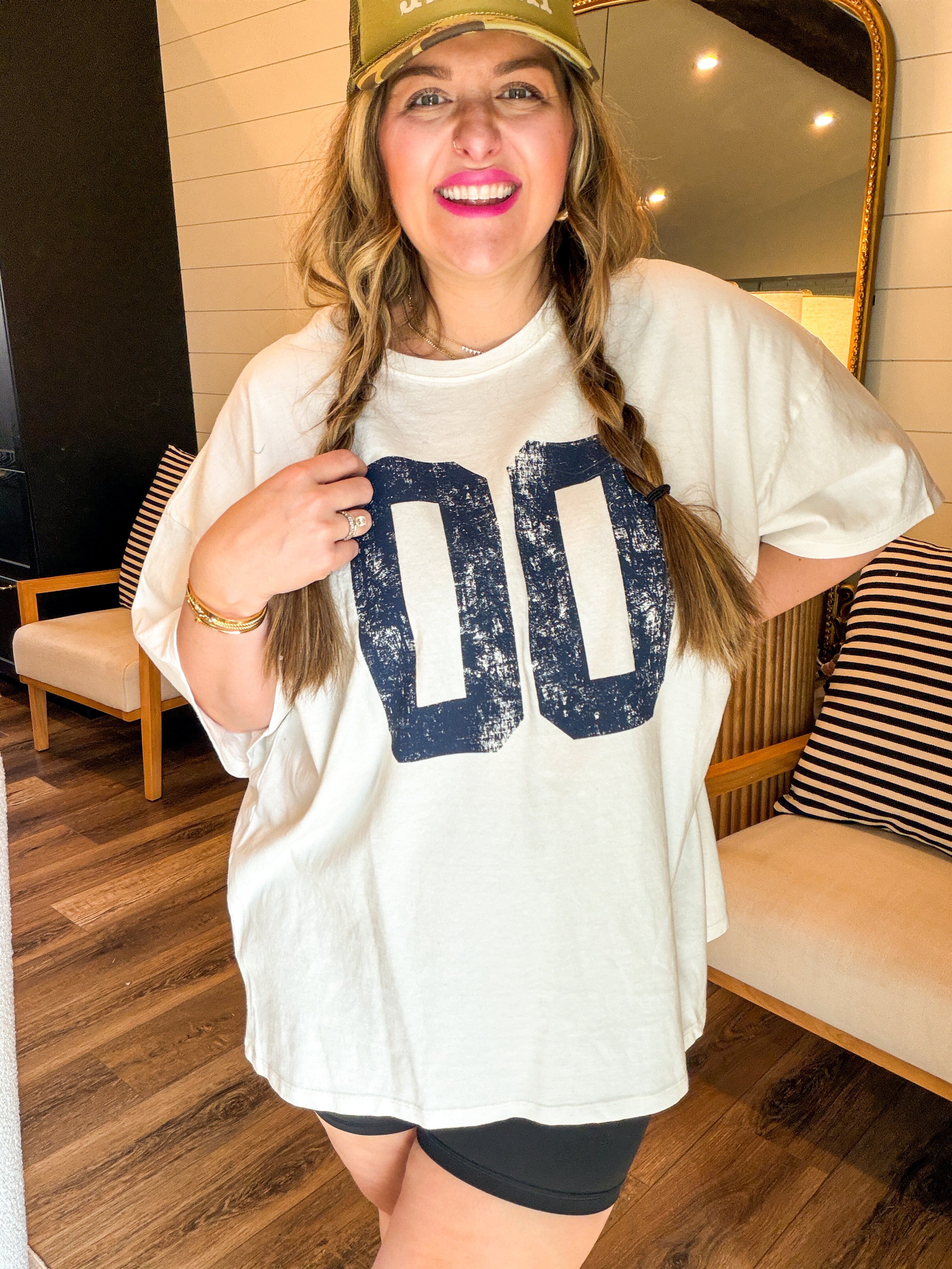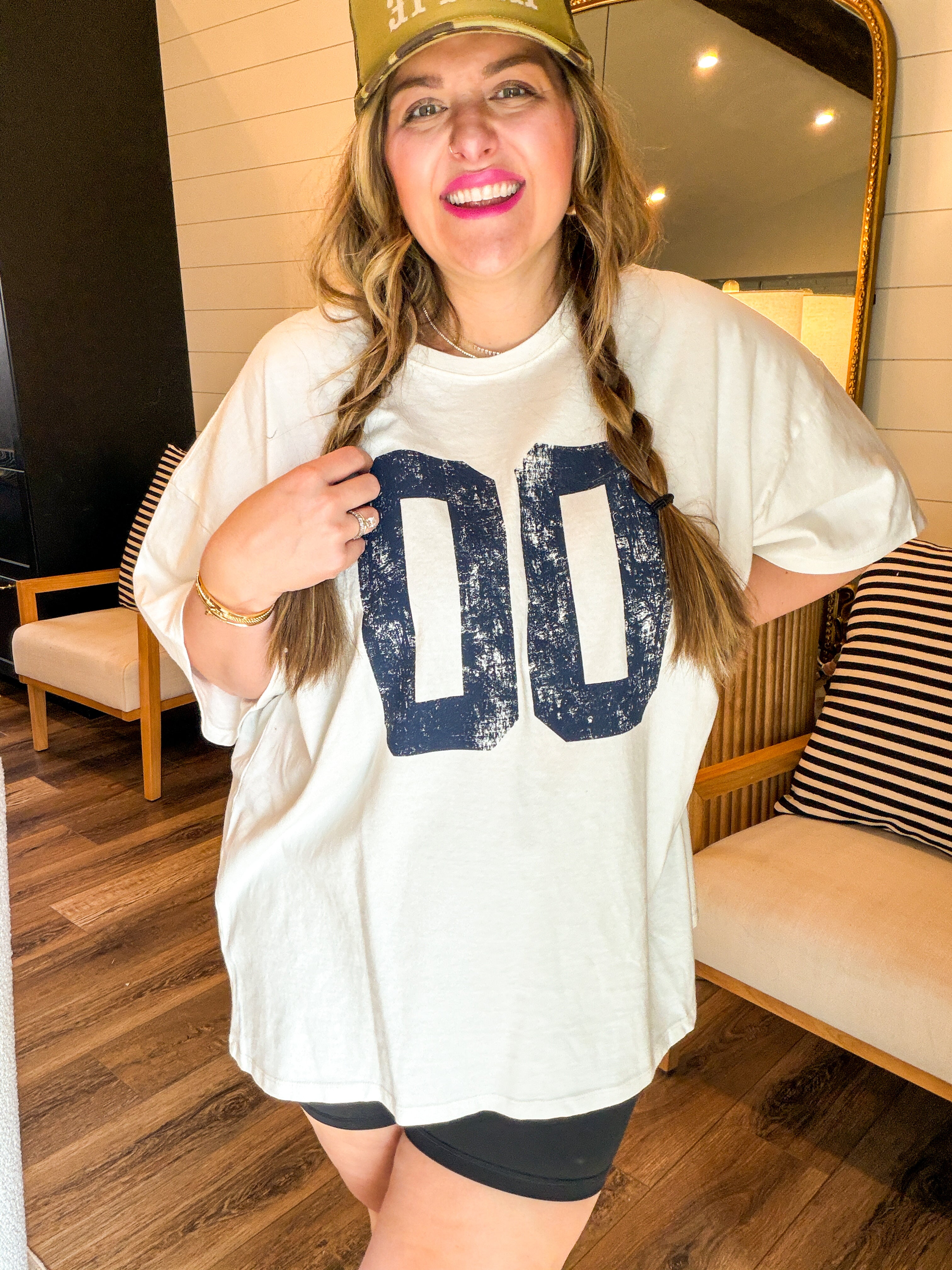 Your new everyday favorite. This varsity oversized tee features a relaxed, slouchy fit with bold vintage-inspired lettering for that effortless, cool-girl vibe. Designed with a soft, breathable fabric and a longer length, it’s perfect for layering, front-tucking, or wearing loose with denim, biker shorts, or leggings. Easy, comfy, and endlessly versatile — this tee is made for real life and real style.