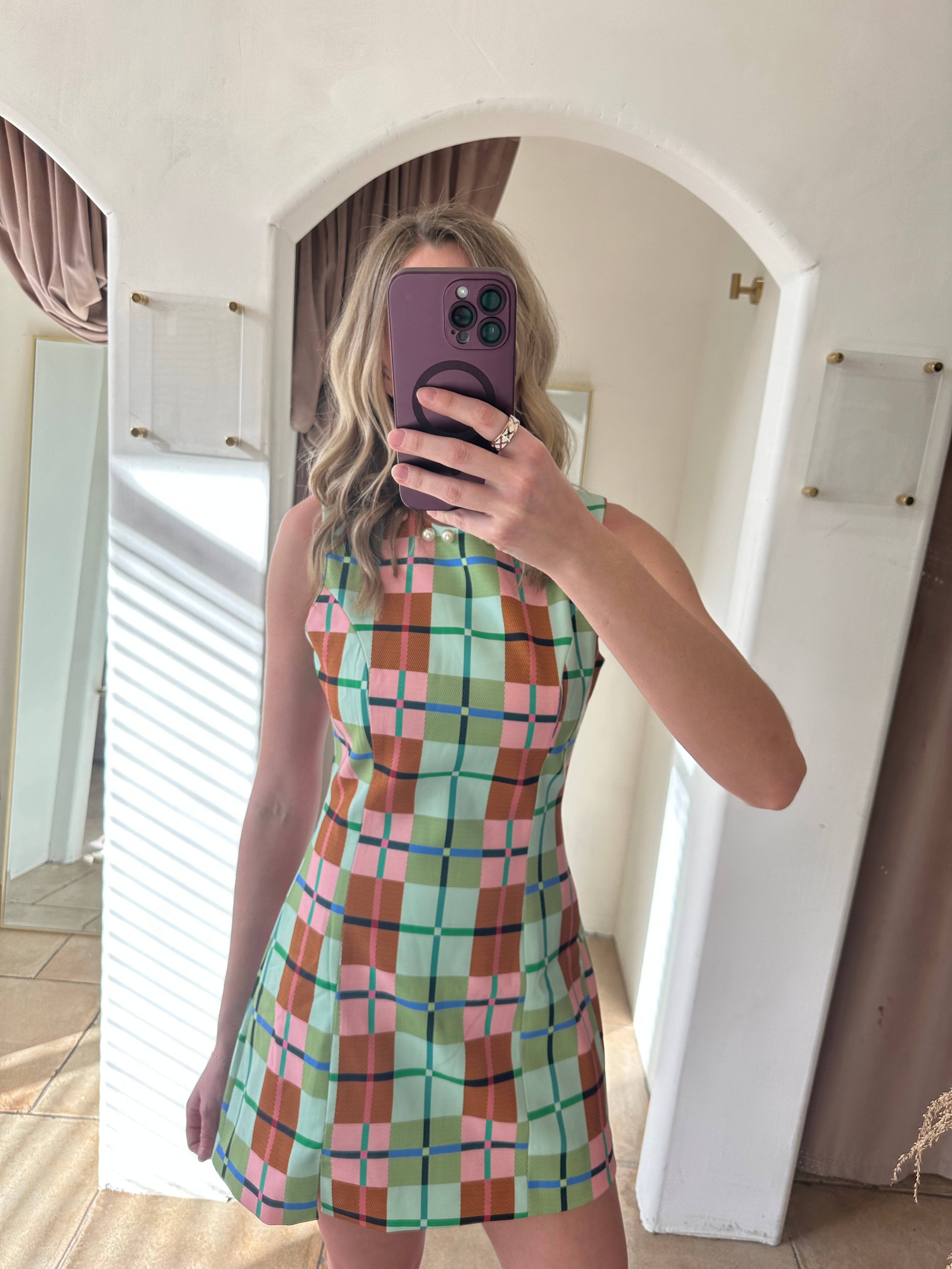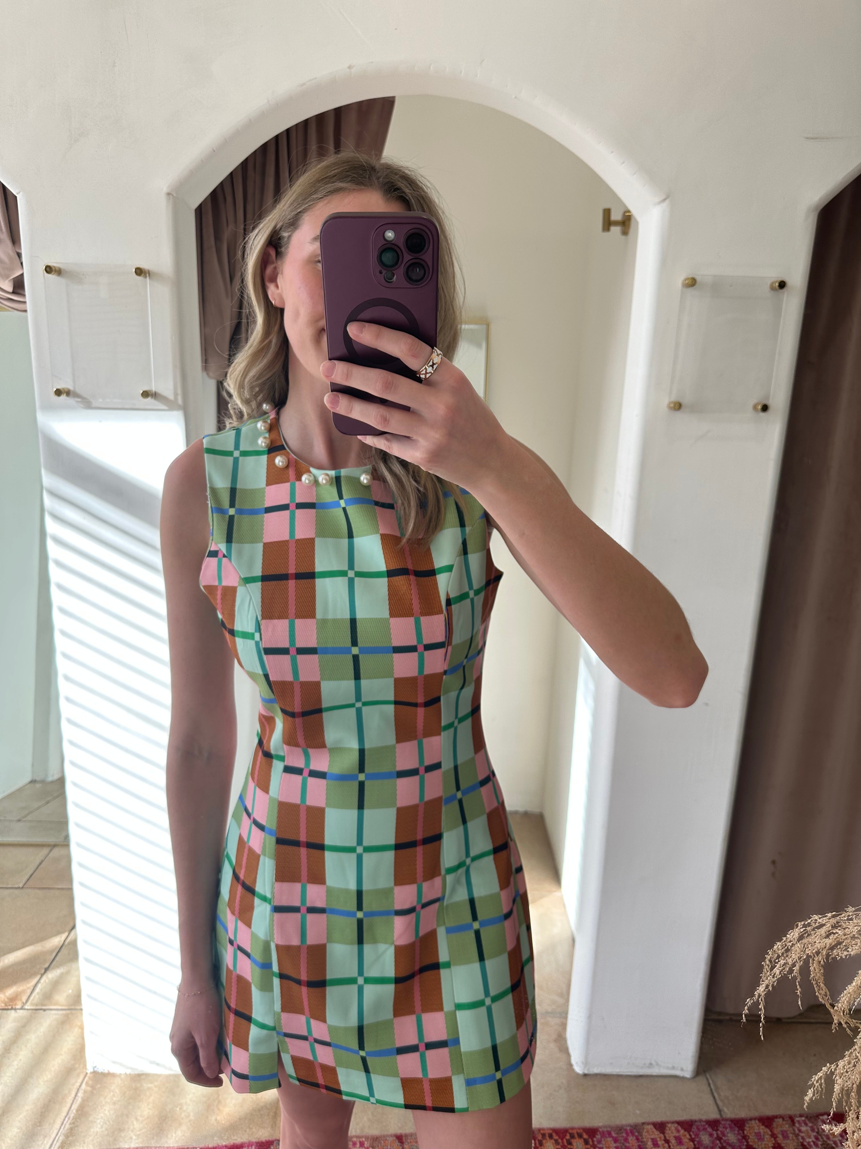 Out of stockThe Corner Booth Plaid + Pearls Mini Dress