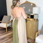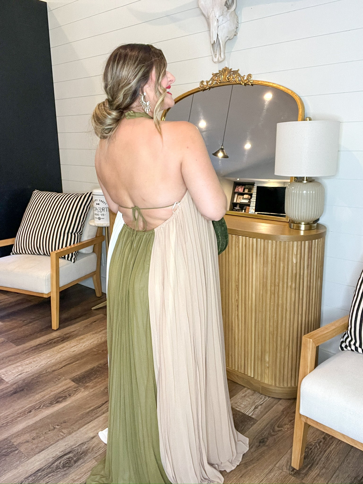 Wander where the light pours in- this ethereal olive maxi was made for golden hour strolls + daydreamy moments. With its breezy pleated chiffon + flowy halter neckline, it floats with every step. A soft lining keeps it comfy, while the rich olive hue feels grounding + goddess-like. It's the kind of dress that turns "just going to dinner" into a full moment.