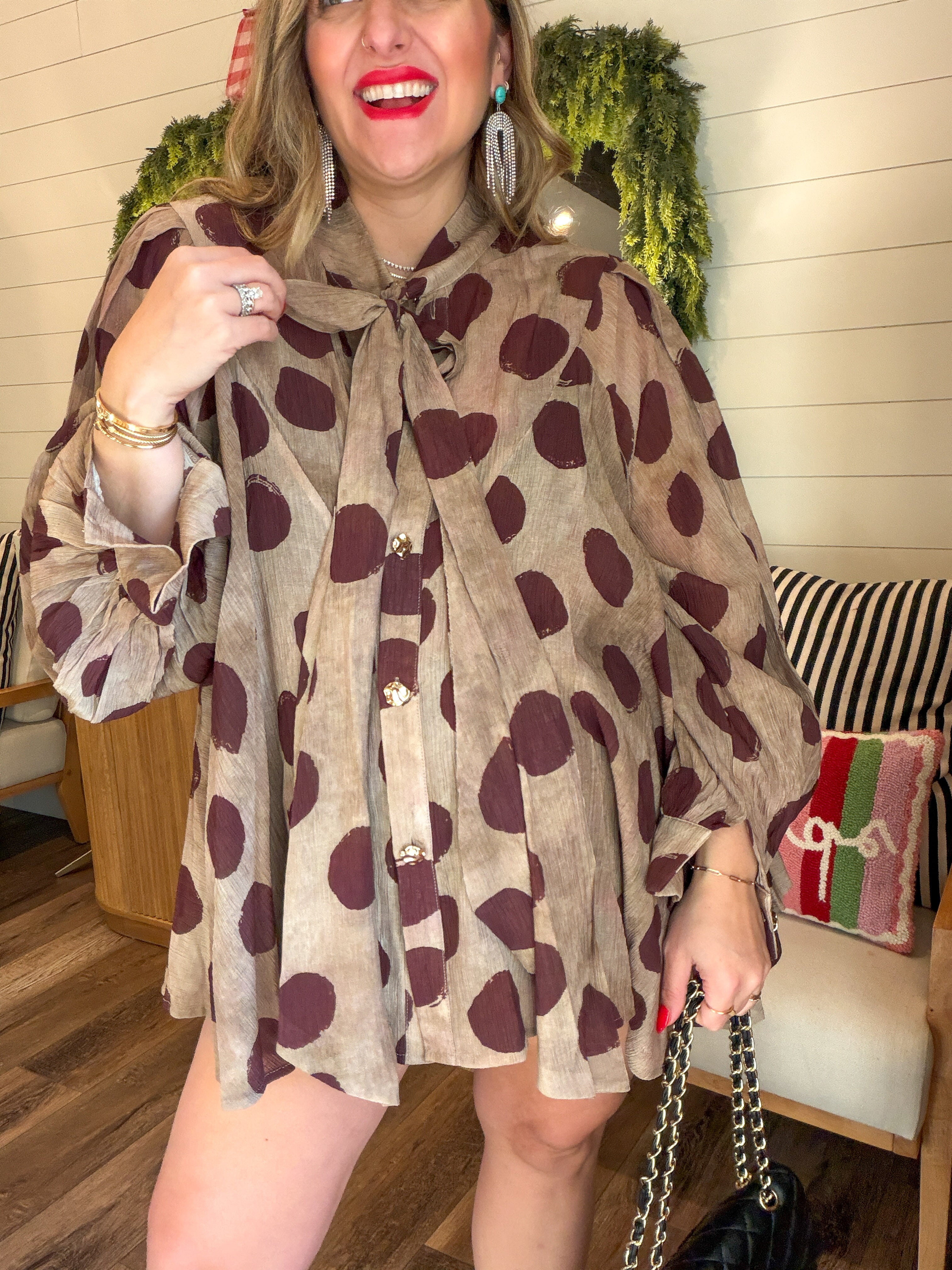 Out of stockWhimsical Dot Tie-Neck Blouse – Brown