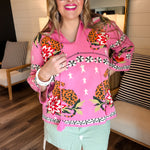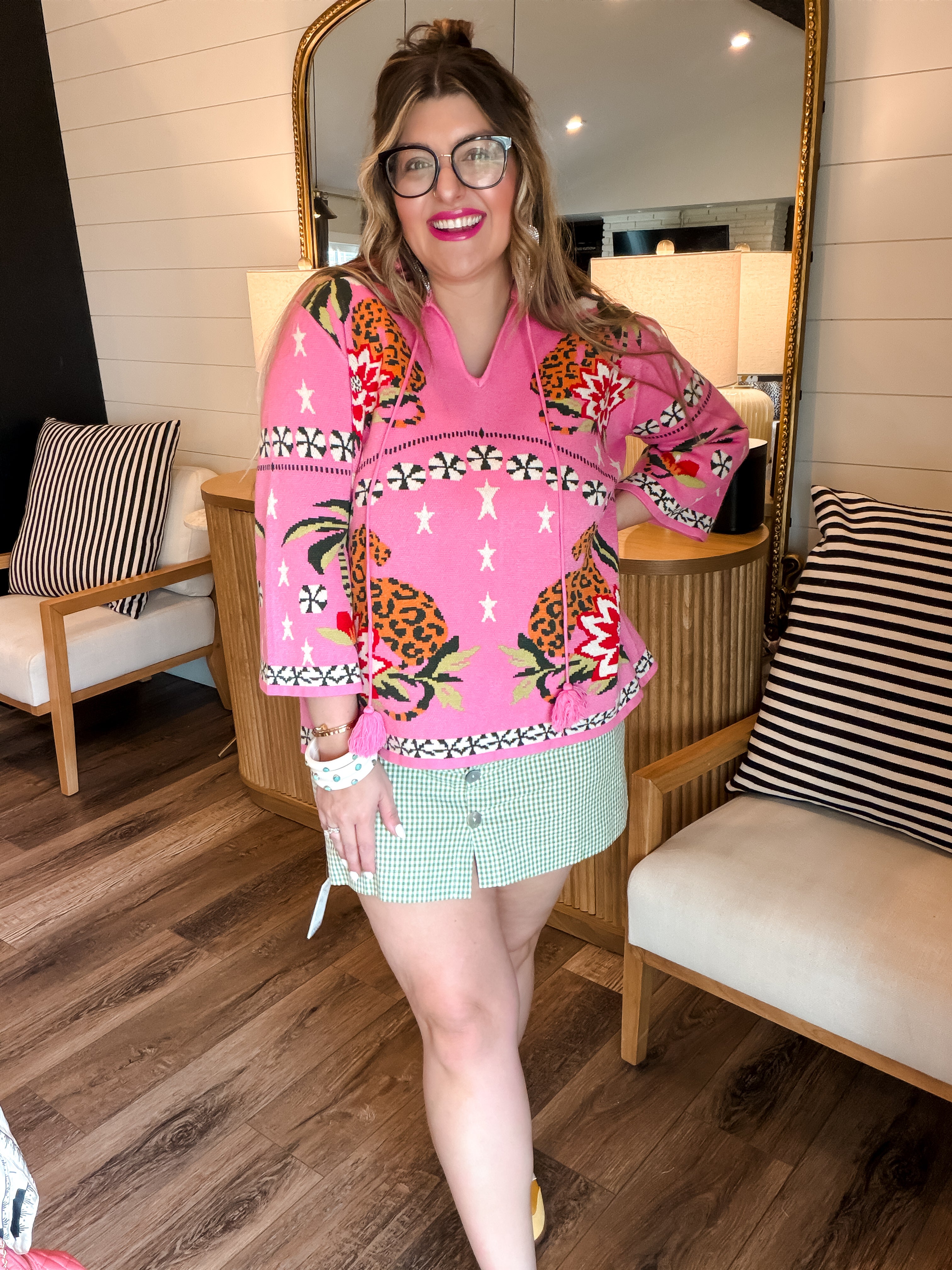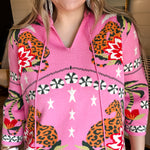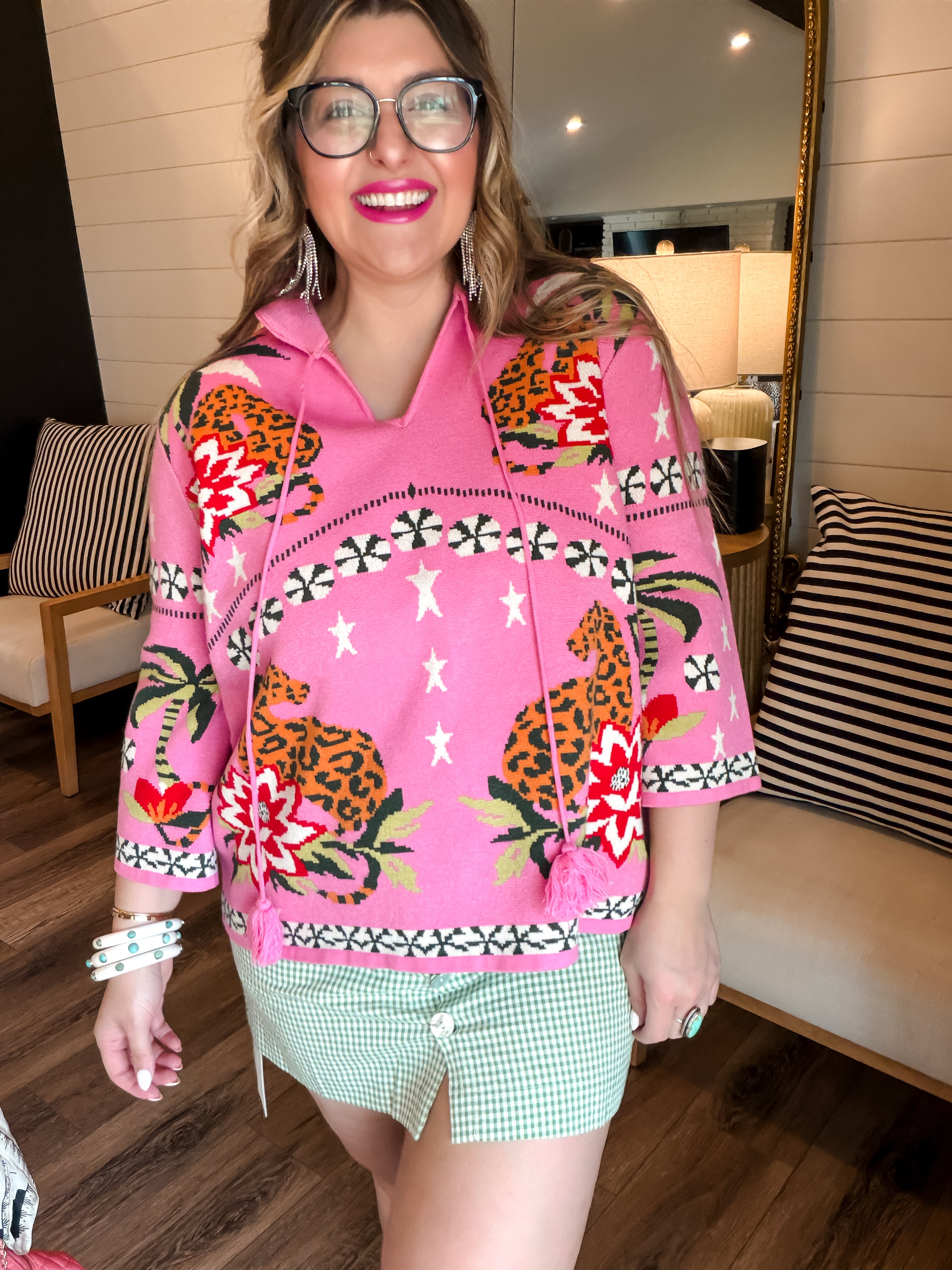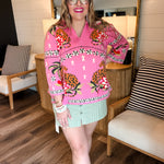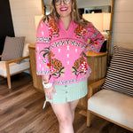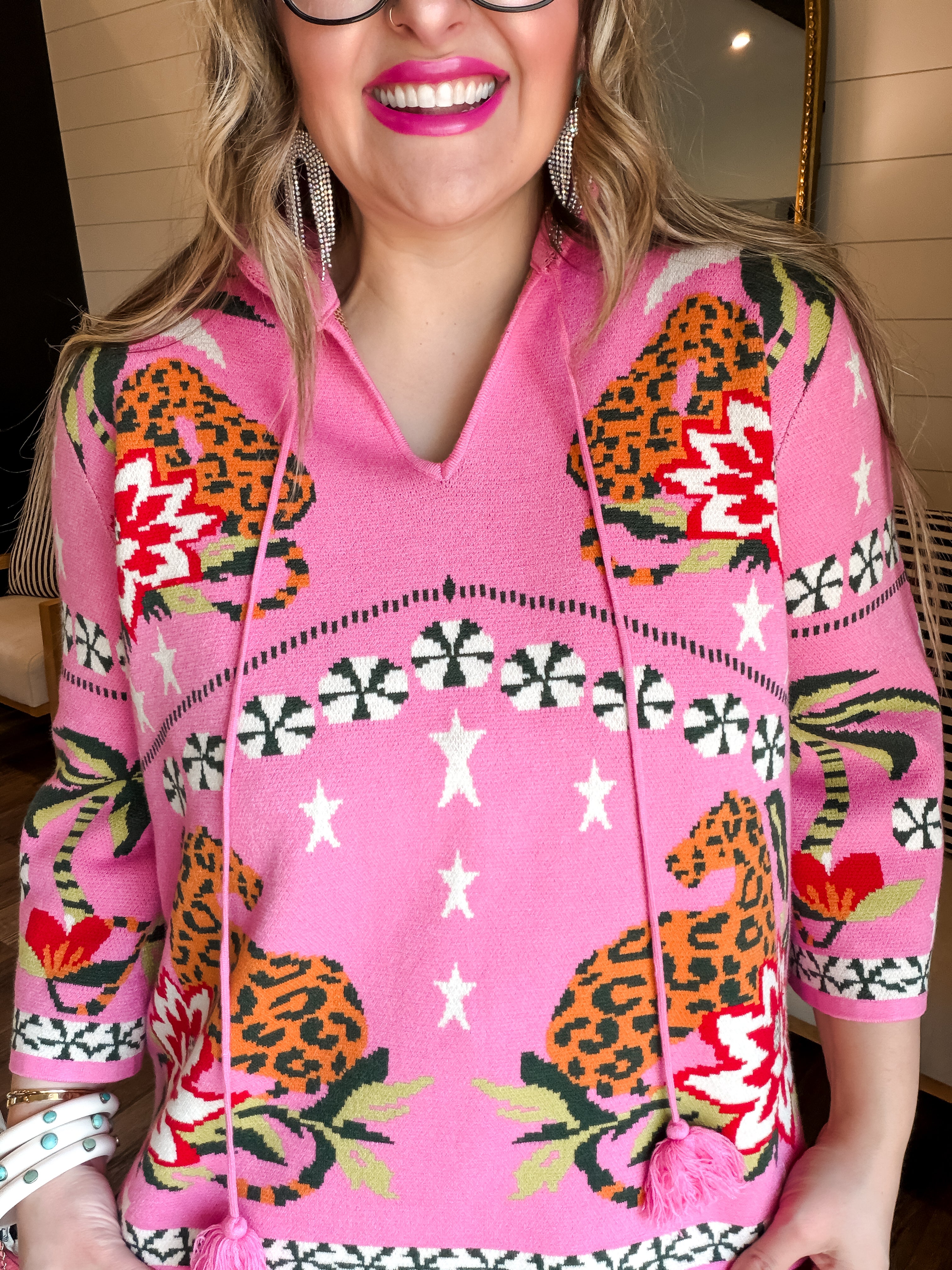 Bold, vibrant, and made to stand out 💖 The Wild Bloom Knit Pullover features an eye-catching leopard and tropical floral design against the prettiest shade of pink.
