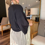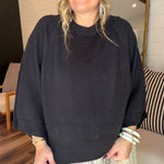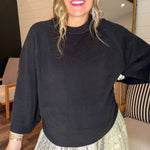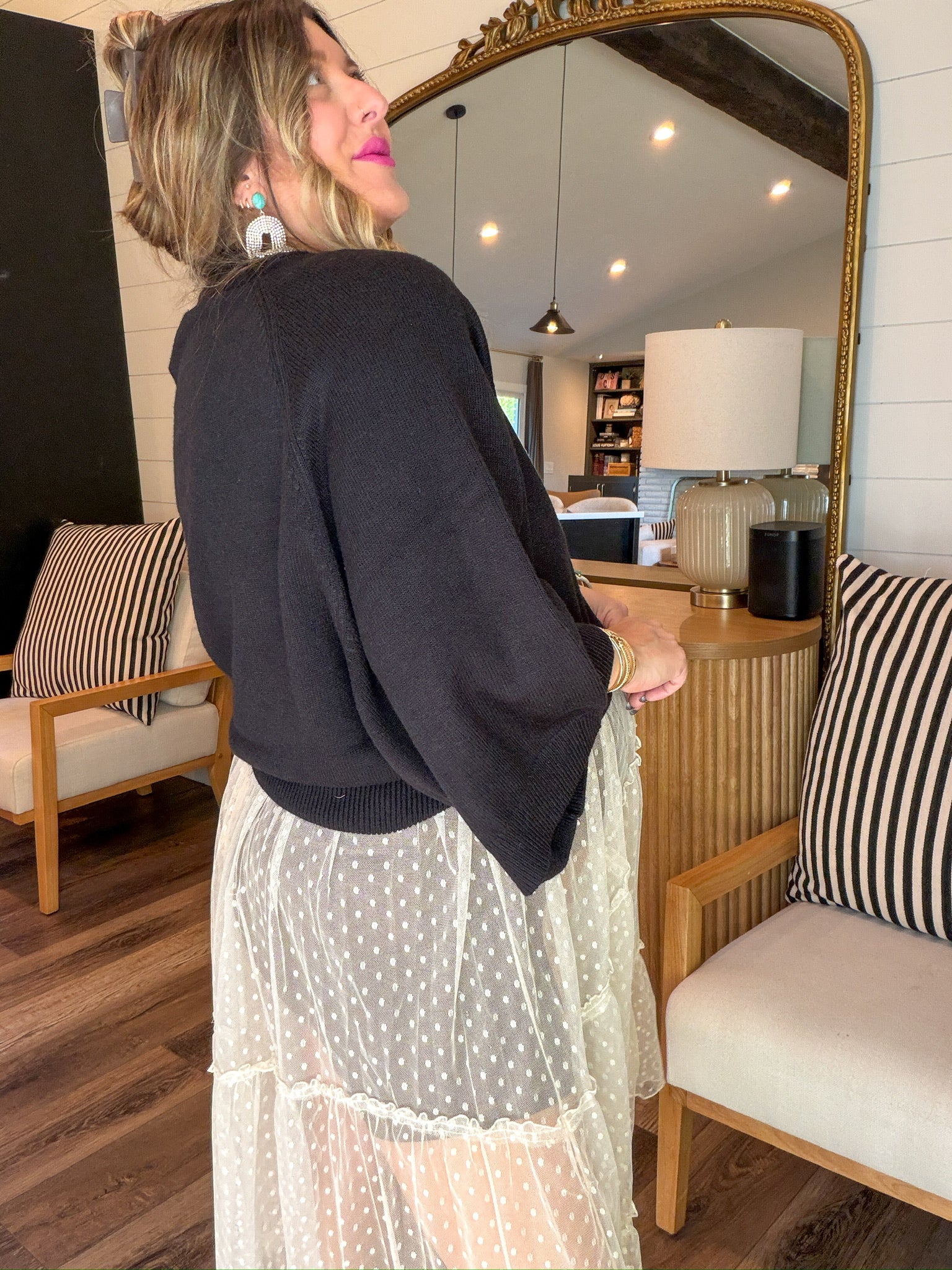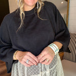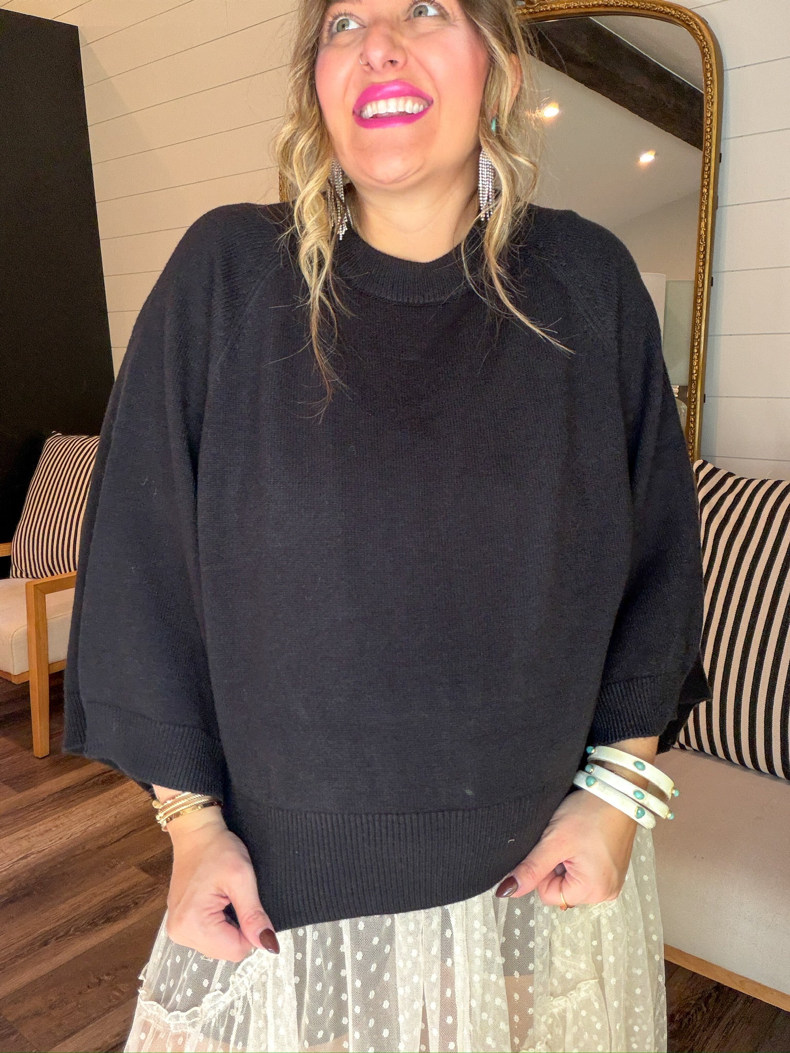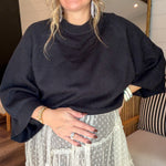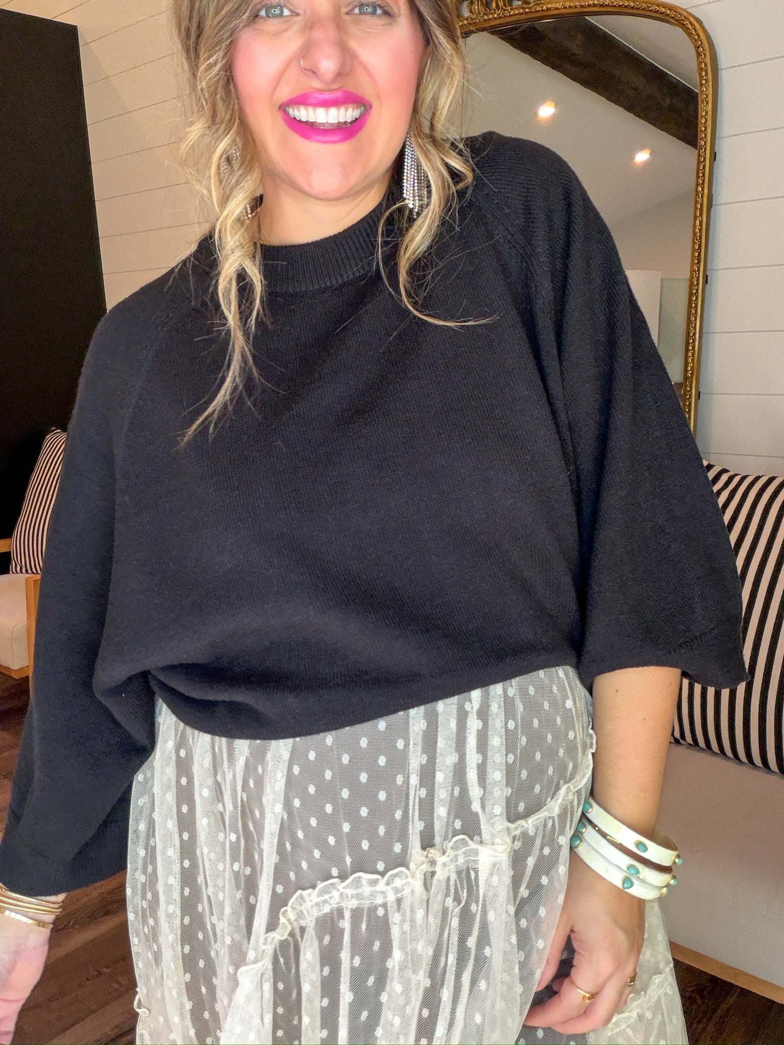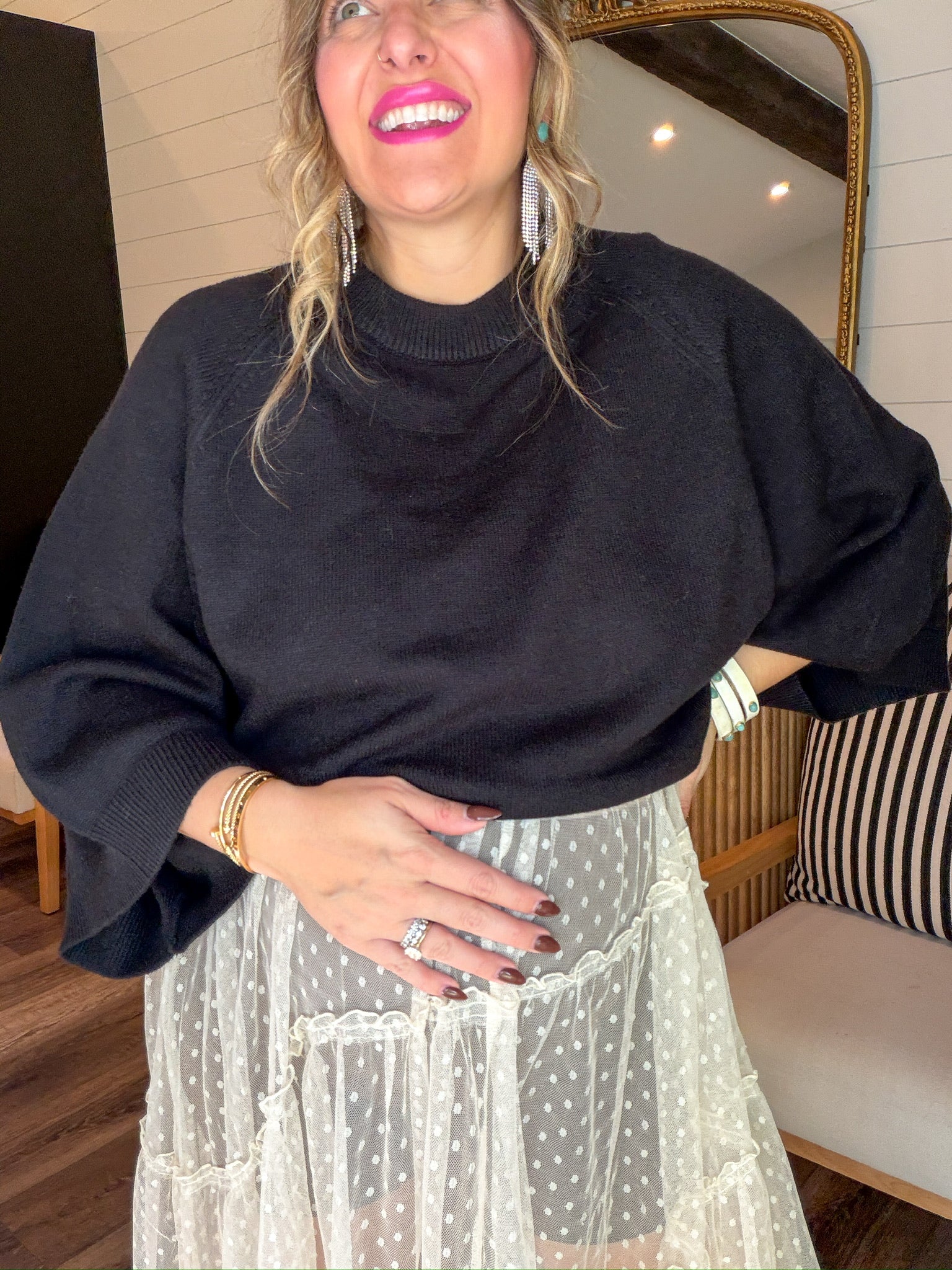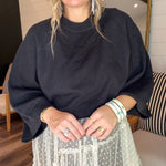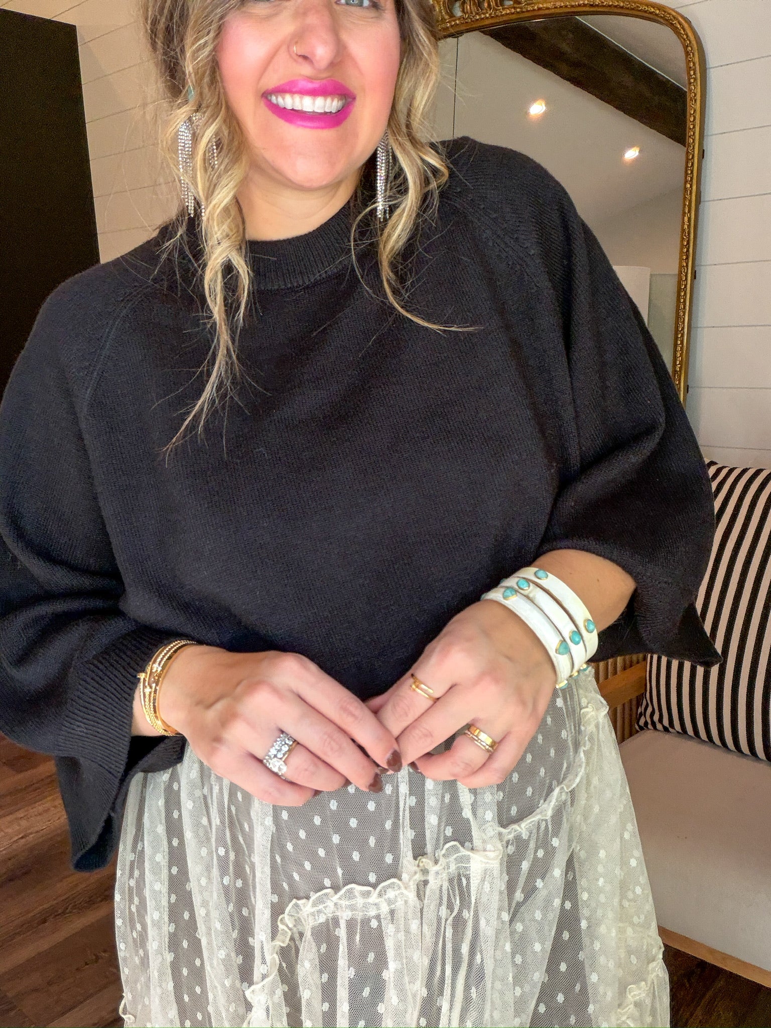 Some pieces just get you. This soft-lux black knit has that quiet confidence vibe. Structured neckline, buttery drape, sleeves that say “I’m chic but I also like being comfy,” and the kind of versatility that makes your other tops a little jealous. It’s giving Paris-girl capsule wardrobe but in Stillwater energy.